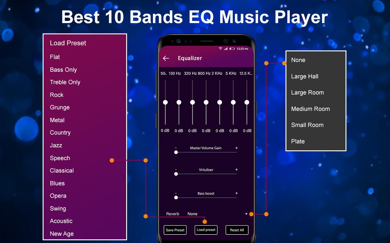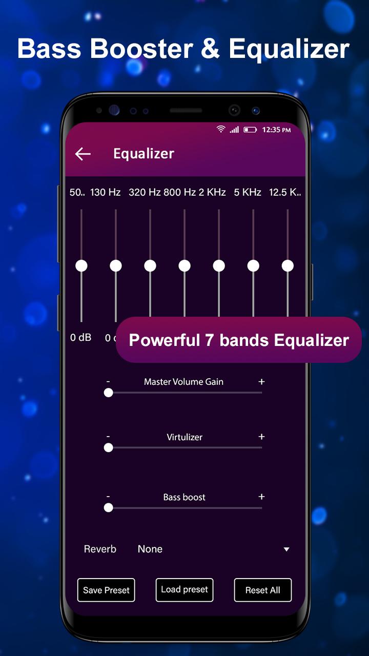 - 7 band powerful equalizer with Virtualizer, Bass Boost and Preset Reverbs