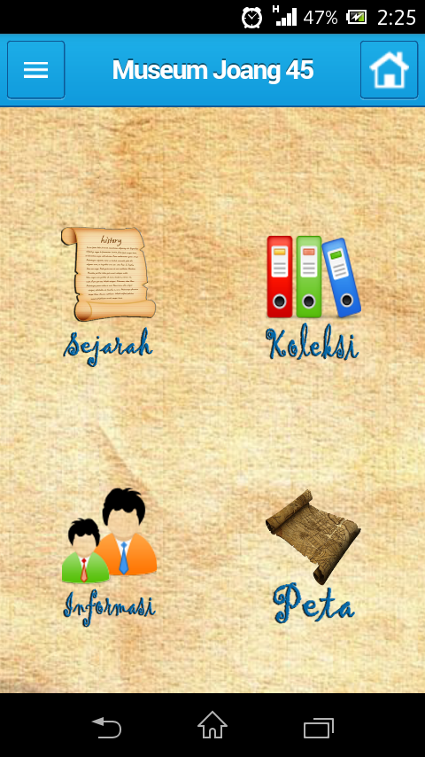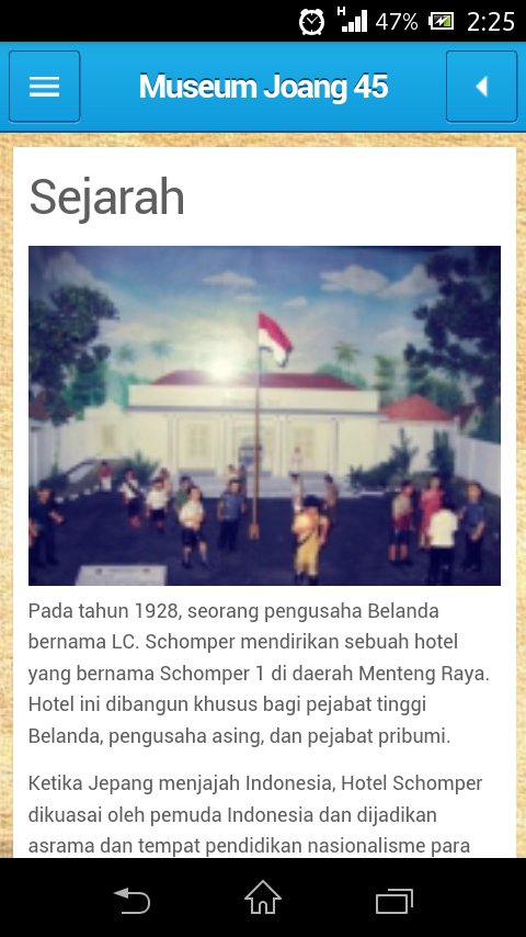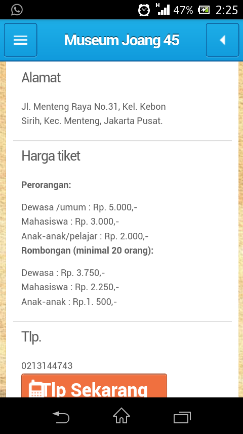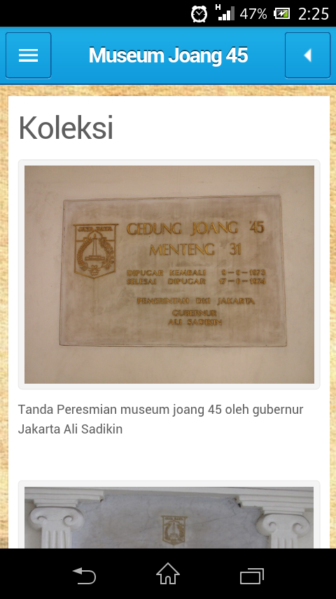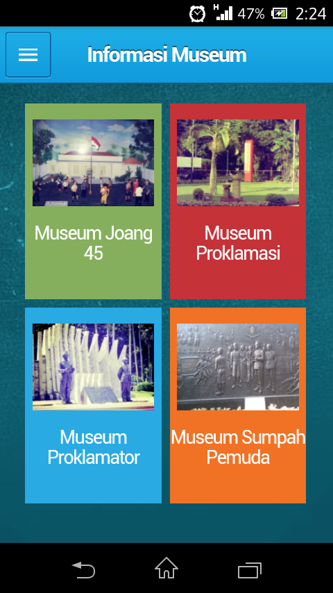 Aplikasi ini memberikan informasi museum yang berada di Jakarta Pusat diantaranya adalah Museum Joang 45, Museum Perumusan Naskah Proklamasi, Museum Sumpah Pemuda dan Tugu Proklamator. informasi yang diberikan yaitu - Sejarah museum - Koleksi dari museum - Alamat museum - No tlp - Jam operasional - Harga tiket - Transportasi angkutan umum yang melewati museum - Peta Lokasi aplikasi ini berjalan tanpa membutuhkan koneksi internet (offline), jadi kamu dapat menjalankan aplikasi ini kapanpun. Tag : informasi museum, museum Joang 45, museum perumusan naskah proklamasi, museum sumpah pemuda, tugu prolamator.