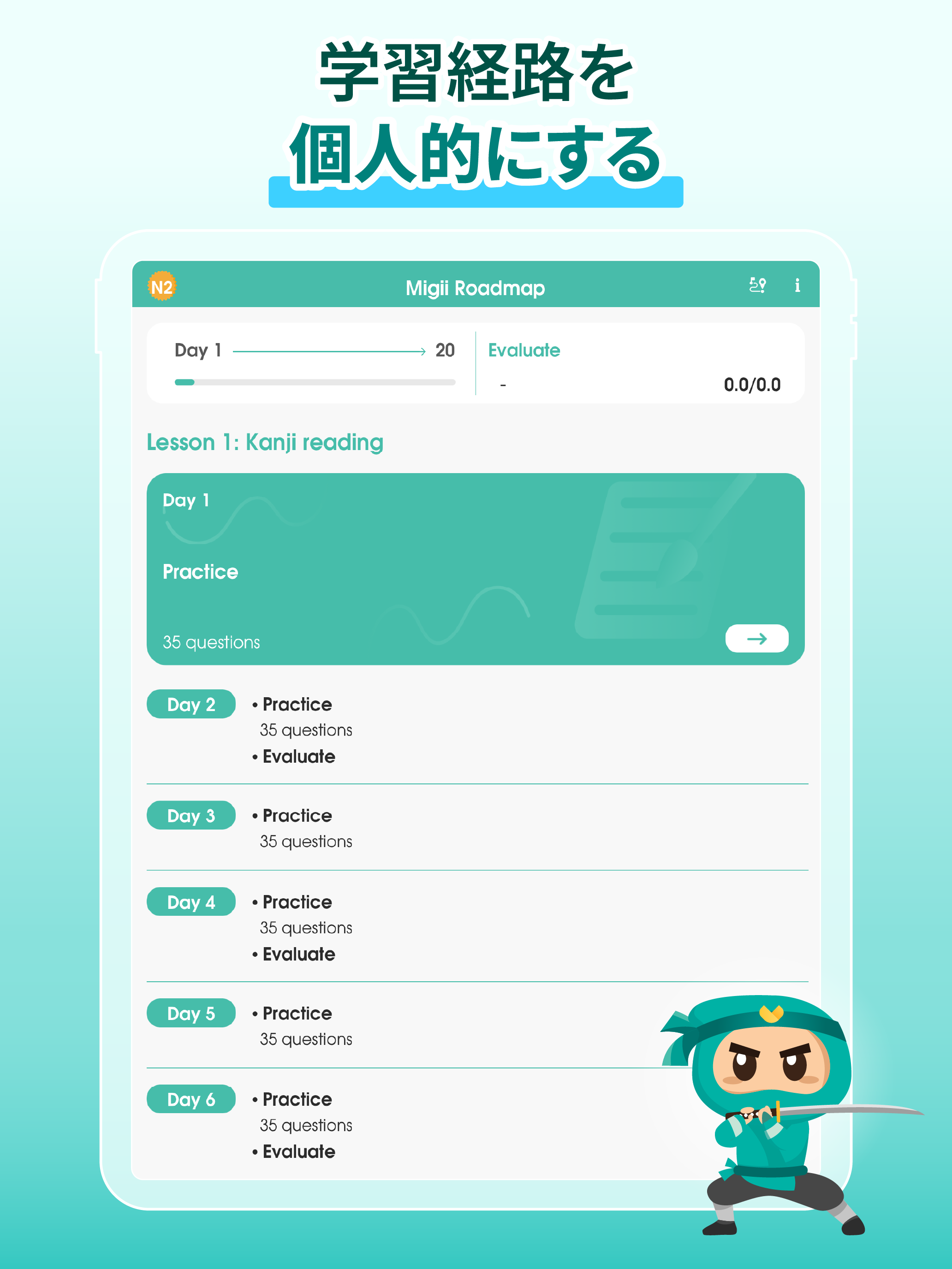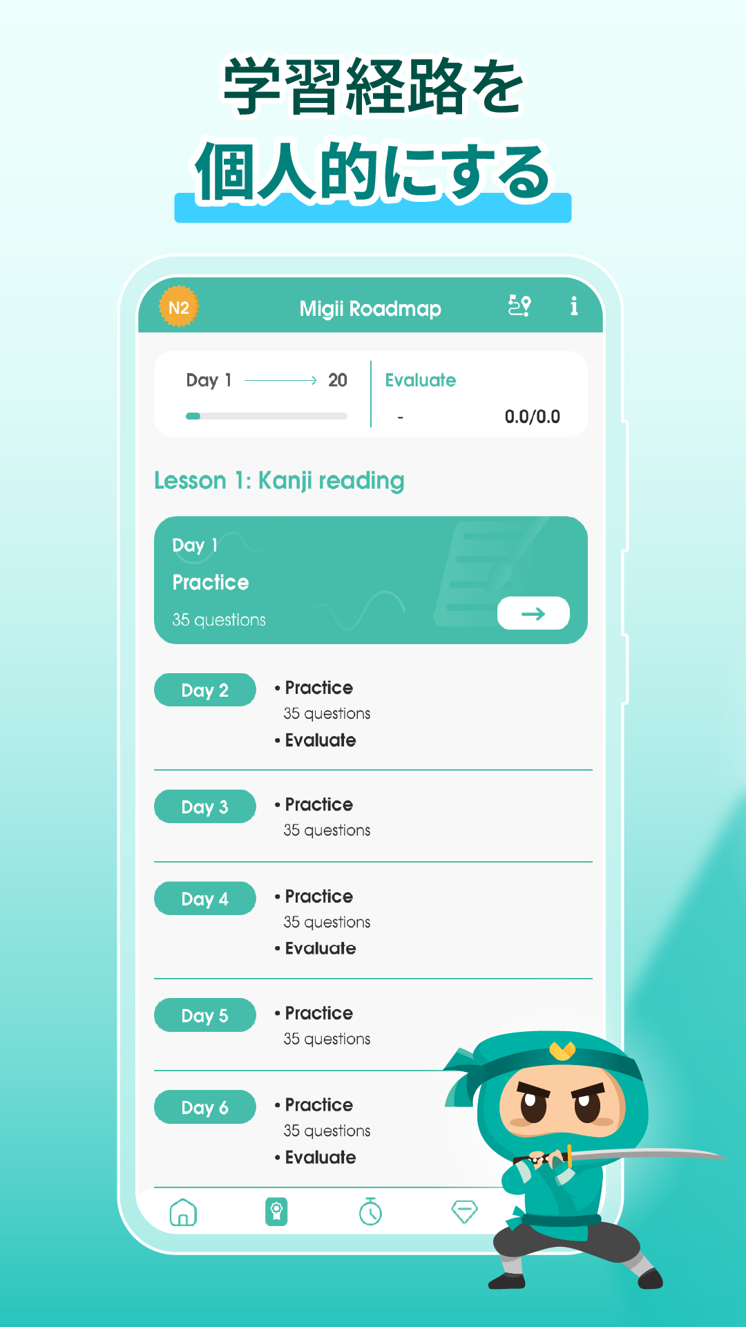 🔥MIgiiのパーソナライズド・ロードマップでJLPTの目標を達成しよう• あなたの得意・不得意に合わせてカスタマイズされた学習ロードマップが作成されます。