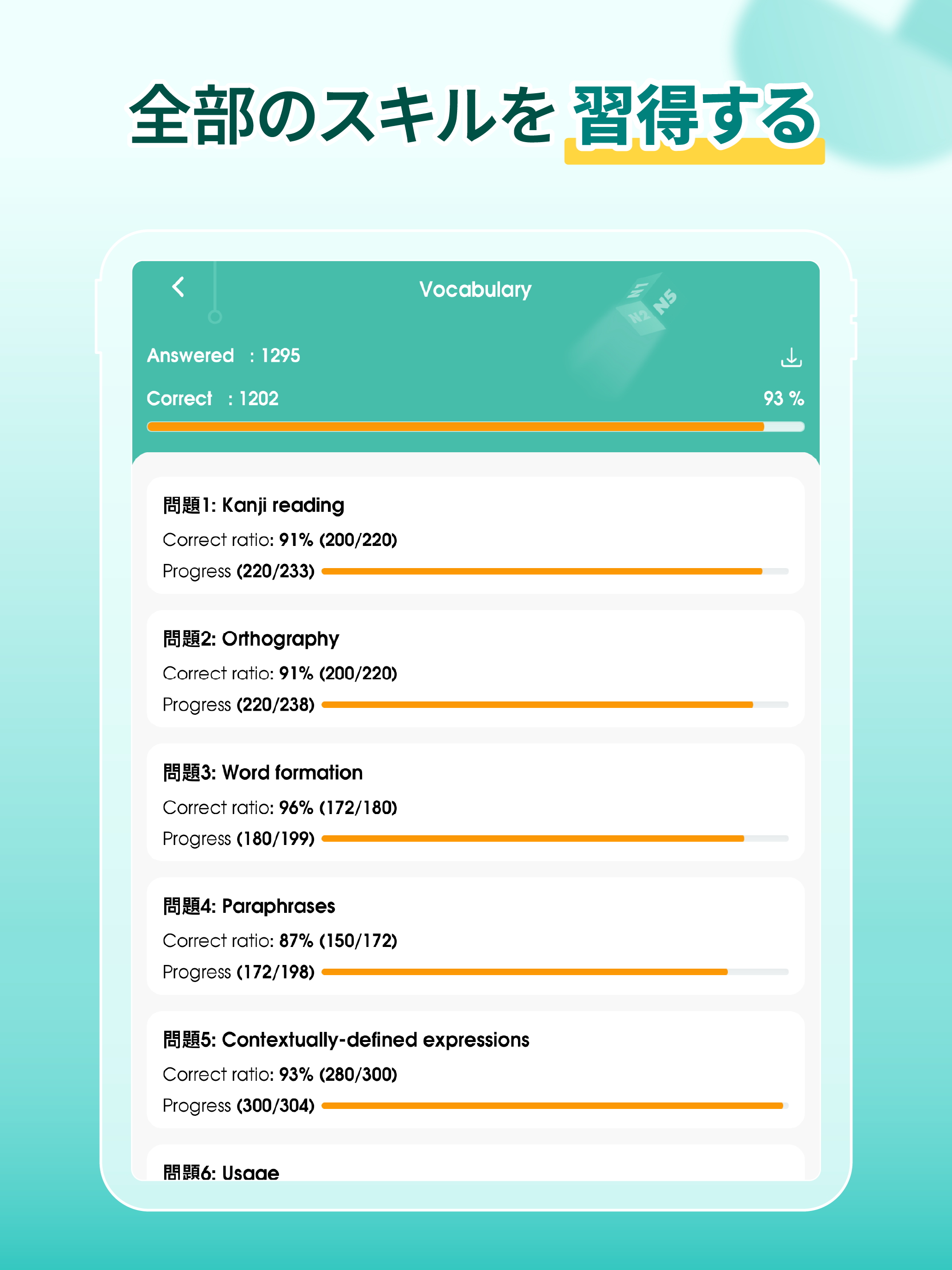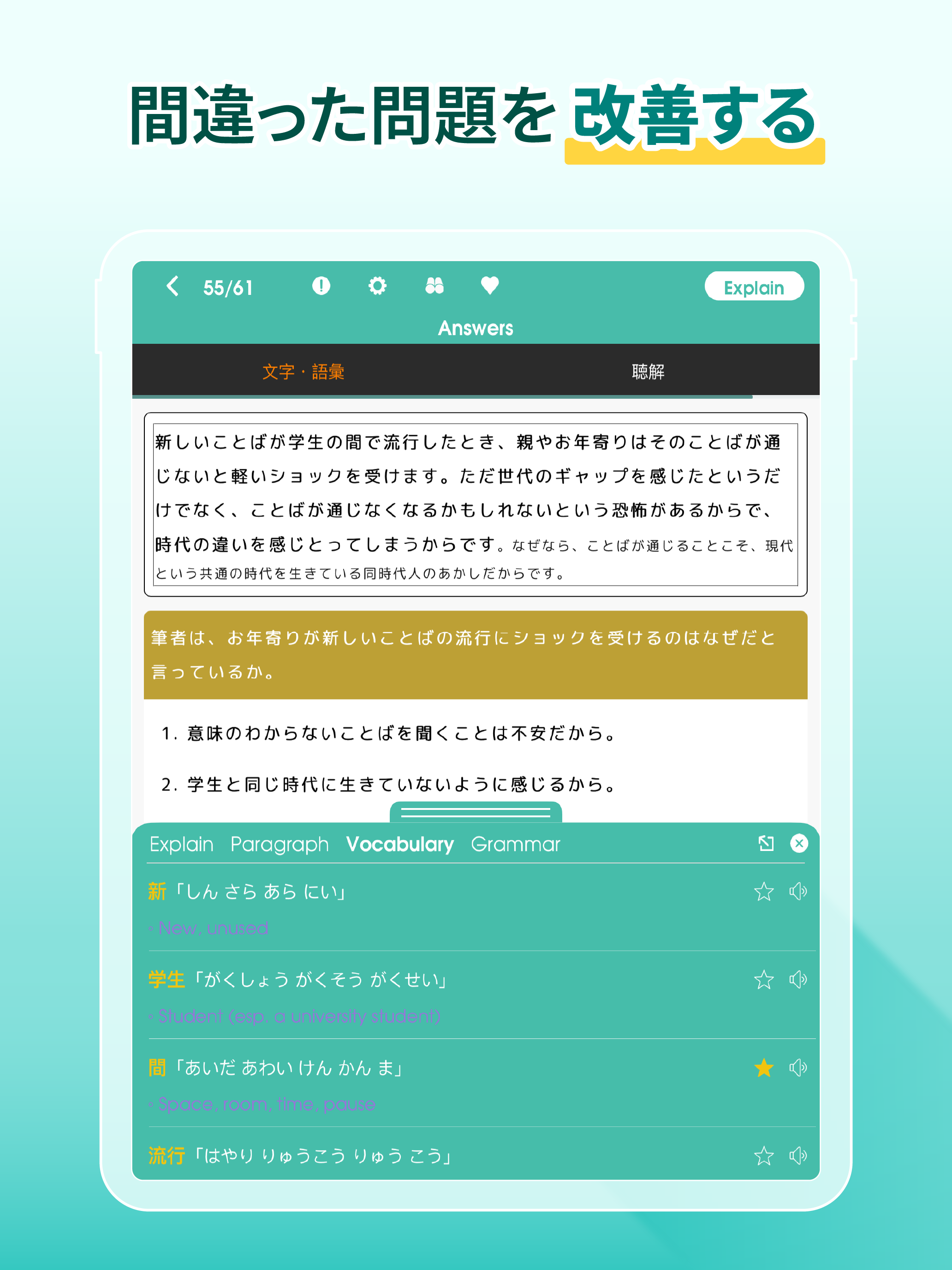 🔥各セクションの苦手分野を集中して克服しよう• JLPT試験と同じ形式で、読解・聴解・文法・語彙の各セクションを体験できます。