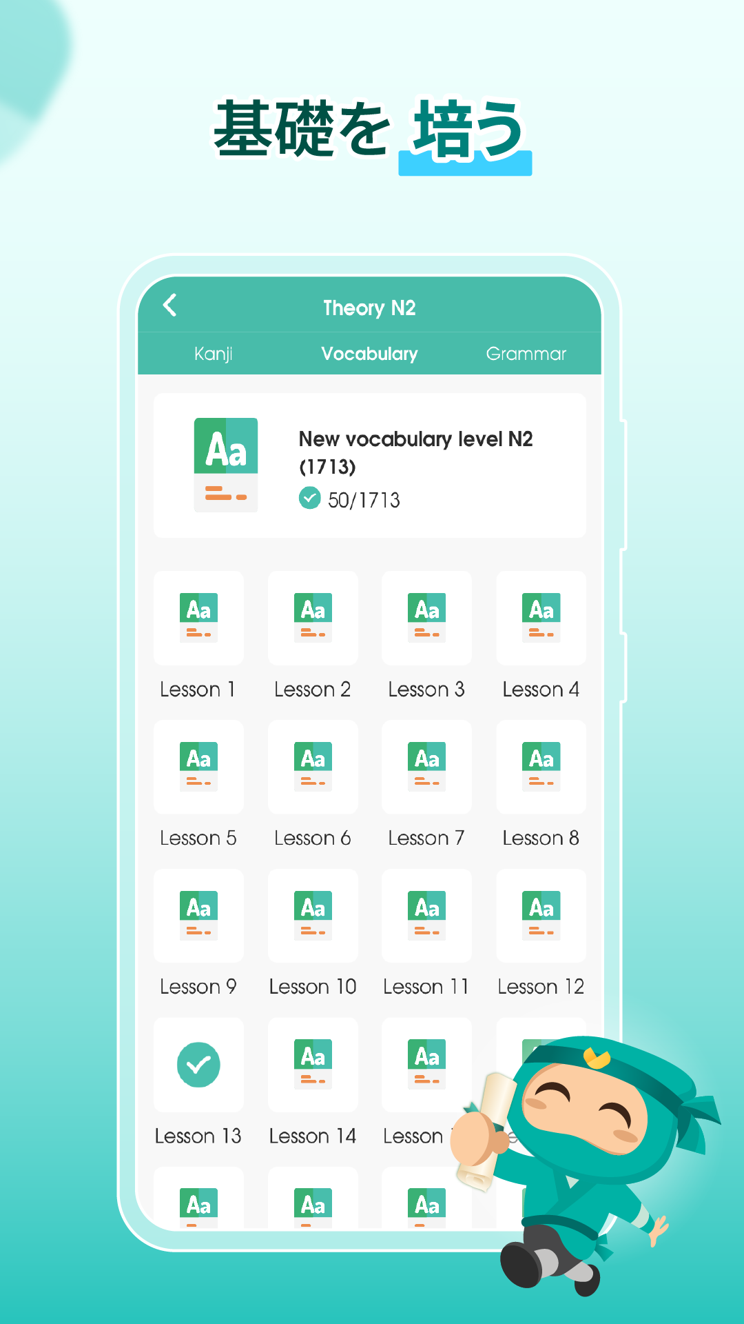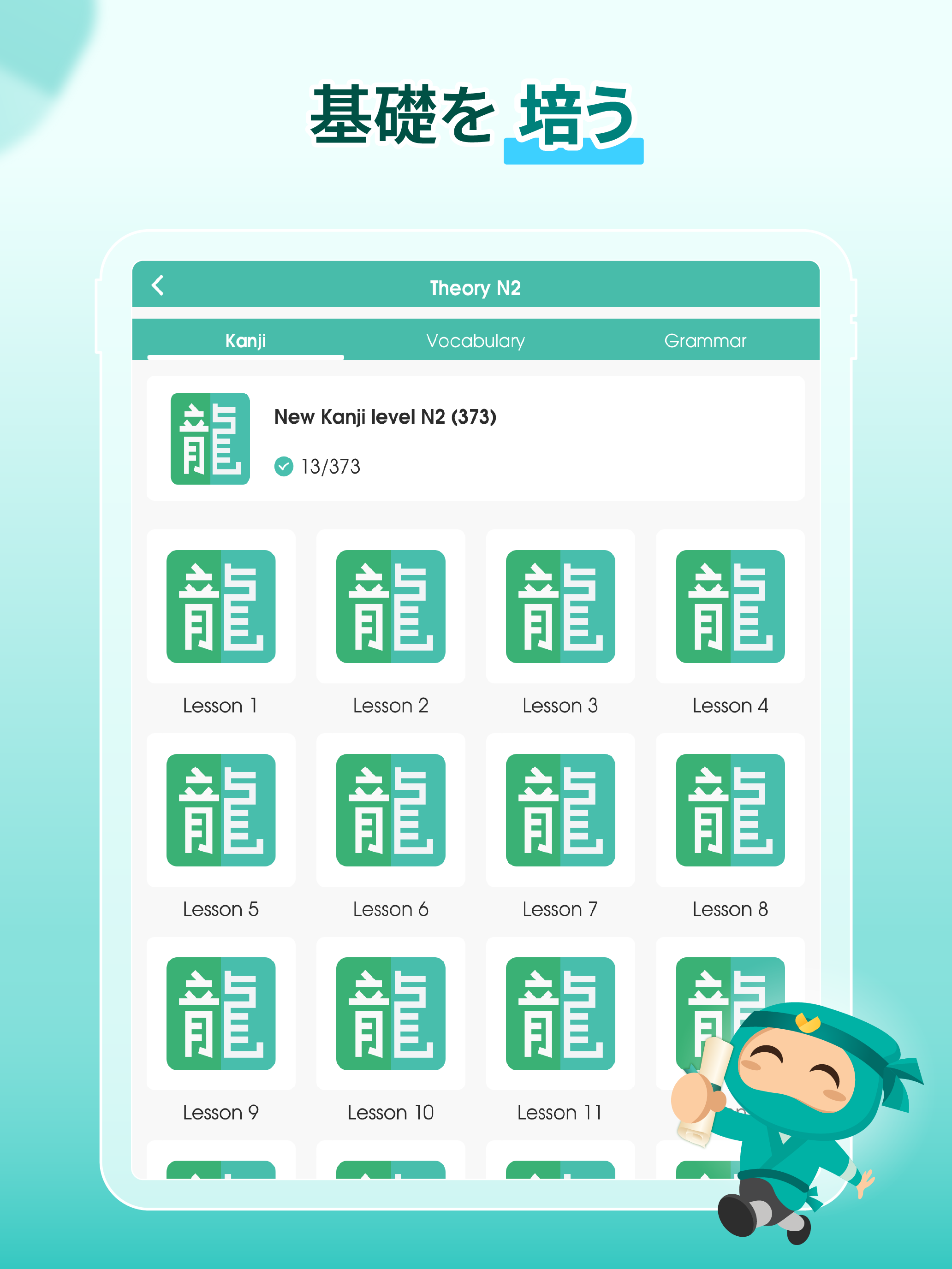 🔥基礎を固めるための充実した理論セクション• N5~N1の語彙・文法・漢字の網羅的なリストが用意されています。
