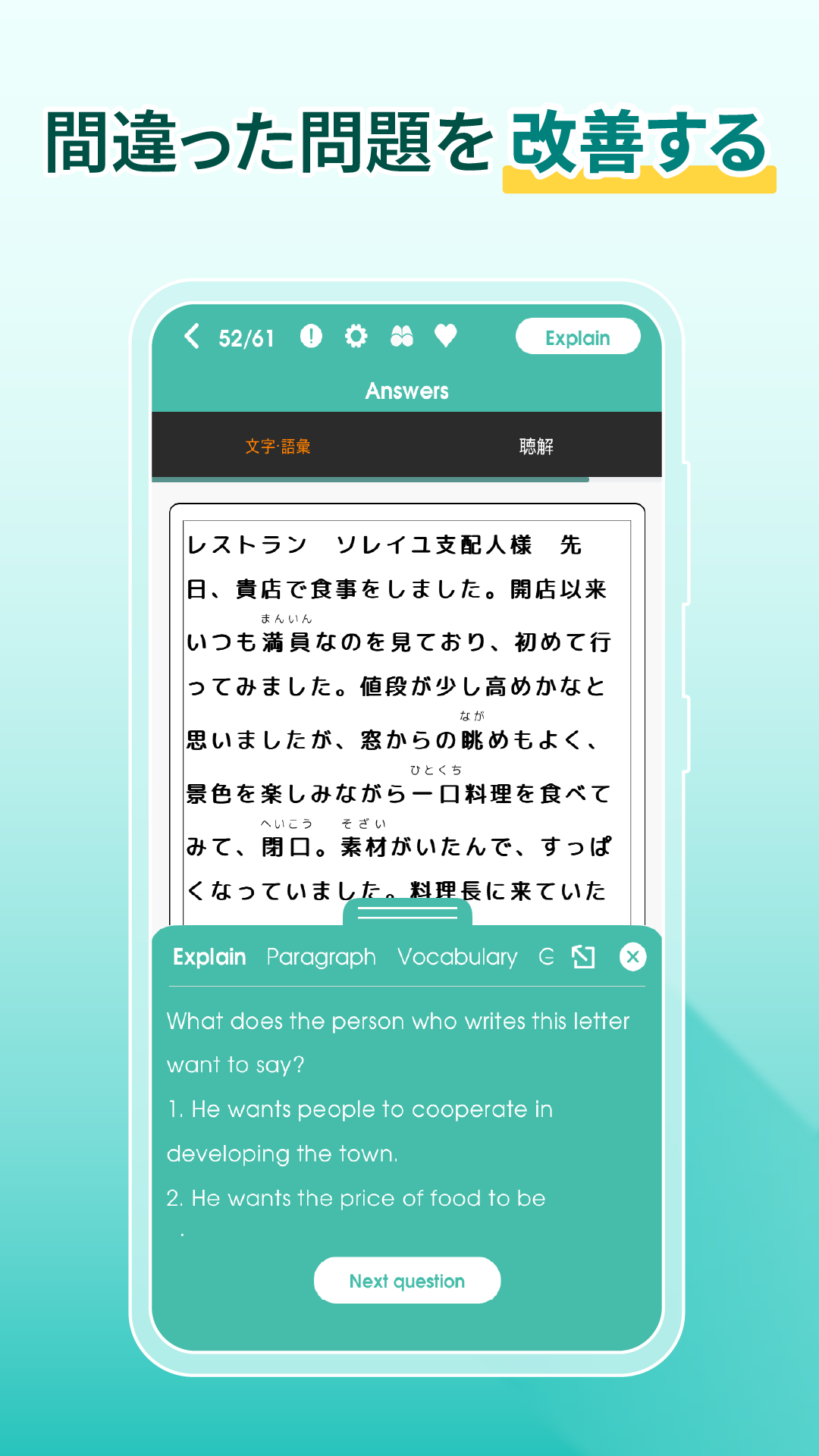 • N5~N1の読解問題には、詳細な解説が付きます。