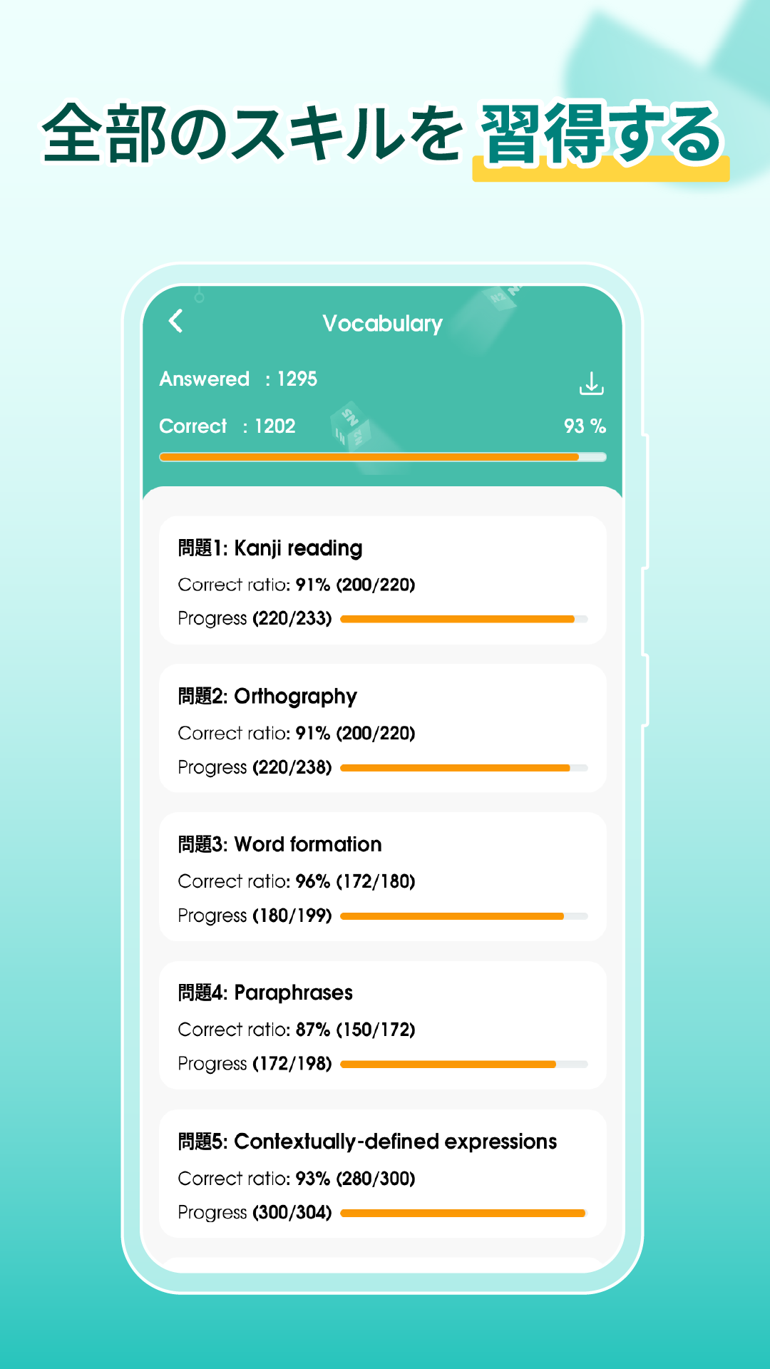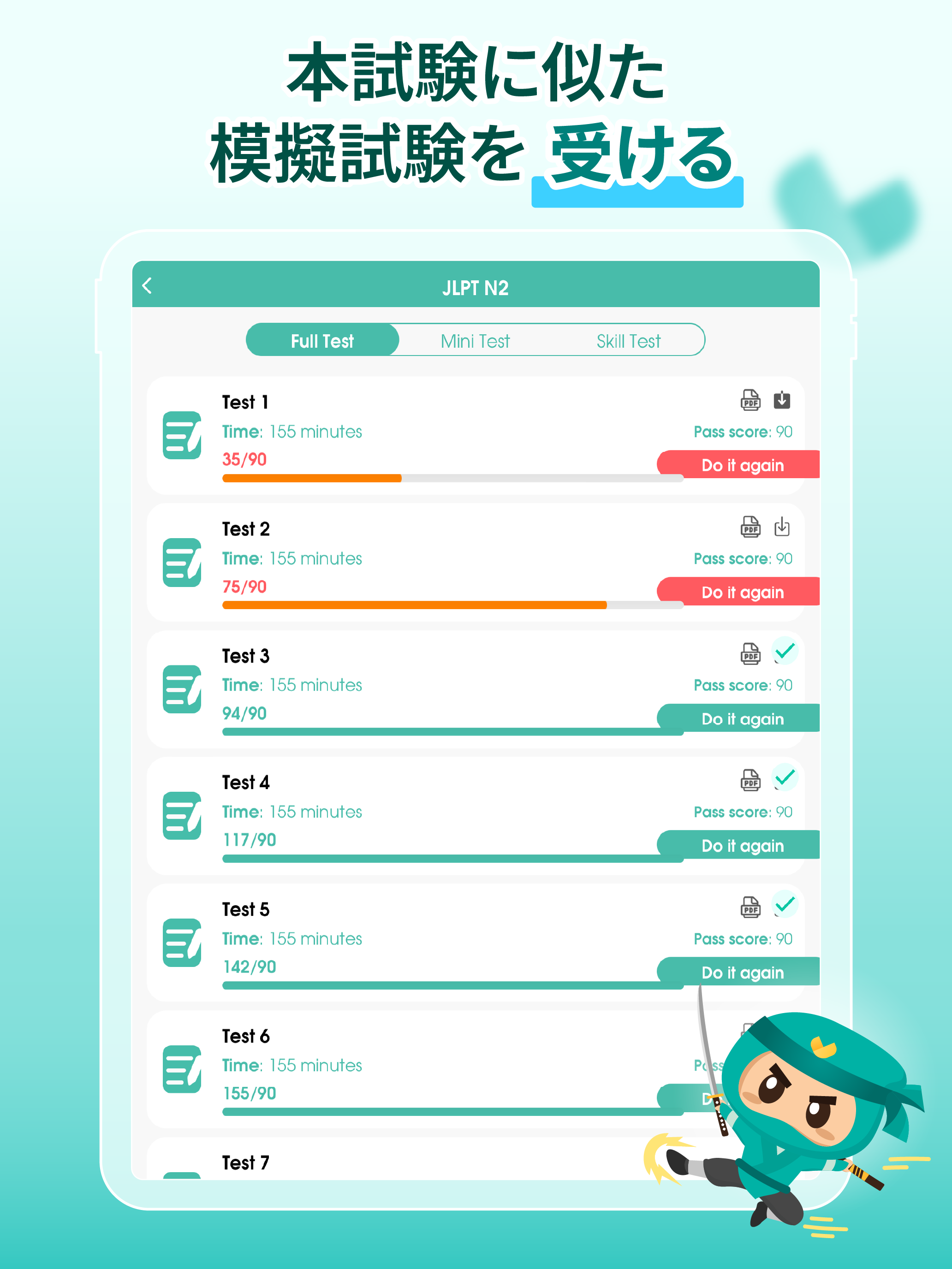 🔥本格的なJLPT模擬試験・スキルテストで実力を試そう• N5~N1に対応した、常に更新される模擬試験で、JLPT試験と同じ時間制限と形式で実力を測れます。