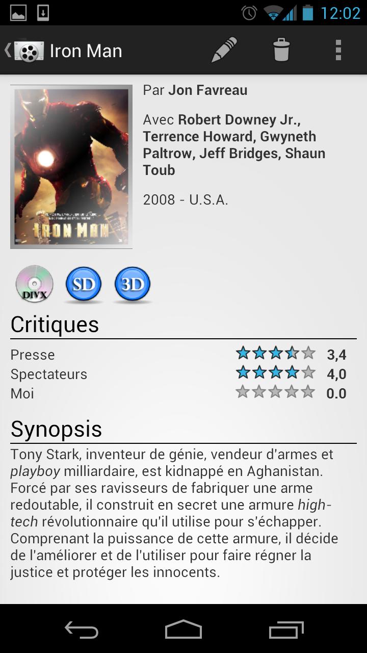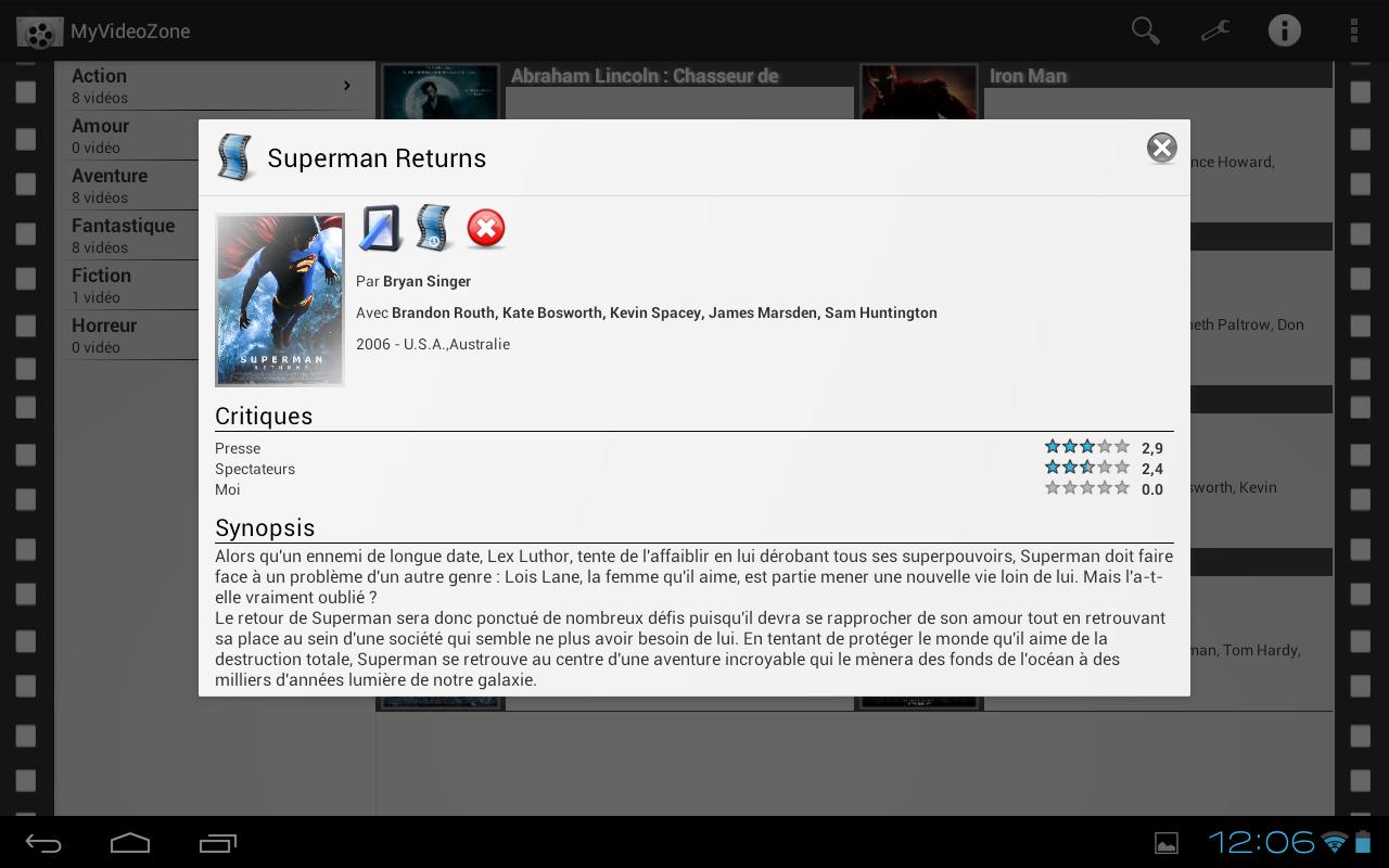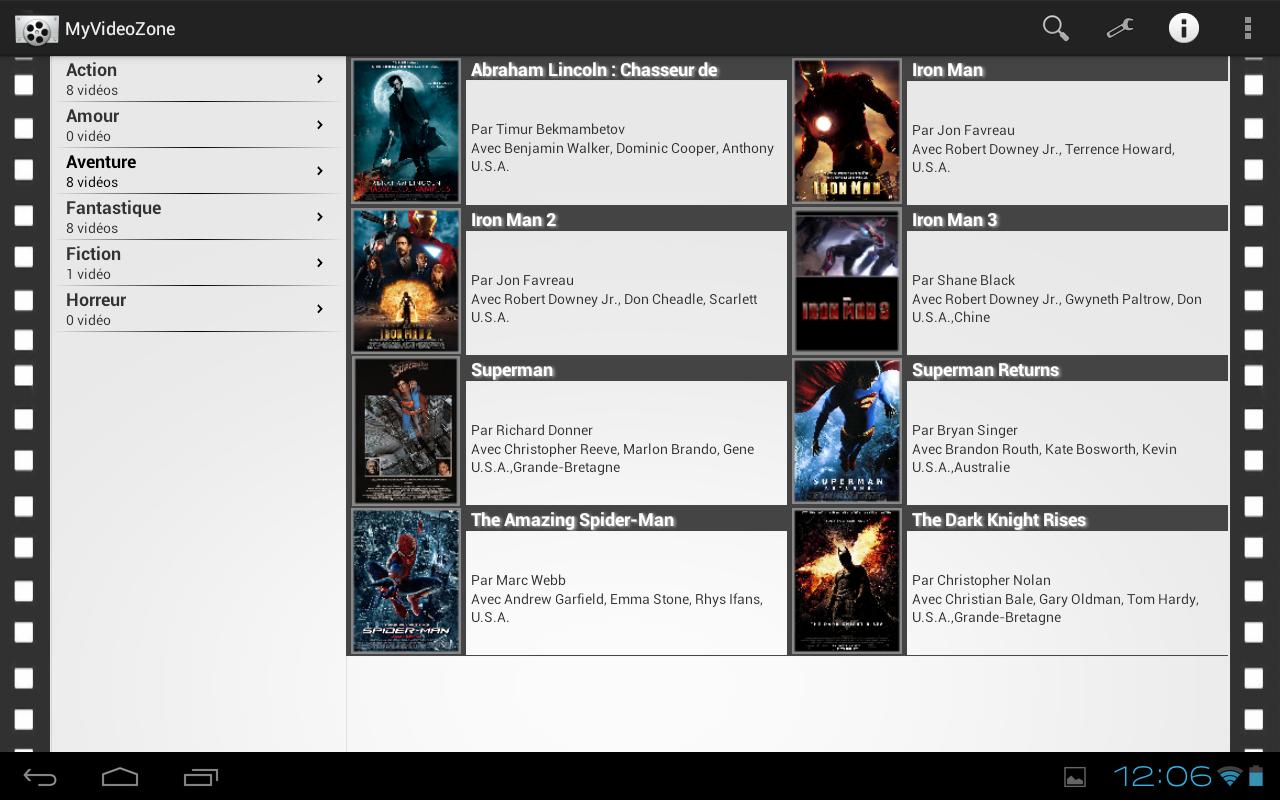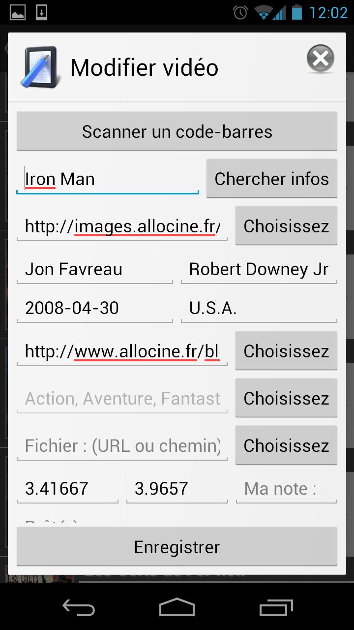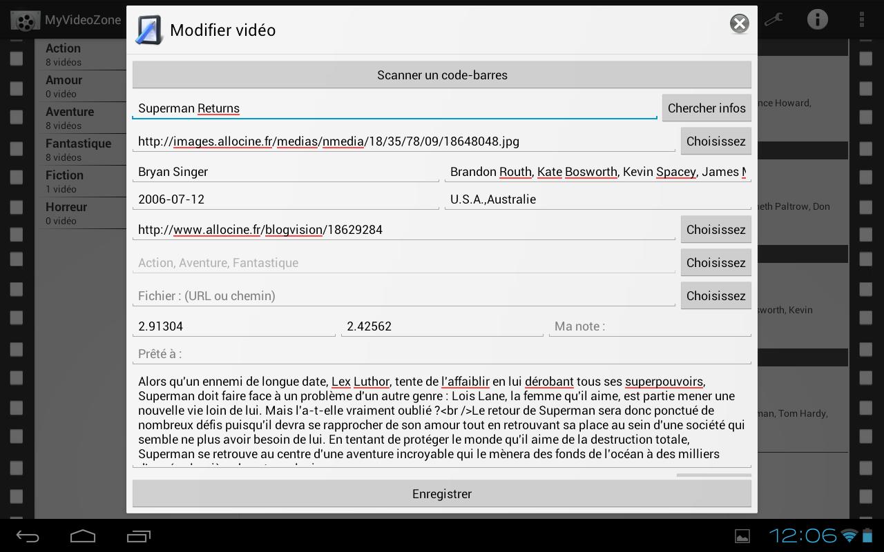 MyVideoZone is an application that will allow you to manage your videos/movies library easily. Friends arrive, DVD promises an evening? We'll have them read the whole list of your DVDs, Blu-Ray, Div-X and other media while hearing them bicker with each statement as ... Wow this is now ancient history! Centralize all the titles of your movies on MyVideoZone and friends can choose by themselves the movie of their choice on your smartphone or tablet while you prepare the popcorn and drinks! - Find the details of a film and its trailer simply by entering its title with the database Screenrush! - Find the notes of the public, the press and add your own notes to the movies! - Your video library consists of DVDs, Blu-ray movies but some are also in your PC or disk media? No more searching, you can identify their location on the film by choosing a specific icon on the media of your movie! - Create your own categories to organize your library as you wish. - Your films are in original? in VF? in HD? in SD? Icons are there to best adapt to your movies and quality. - You took a movie to a friend? no worries you can specify in the video plug to prevent your friend that he is not available! - No desire to search your film? Import your movie from SD card or from a shared folder - You have a lot of DVD, Blu-Ray ? Just scan the bar code with scanner and MyVideoZone search informations for you ! - No need to type two times the information on smartphone and tablet! The function of import and export are here to make life easier :) - A film is already on your smartphone or tablet? Combine the film has your so you can start reading from the application!