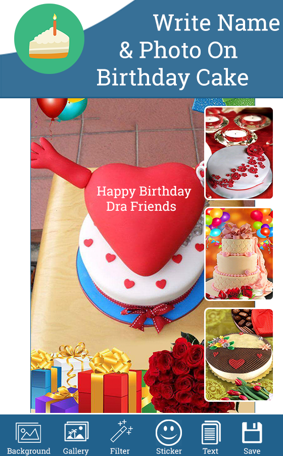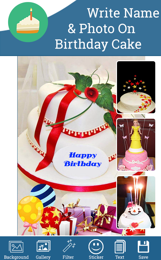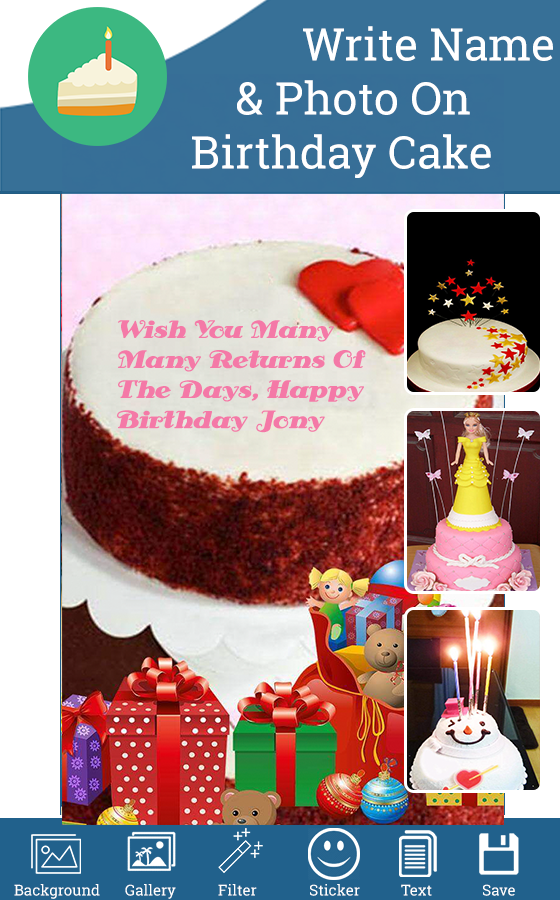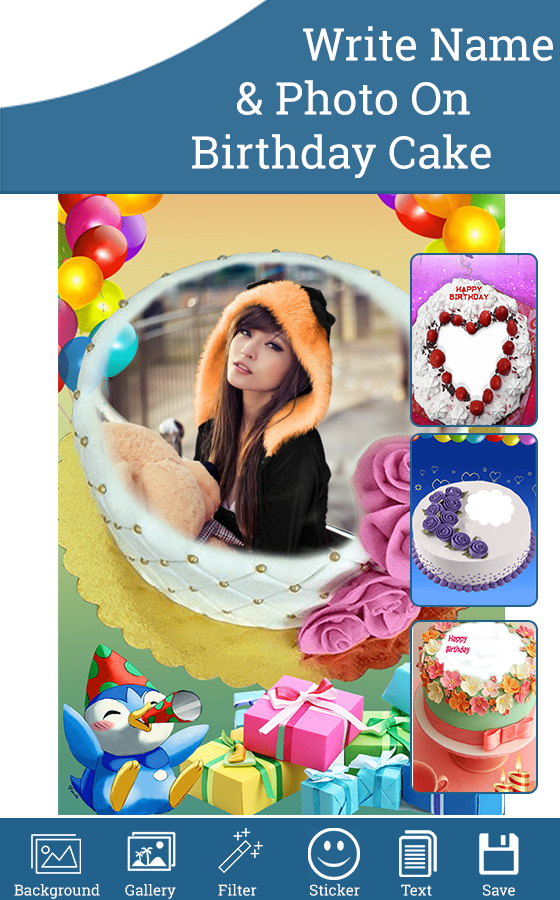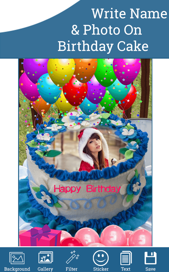 Photo On Birthday Cake You can create beautiful birthday cake and photo frames using our cake with name and photo app. Surprise your Friends and family members with customized birthday cake with photos and text. Let’s start Decorate Cakes with your friends name on the cake and decorates by various fonts, colors and style.