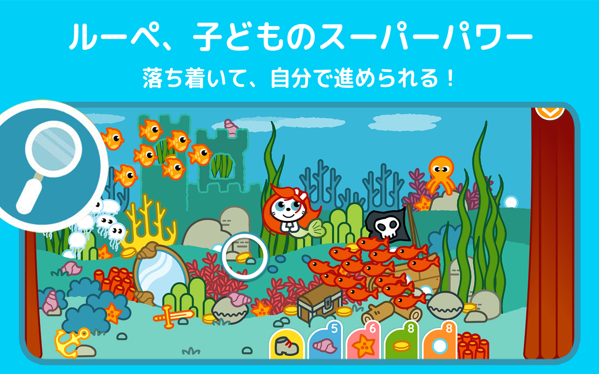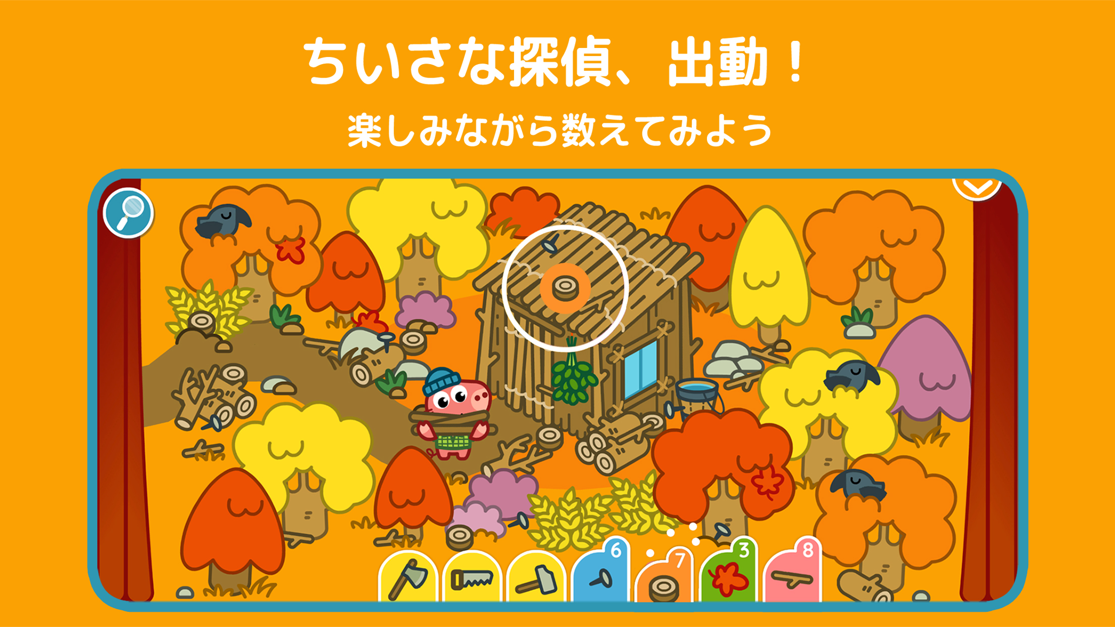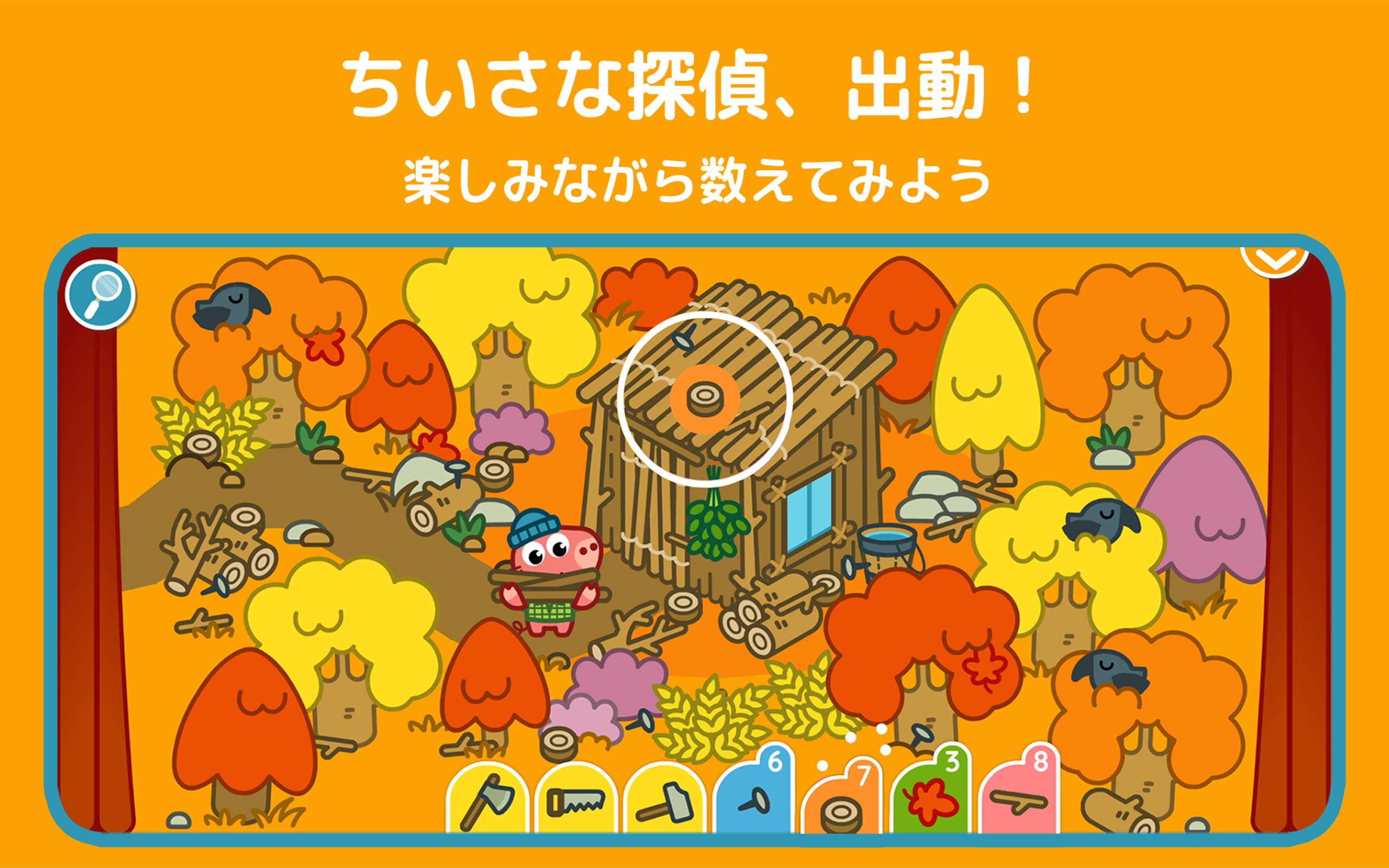 指先で画面を探検してみましょう。岩の後ろ、テーブルの下、木の上… 開けて、持ち上げて、どかして…隠し場所がたくさん!見つからないときは、« ルーペ »を使ってヒント!3–5 歳向けに設計された、シンプルで意欲を引き出し、安心して遊べるゲームプレイです。