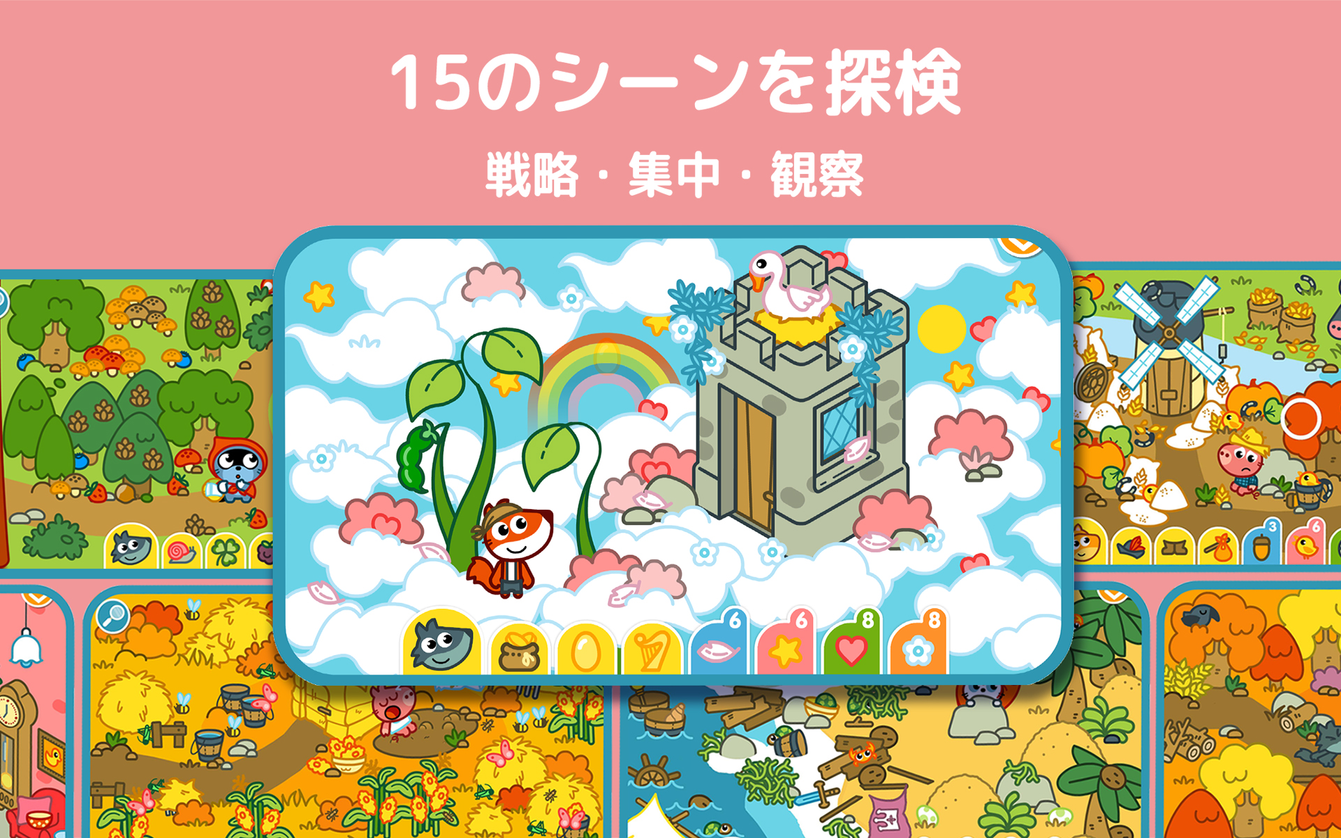 パンゴは教育アプリを 20 作以上展開し、世界累計 2,000 万ダウンロード。ご家庭にとって安心の選択です。Hide and Seek Fairytales もそのこだわりを受け継ぎ、3 歳から観察力・注意力・論理力を育む、わかりやすく知的でやさしいゲームです。