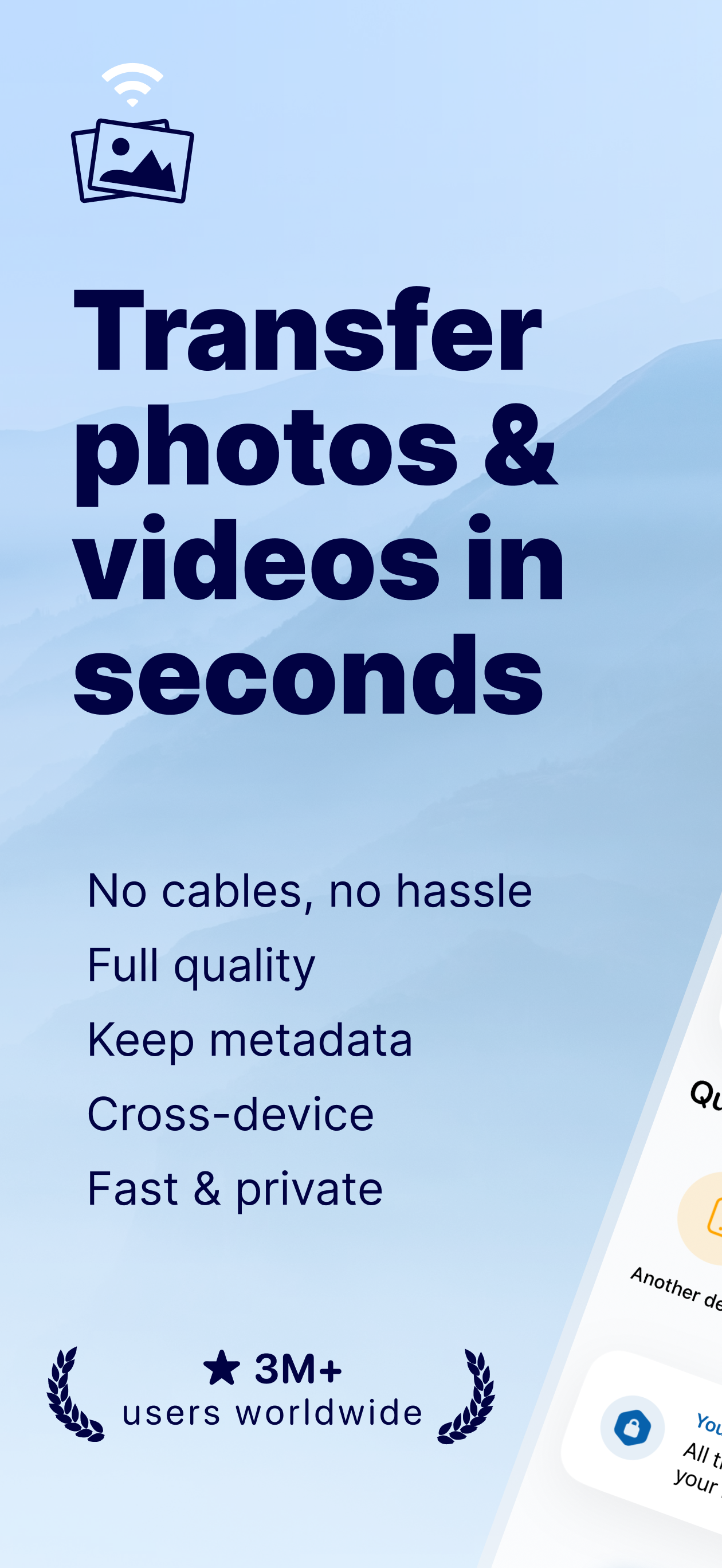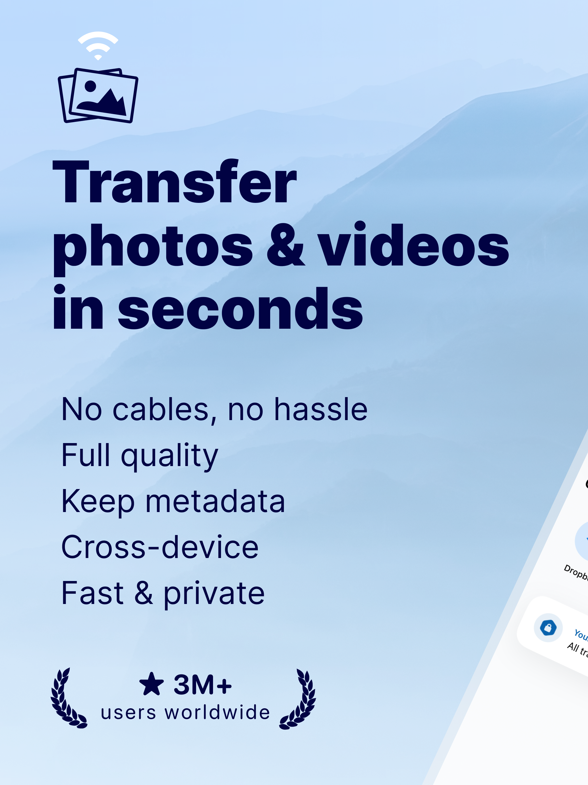 写真転送アプリを使用すると、WiFi 転送を介して写真、写真、画像、ビデオを簡単に送信および共有できます。写真やビデオをすばやく転送する前にファイルのバックアップを作成し、ファイルを Android から iOS、iPad、またはコンピューターに、またはその逆に移動します。🥇 3,100 万回以上のダウンロード、Google Play での 7,000 件以上のレビュー、ユーザーの満足度、数百万回の写真転送により、このアプリはあなたの Android デバイスに不可欠なツールです。