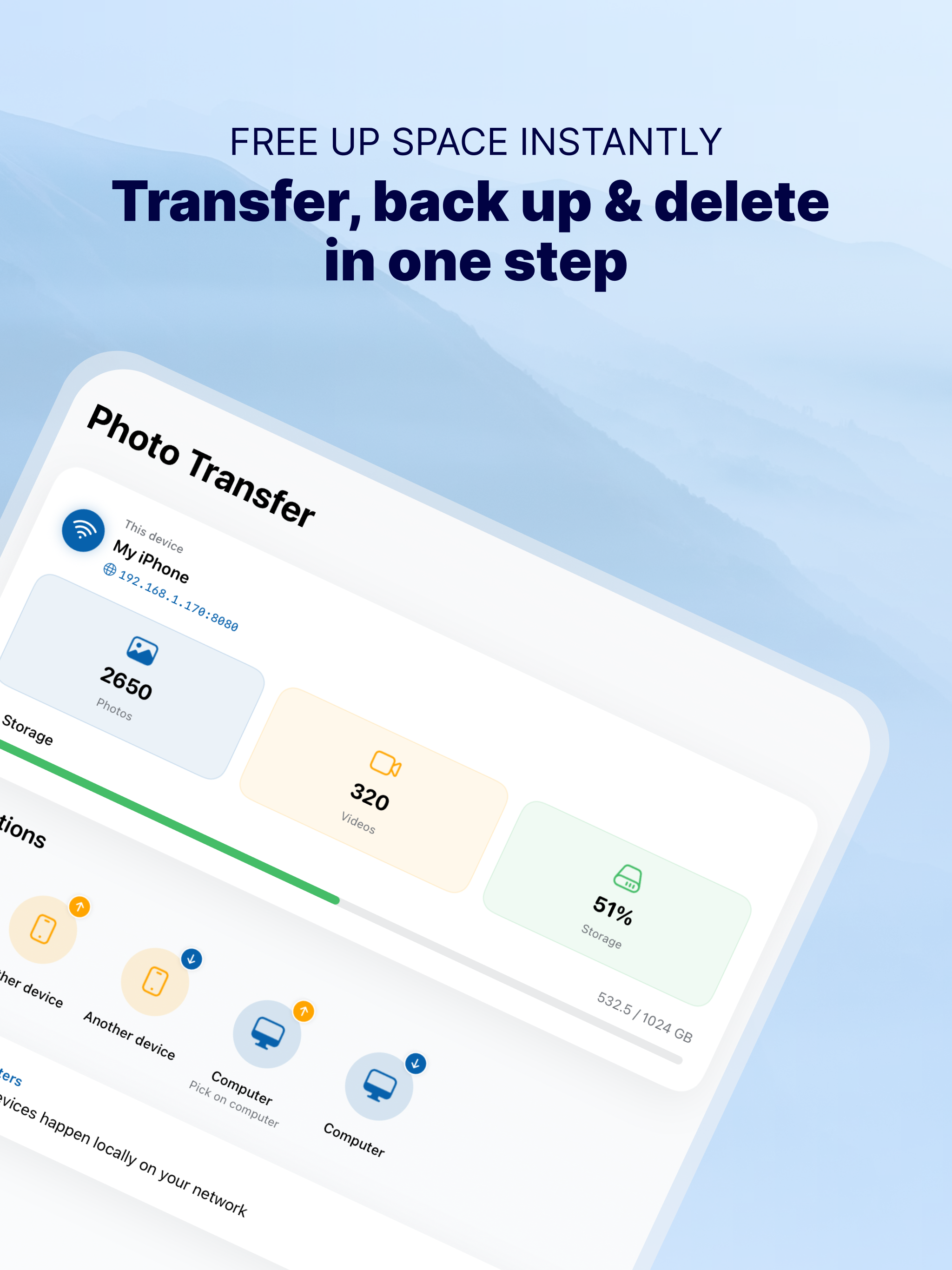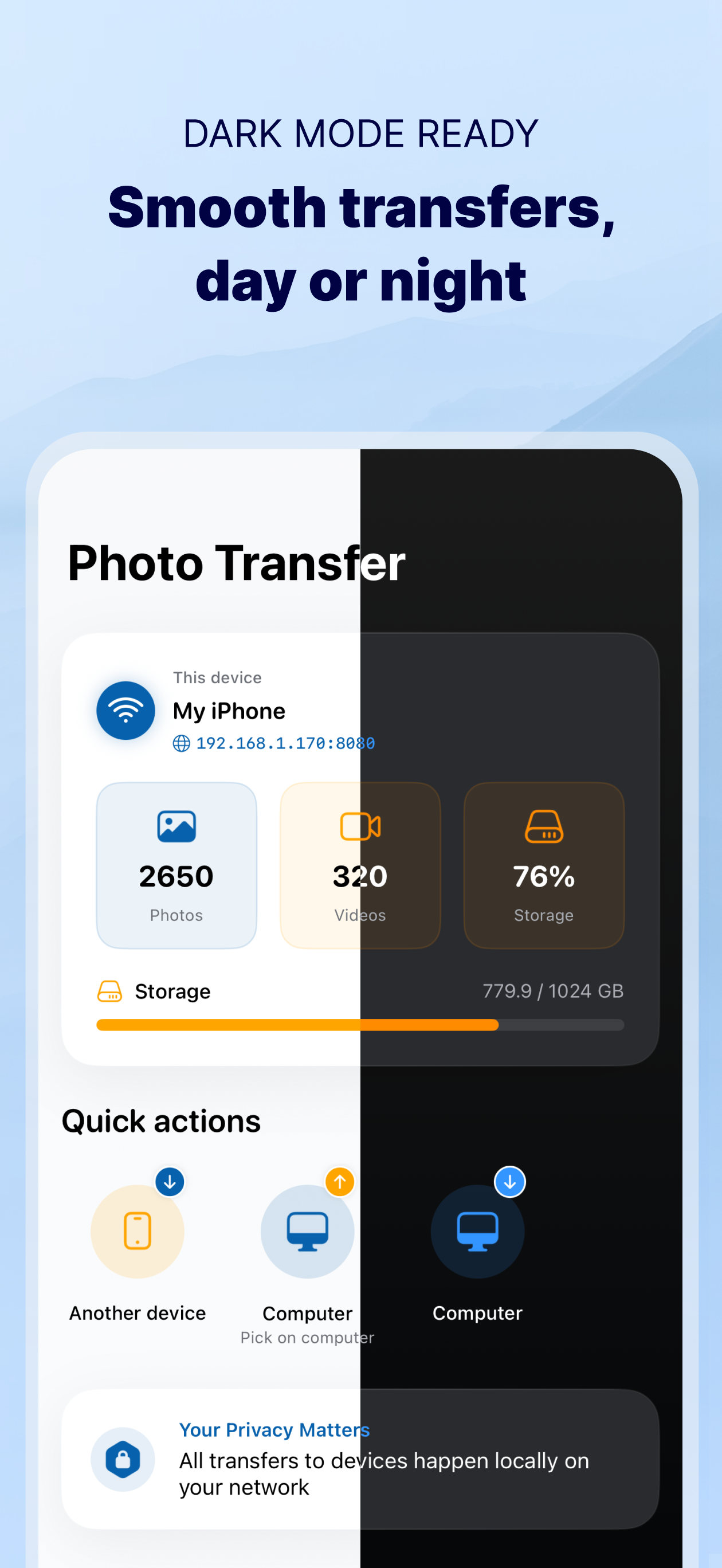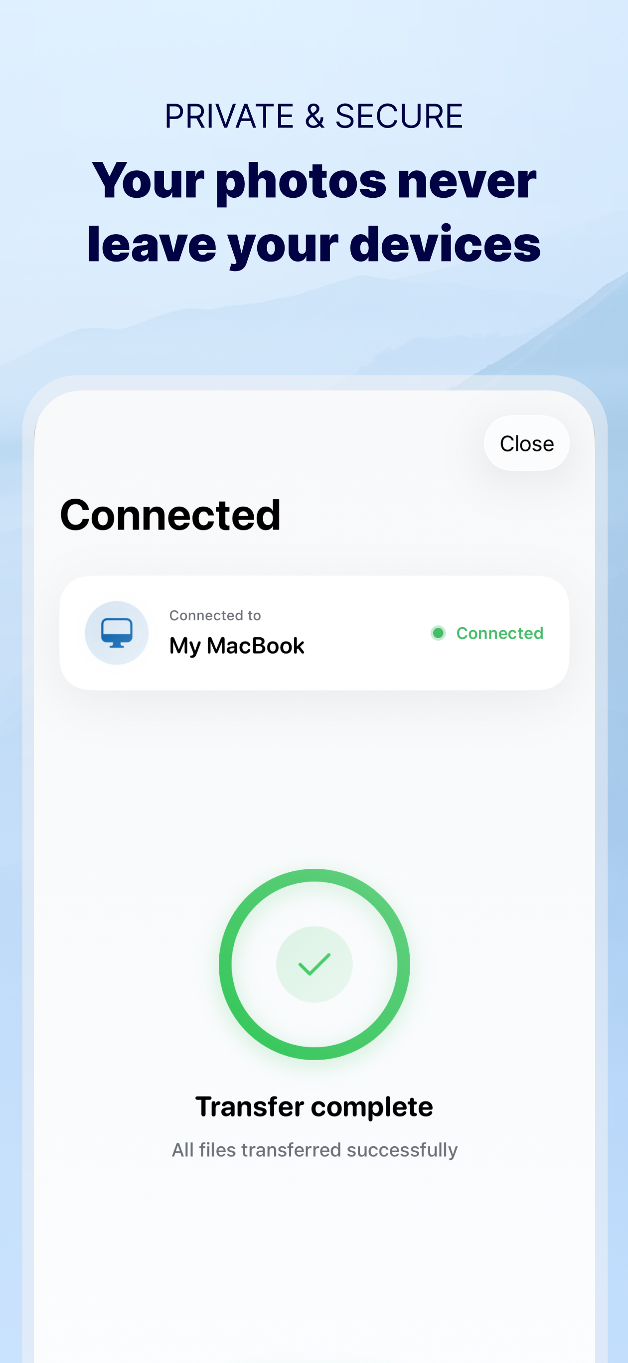 · ローカル WiFi ネットワークを使用して、写真やビデオをデバイスからデバイスに直接転送します。それらは外部サーバーに保存されず、ローカル WiFi ネットワークから離れることもないので、写真は安全です!