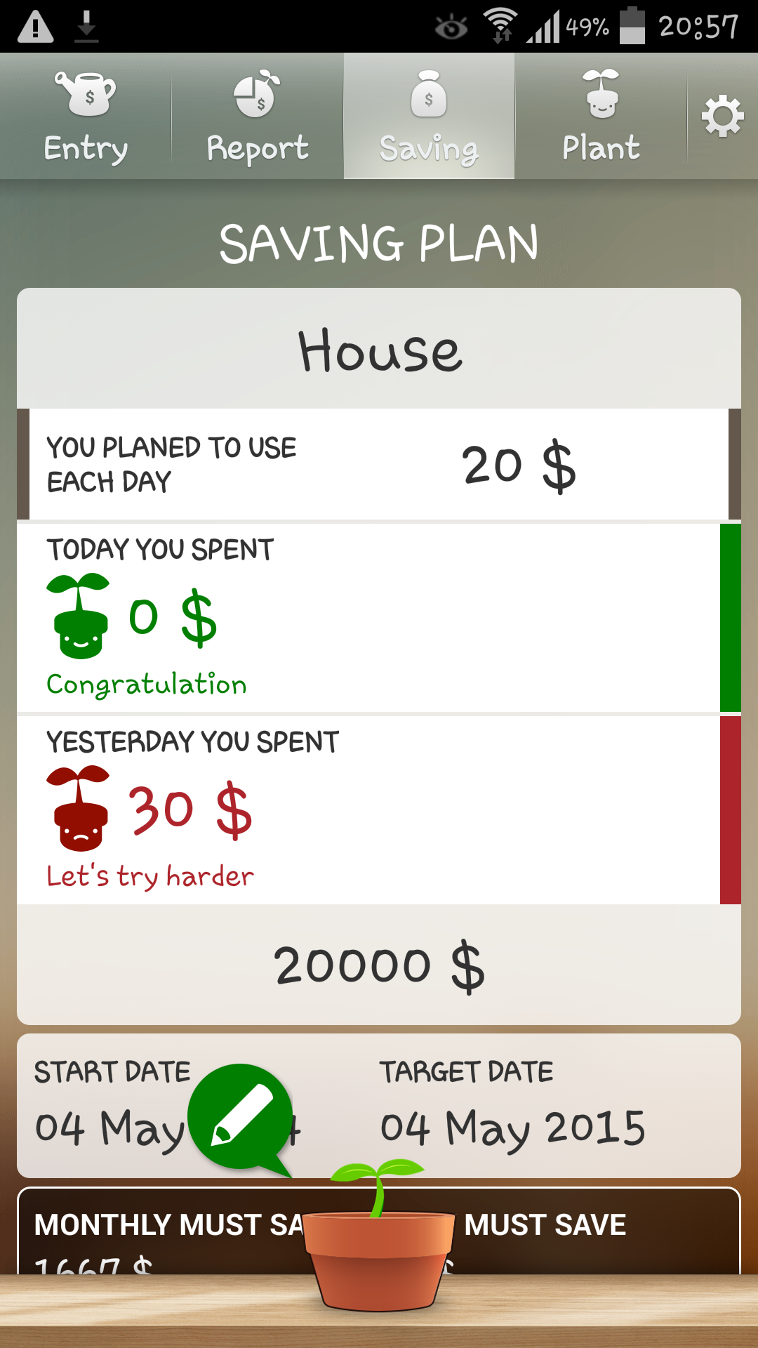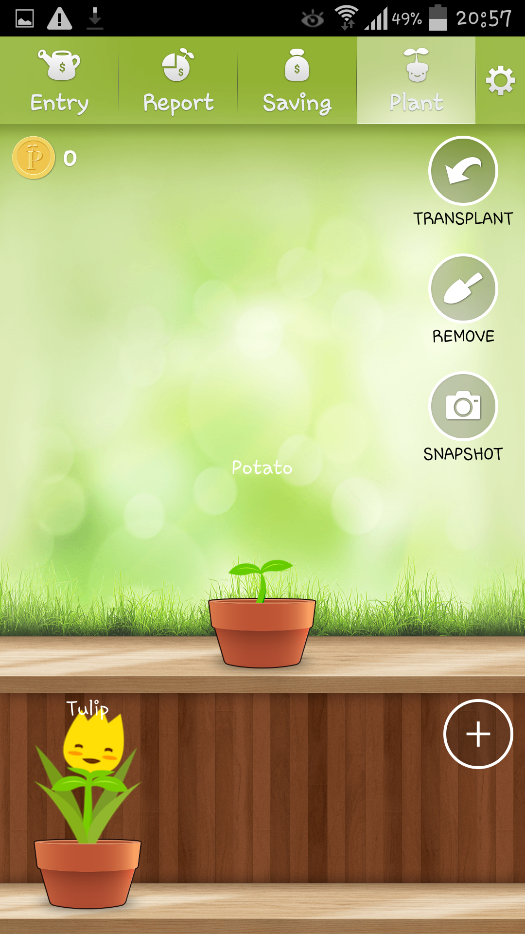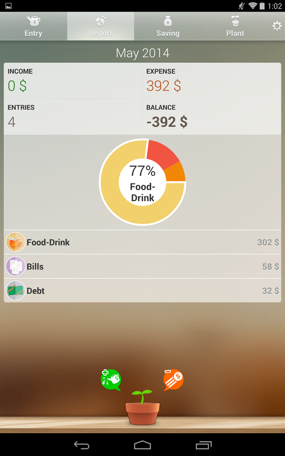 Plant Money is a personal finance application that make recording income/expense easy and fun. We want to record income/expense so we'll know how we spent but the problem is we can't do it continuously. With Plant Money we change the way we record to make it fun. Like growing a plant, you need to care it everyday. And when it fully grow up you can sell it to take the profit and grow another one. But if you forget, it'll dry out and die. - Easy to record, easy to read. - Current and history monthly reports - Saving target - Offline backup - Reminder - Change custom font - Change background - Password lock