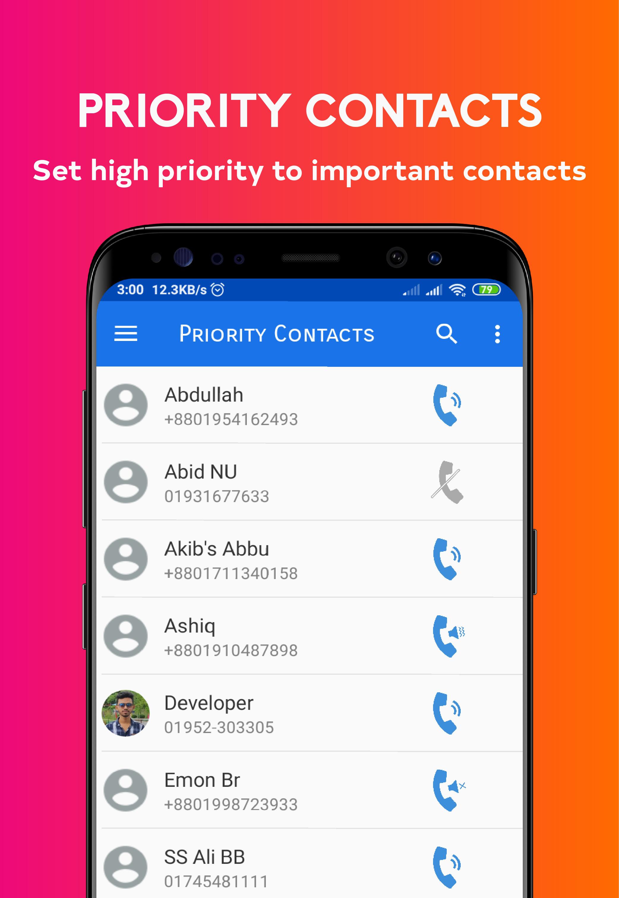 Priority contacts is a contacts manager app that give you opportunity to set contact priority. You can do contact management by providing your contact priority. There are three Priority level. You can set your important contact or favorite contact to high priority because they can be always ringer mode even in silent, high priority calls will ring. Medium priority contact always play vibration, even they are in sound mode or silent mode. Disturbed contact or Sim company number you can keep in Low priority. Those disturbing calls won't be block but it will ignoring by mute call and silent.