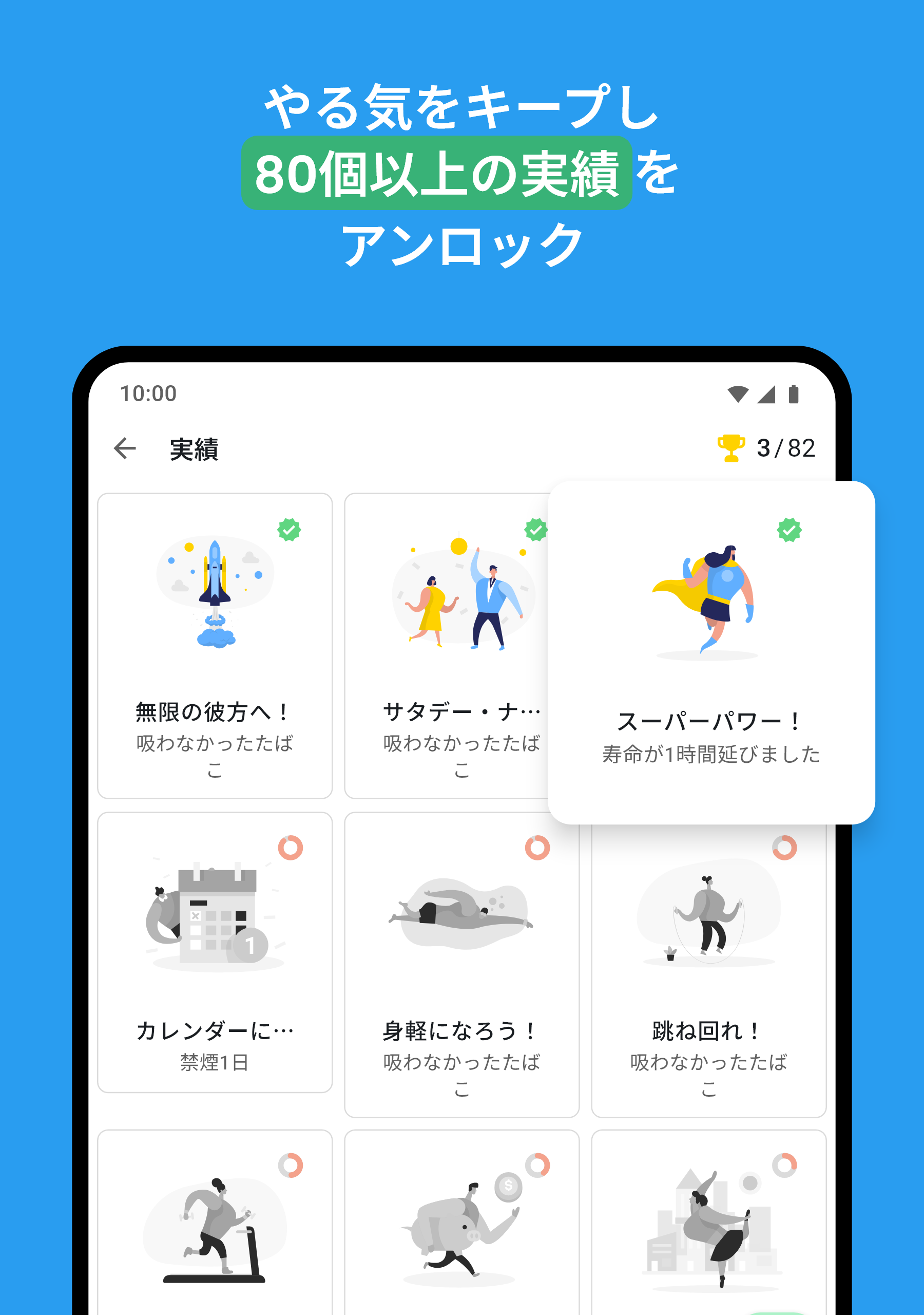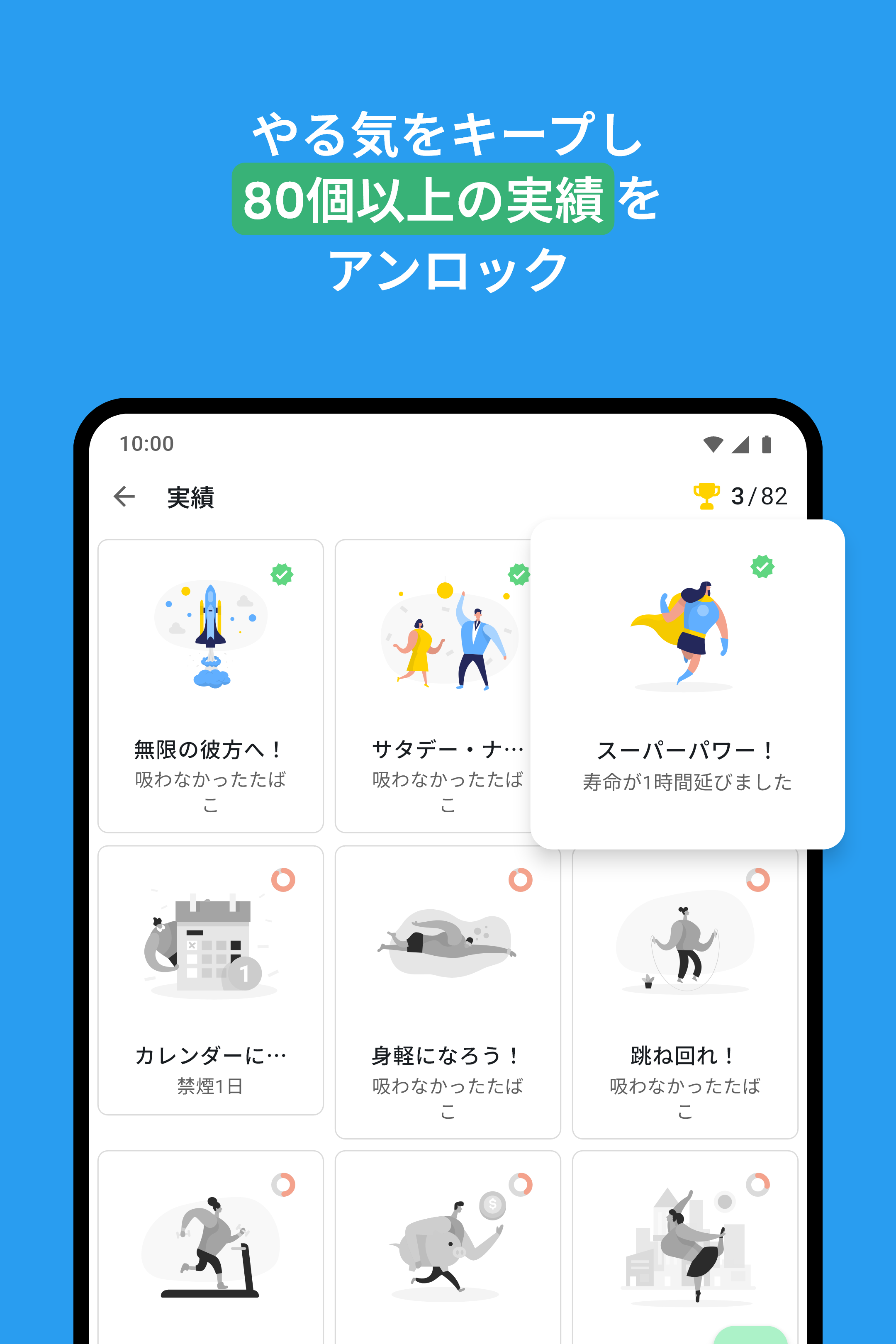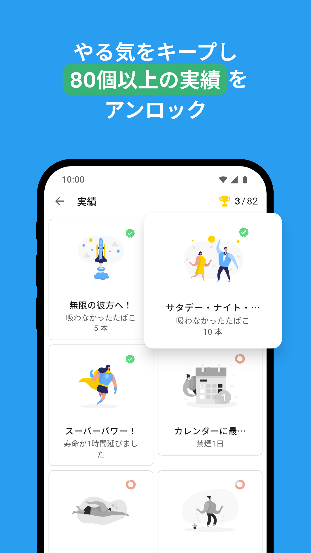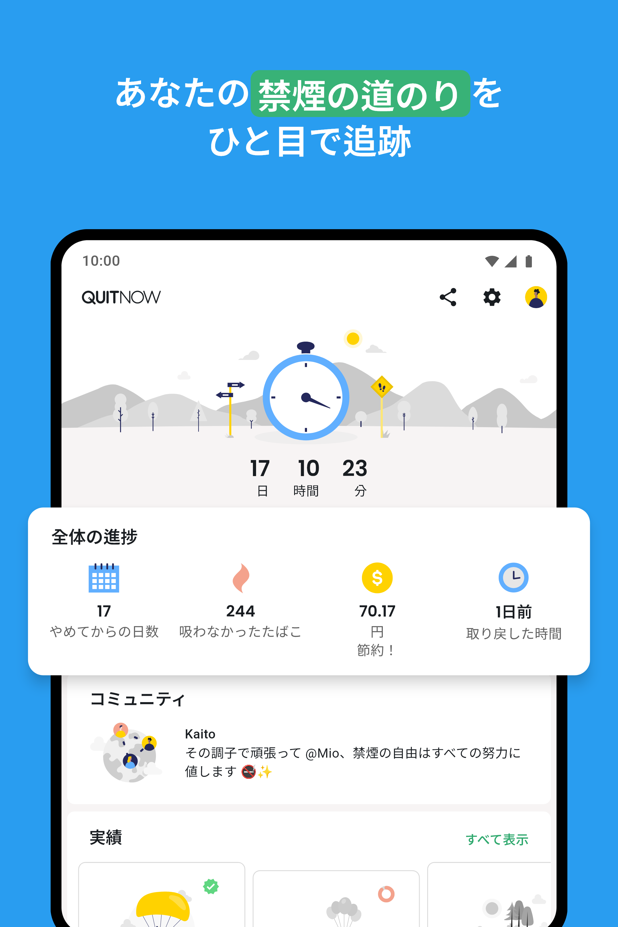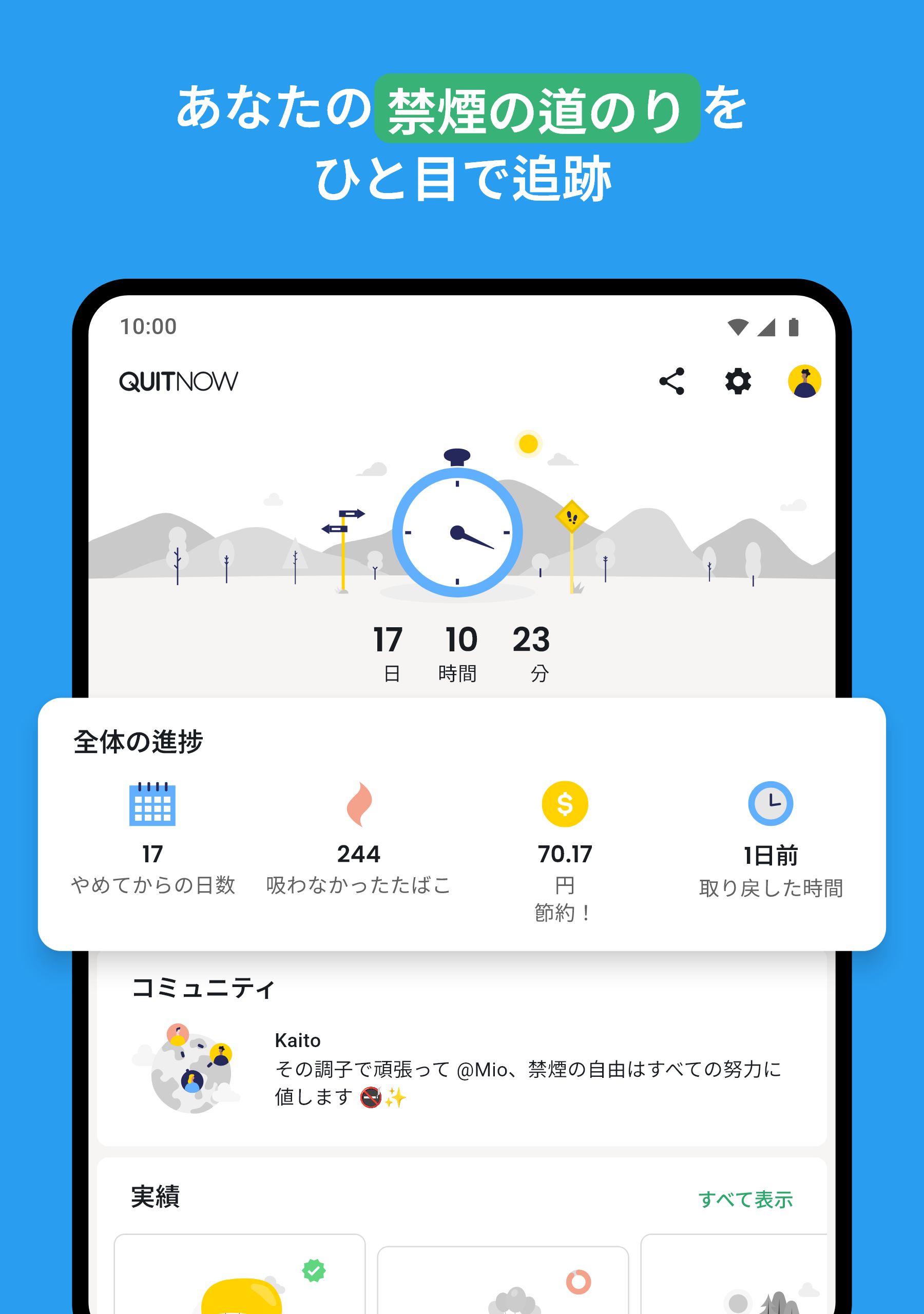 成果:禁煙へのモチベーション: 人生のすべてのタスクと同様に、禁煙はタスクを小さくて簡単なものに分けることで簡単になります。そこで、QuitNowは、避けたタバコの本数、最後のタバコからの経過日数、節約した金額に基づいて70の目標を提供します。これにより、初日から成果を祝うことができます。