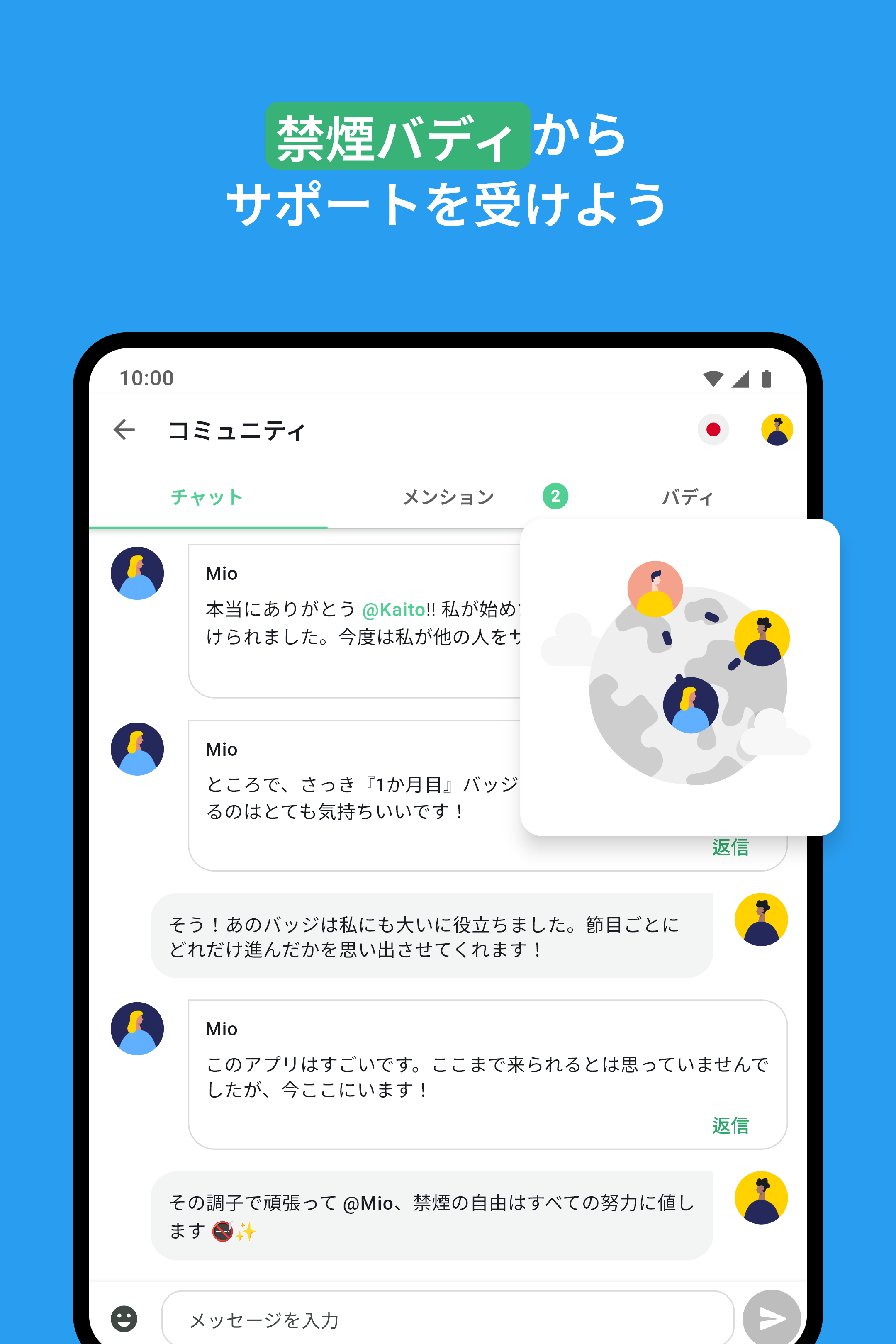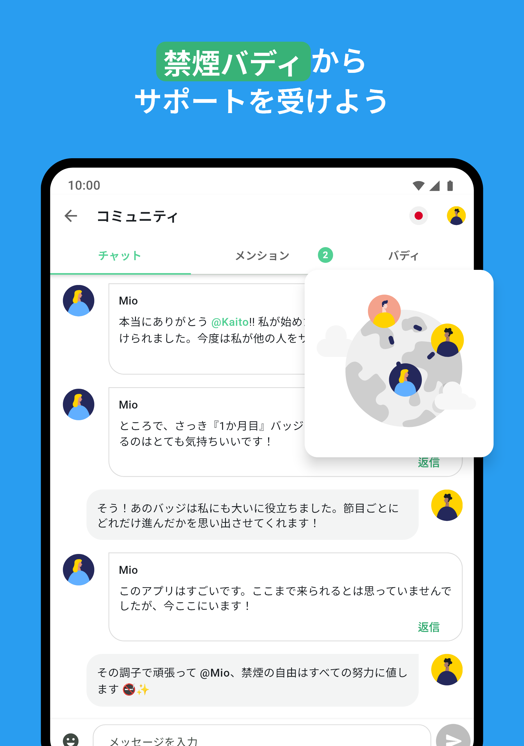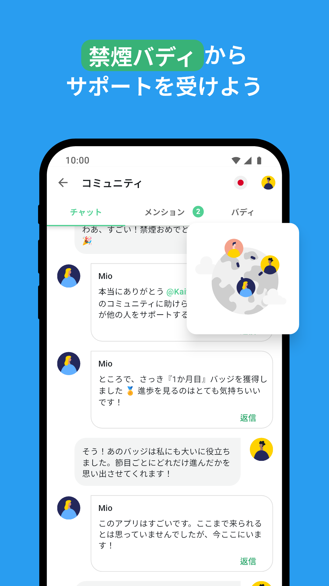 コミュニティ:元喫煙者のチャット: 禁煙するときは、禁煙エリアに留まる必要があります。QuitNowは、あなたのようにタバコにさよならを告げた人々が集まるチャットを提供します。非喫煙者と過ごす時間は、あなたの道をより容易にします。
