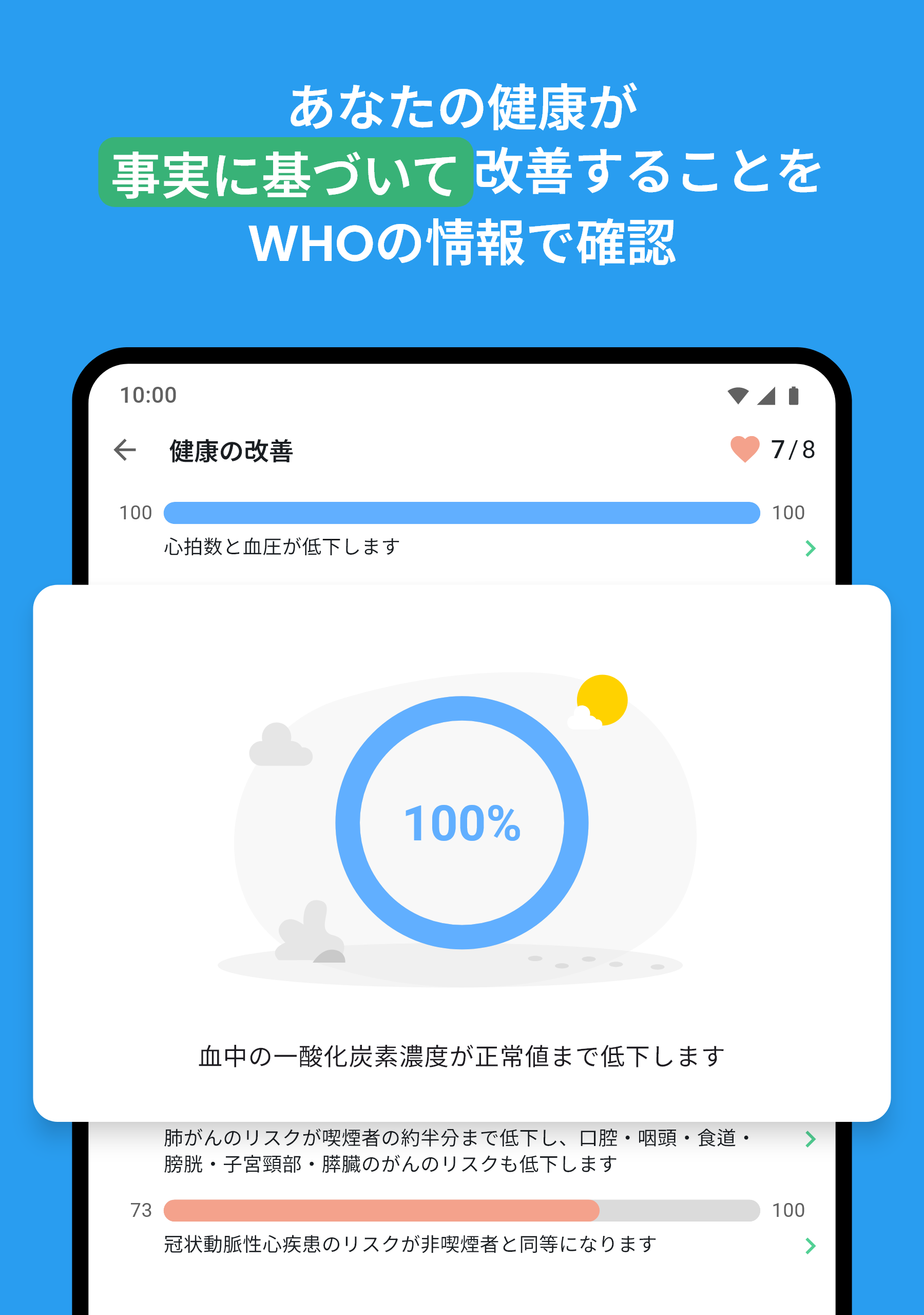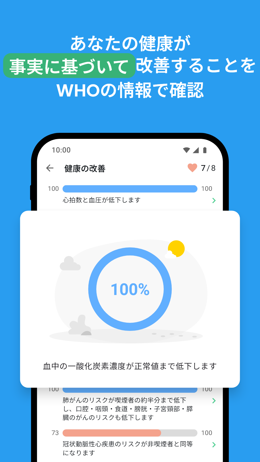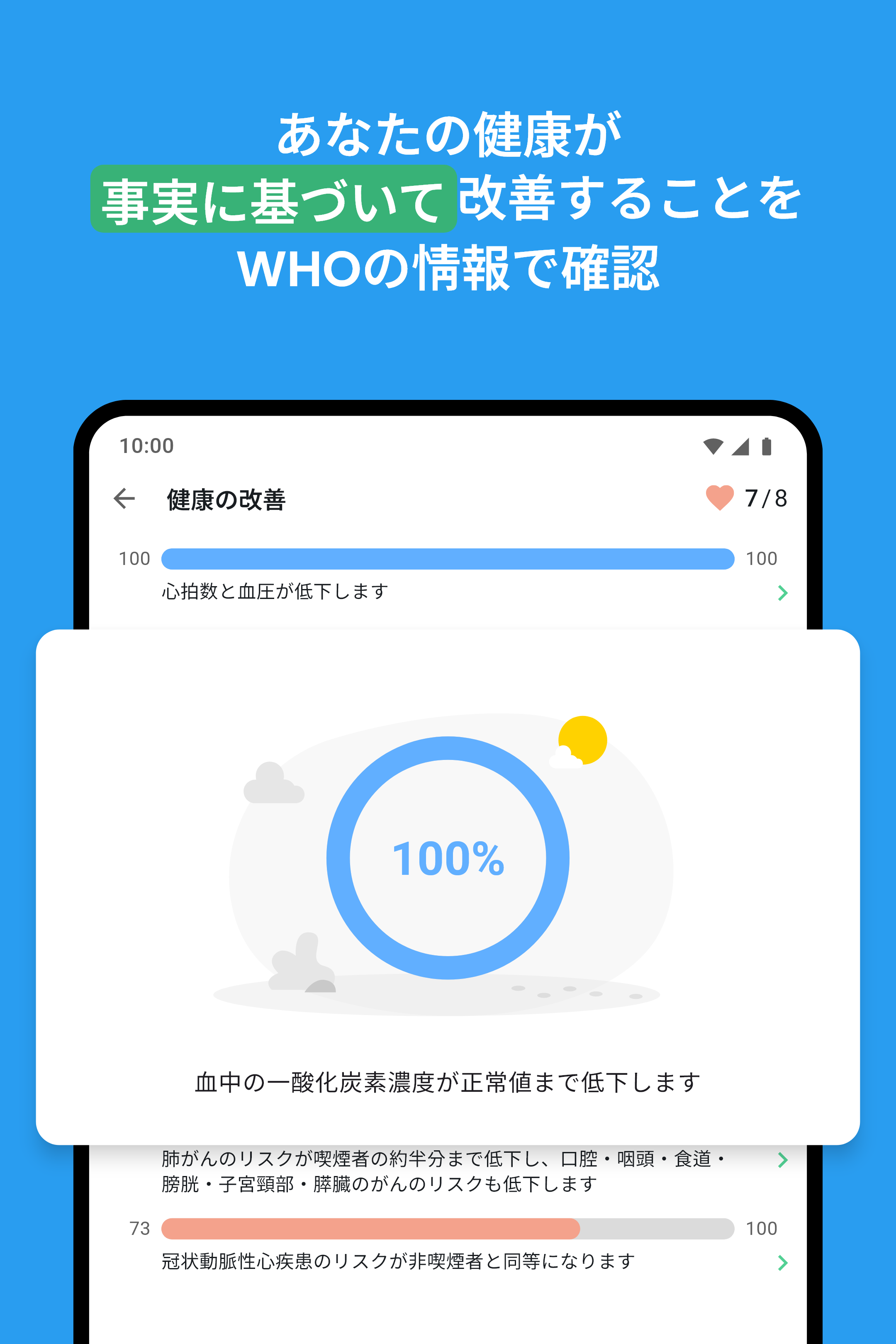 元喫煙者としてのあなたの健康: QuitNowは、あなたの体が日々どのように改善されているかを説明する健康指標のリストを提供します。これらは世界保健機関に基づいており、WHOが更新するたびに私たちも更新しています。