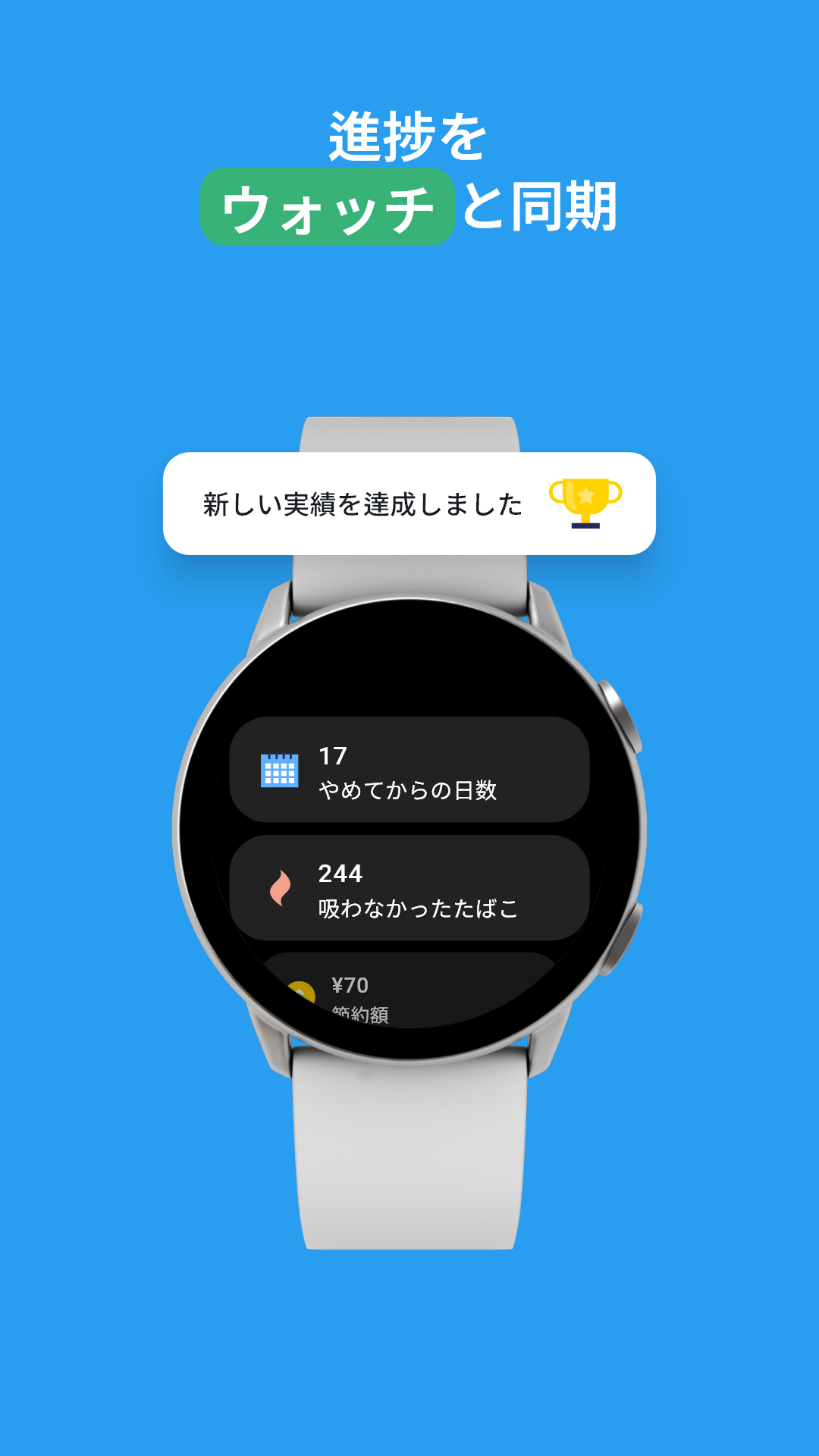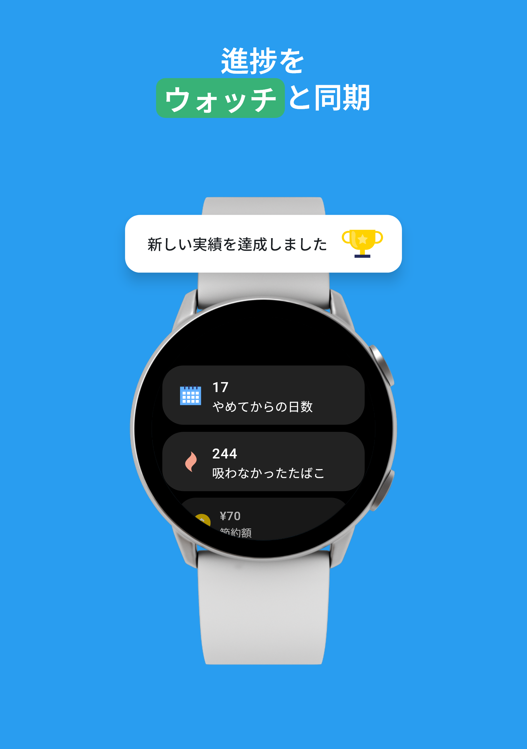 あなたの時計でも: QuitNowのWear OSアプリとタイルで、進捗状況を追跡したり、節約した金額を確認したり、手首から直接禁煙の統計をチェックしたりできます。