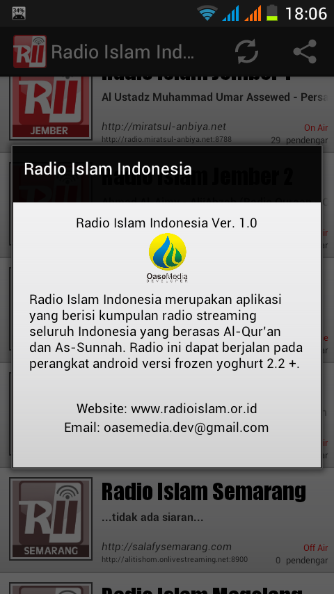 ラジオは、とりわけ、ラジオ地域でラジオ局をしているストリーミング収集:Jemberイスラムラジオを、ラジオイスラム教デポック、ラジオイスラム教スマラン、ブカシイスラムラジオ、ラジオイスラム教ジョグジャなどこのラジオinsyaAllaahはフローズンヨーグルト2.2以降のバージョンからのバージョンLolypopまでのAndroidデバイス上で実行することができます。