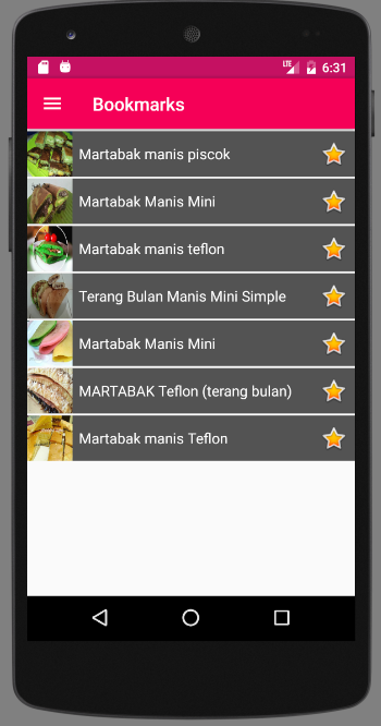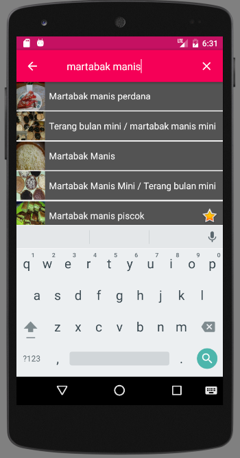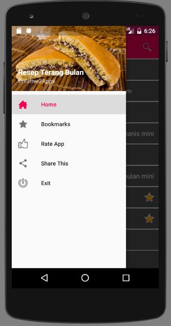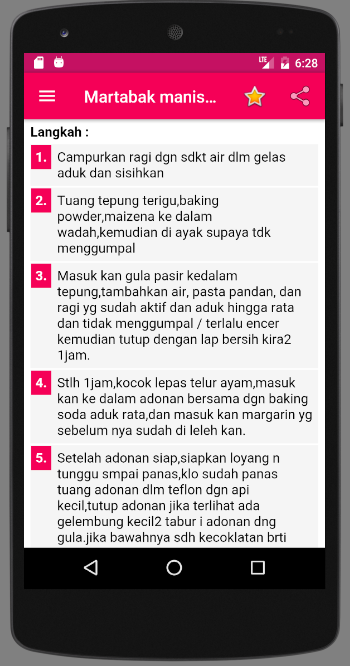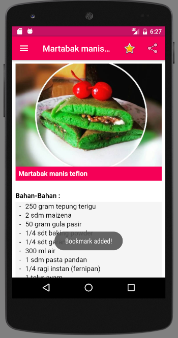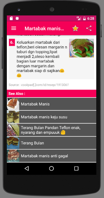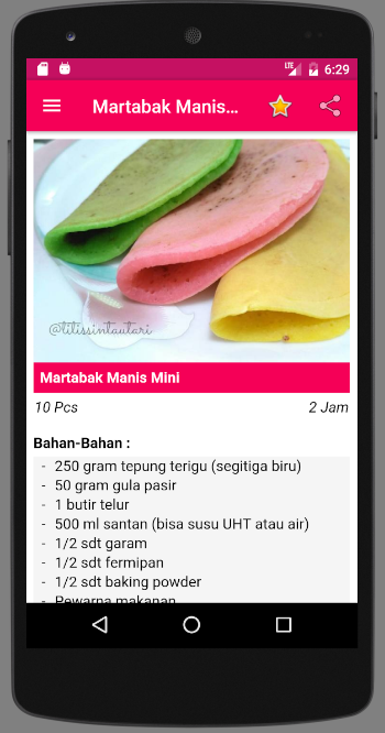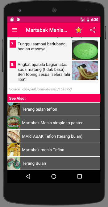 Temukan 350+ aneka Resep Terang Bulan mulai dari step by step cara membuat terang bulan mini, martabak manis teflon sederhana hingga yang spesial untuk keluarga tercinta. Siapa yang tidak kenal dengan kue terang bulan, bagi sebagian orang mungkin lebih familiar dengan sebutan martabak manis, yup, kue terang bulan adalah martabak. Saat ini untuk mendapatkan kue terang bulan atau martabak kita tidak perlu bingung karena banyak sekali penjual dipinggir-pinggir jalan. Tetapi tidak ada salahya jika Anda mencoba untuk membuatnya sendiri dirumah, karena bahan-bahannya juga cukup mudah kita temukan ditoko-toko terdekat serta cara membuat terang bulan juga tergolong sederhana. Dengan rasa yang sangat bervariasi, jika kita membuatnya sendiri pasti rasanya juga akan berbeda yang jelas kita akan lebih puas kan. Download aplikasi "Resep Terang Bulan" berikut ini, dalam aplikasi ini tersedia ratusan resep berbagai aneka Resep Terang Bulan yang baik empuk dan lembut, dengan variasi rasa dan step-step yang jelas dan mudah diikuti. Fitur-fitur: - Aplikasi dapat dibaca secara Offline Tanpa Koneksi Internet (kecuali gambar) - Fitur berbagi resep - Fitur Zoom halaman - Fitur Bookmark - Navigasi yang baik dan mudah digunakan - Lebih cepat dan ringan - Fitur pencarian yang baik Download Aplikasi Resep Terang Bulan - Cara Membuat Kue Terang Bulan atau Martabak Manis Spesial, resep terang bulan mini empuk dan lembut dan lain-lain yang bisa Anda praktekan di rumah.