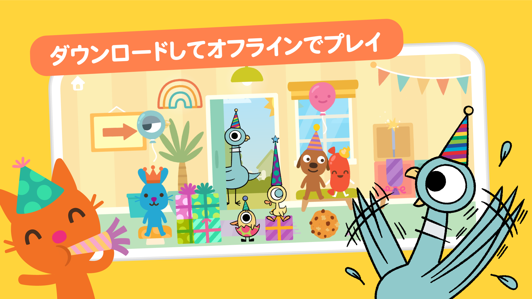 想像力いっぱいの遊びを! 幼児向けインタラクティブゲームがたくさん!2〜6歳の子供たちが、成長を支援するようデザインされたアクティビティを通じて、創造し、学び、探求します。期間限定! モー・ウィレムズのPigeon&アヒルのひなのBird-dayパーティーに参加しよう!プレゼントを持ってきてね!(Pigeonはホットドッグが大好きだって)