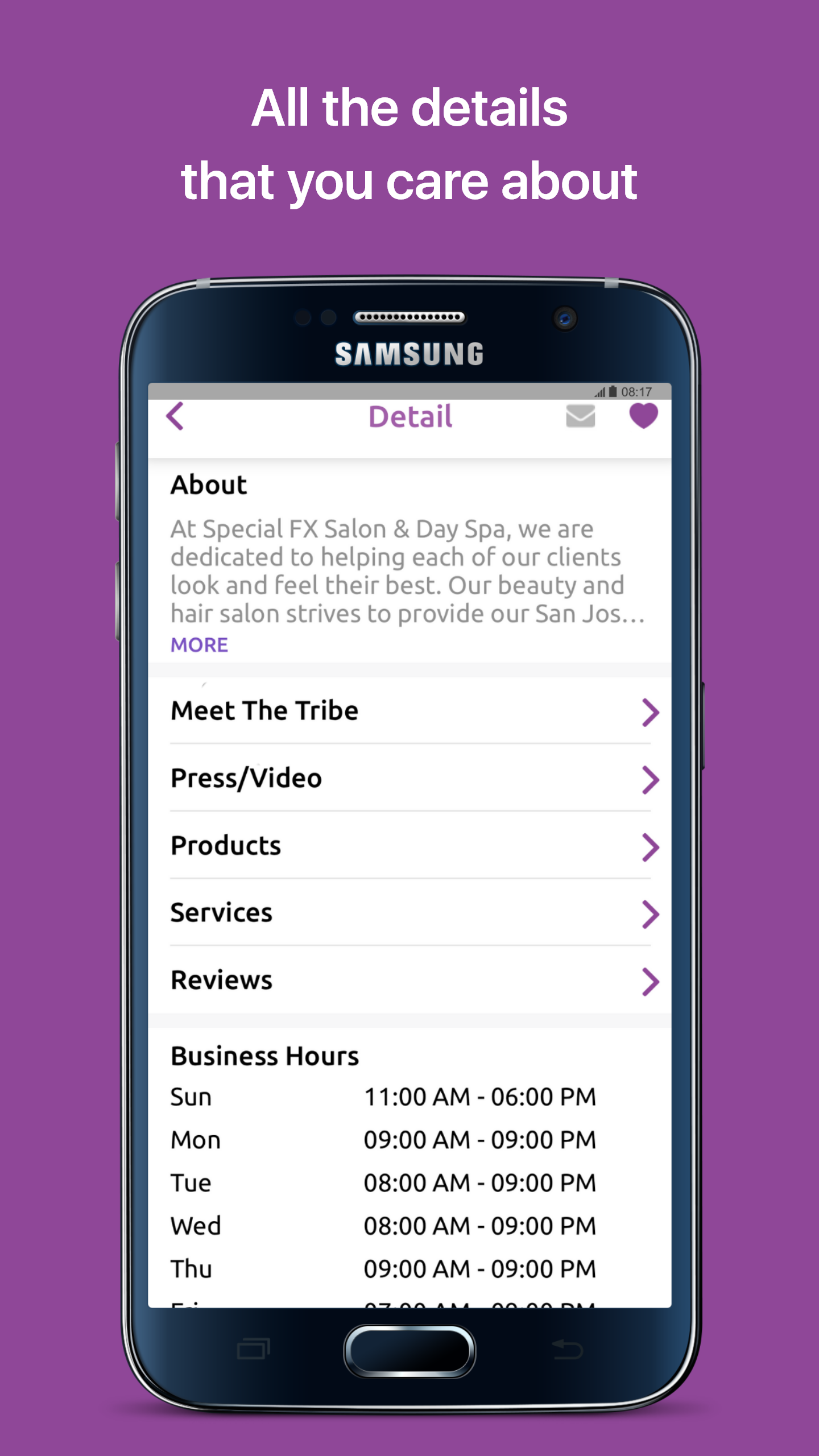 Owners are able to create a complete salon, spa or barbershop profile on the Salonch app. With a photo gallery, a description about the salon, and Meet the Team with staff bios, owners can also add press and videos, list the products used and retailed, add their service menu and so much more.