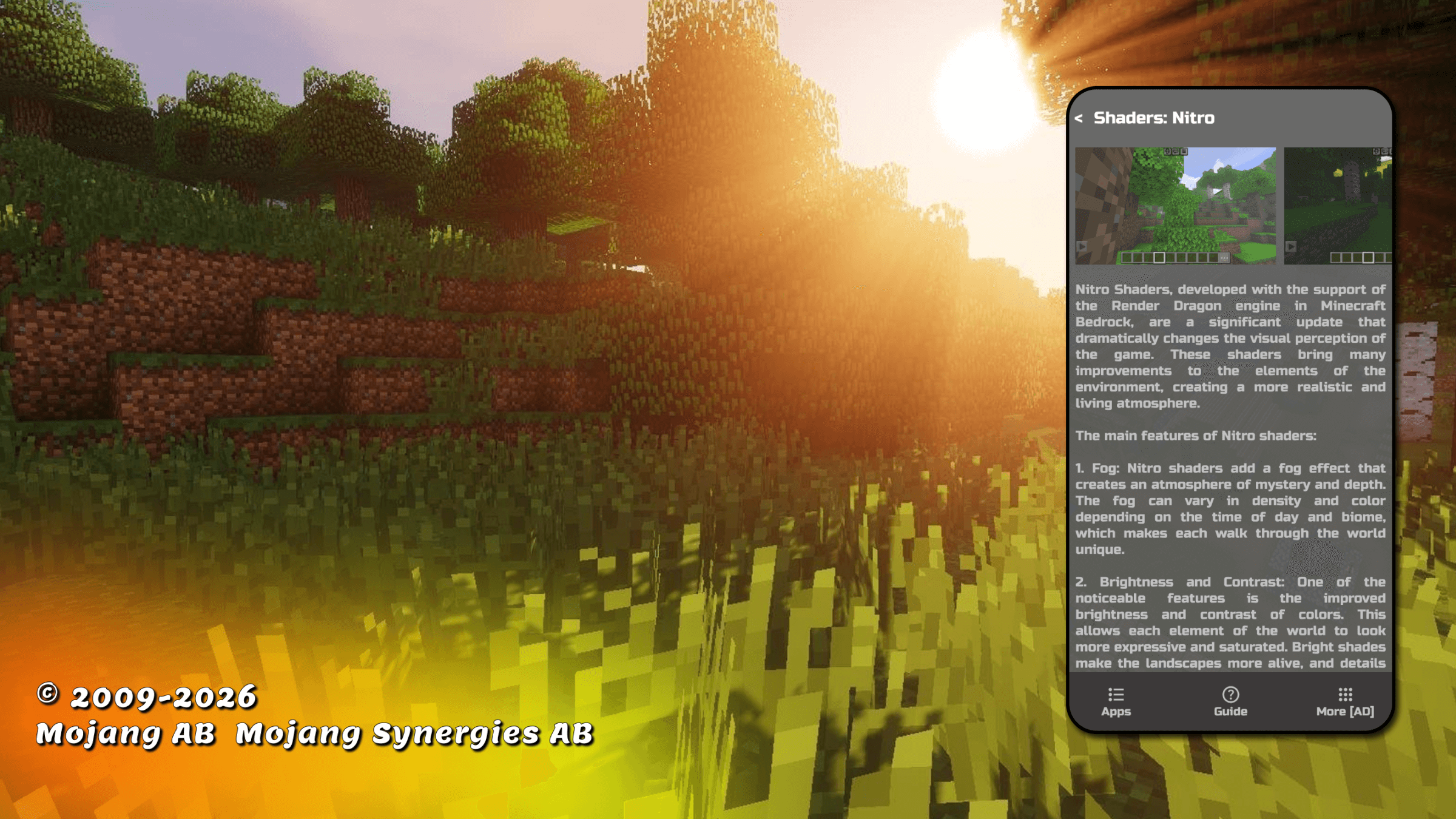 ゲーム内のすべてのバイオームの外観がかなり単調であるという事実を我慢することにうんざりしていませんか?少なくともいくつかの Minecraft 用のシェーダーをゲームに取り入れたいのですが、mcpe 用の興味深い MOD が見つかりませんか?我慢するのはやめてください! Minecraft 用の動作するシェーダーしか持っていないため、私たちのアカウントに来てください。さらに、取り付けも非常に簡単です。数回クリックするだけで、mcpe 用の優れたシェーダーが得られ、使用できるようになります。マインクラフトのシェーダーを使ってバイオームがどのように変化するかを確認してみましょう。そして、シェーダー MOD があなたの世界をどのように変えるかを見たら、友達はどれほど驚くことでしょう。 Minecraft のシェーダー MOD を使用して最も美しいゲーム世界の所有者になりたいですか?それは完璧です!そうなると、Minecraft にはシェーダーが必ず必要になります。結局のところ、シェーダー MOD リアルを使用すると、mcpe のマップを多様化する信じられないほど美しいバイオームを取得できます。すべての MOD とマップは、ゲームに欠けている信じられないほどの多様性を提供します。 Minecraft Pe のシェーダー MOD がこれに役立つため、ゲームのバイオームを変更する方法を考える必要はありません。そしてもちろん、これらはシェーダー Minecraft Pe であり、立体的な世界を変更し、より現実的なものにします。 Minecraft のシェーダーがどのようなものになるかを想像してみてください。間違いなく素晴らしいものになるでしょう! ゲームの外観を変更したいと常に思っていましたが、その方法がわかりませんでしたか?ゲームをもっとc mcpe modにしたいと思いませんか? mcpeのシェーダーmodでそれができるようになりました!これで、あなたのゲームは信じられないほど美しく、非常に珍しいものになります。急いで、Minecraft の素晴らしいシェーダーを使って新しいゲームを始めましょう! ゲームの通常の立体的な世界に飽きたら、リアルなシェーダー MOD なしではいられないはずです。結局のところ、彼らは認識を超えてゲームを変えることができるのです。木や水の通常の外観を置き換えることができます。 mcpe 用シェーダーを使用して新しいゲーム体験をお楽しみください。 mcpe用の新しいリアルシェーダーmodを導入することでグラフィックを大幅に変更することができます。たとえば、ゲーム世界の明るさを上げたり、逆にゲーム世界を暗くしたりします。 MODシェーダーを使用すると、揺れる草や葉を追加できます。また、非常に美しい霧、鉱石のアニメーションを追加し、ブロックの外観を変更します。 アプリケーションにはさまざまなリアルな Minecraft シェーダーがあり、それぞれがゲームをユニークなものにします。それぞれが何らかの形でゲームの世界を変えます。ただし、デバイスで使用するにはもう少しメモリが必要になることに注意してください。 しかし、現実的なシェーダー MOD を入手するには、このアドオン ディレクトリをどのように使用するのでしょうか?すべてが非常にシンプルです。結局のところ、私たちのアプリケーションは非常にシンプルで直感的なインターフェイスを備えています。すべてのプレイヤーが数回クリックするだけで MOD シェーダーを入手できるよう支援してくれるのは彼です。したがって、指示に従ってください。このディレクトリを開いて、利用可能なすべてのファイルのリストを表示します。そこには、かなり大きなファイルのリスト、各ファイルの説明、およびいくつかのスクリーンショットがあります。アドオンの選択を決定したら、それをダウンロードしてデバイスにインストールできます。そして、携帯電話のゲームで開くことができます。ファイルを実行することを忘れないでください。ゲームをインストールする必要があります。 免責事項: 私たちはゲームの開発者とは提携していません。このアプリケーションは Mojang AB によって承認されていません。すべての権利はガイドラインによって留保されます。