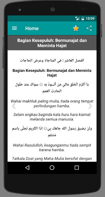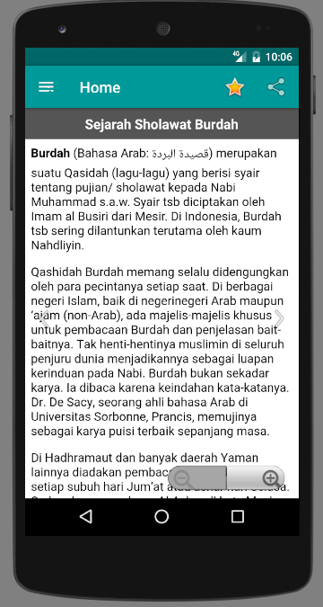 Download Aplikasi Sholawat Burdah Imam Al-Bushiri Teks Arab Dilengkapi dengan Terjemahan Bahasa Indonesia. Burdah (Bahasa Arab: قصيدة البردة) merupakan suatu Qasidah yang berisi syair tentang pujian/ sholawat kepada Nabi Muhammad s.a.w. Syair ini disusun oleh seorang Sufi terkenal yaitu Imam al Busiri dari Mesir. Sholawat Burdah Lengkap Dengan Terjemahan Indonesia Tediri dari 10 Bagian : - Bagian Pertama: Bercumbu dan Pengaduan Cinta - Bagian Kedua: Menjaga Hawa Nafsu - Bagian Ketiga: Pujian Kepada Nabi SAW - Bagian Keempat: Kelahiran Rosulullah SAW - Bagian Kelima: Mukjizat Nabi SAW - Bagian Keenam: Kemuliaan Al-Quran dan Pujian Terhadapnya - Bagian Ketujuh: Isra’ Mi’raj Nabi SAW - Bagian Kedelapan: Perjuangan Nabi SAW - Bagian Kesembilan: Tawassul Kepada Rasulullah SAW - Bagian Kesepuluh: Bermunajat dan Meminta Hajat Qashidah Burdah memang selalu didengungkan oleh para pecintanya setiap saat. Di berbagai negeri Islam, baik di negeri-negeri Arab maupun ‘ajam (non-Arab), ada majelis-majelis khusus untuk pembacaan Burdah dan penjelasan bait-baitnya. Tak henti-hentinya muslimin di seluruh penjuru dunia menjadikannya sebagai luapan kerinduan kepada Nabi. Fitur-fitur: - Dapat digunakan dalam keadaan Offline / Tanpa Koneksi Internet. - Tampilan simpel dan nyaman dengan navigasi yang mudah digunakan - Fitur Bookmark untuk menyimpan halaman yang sering dibaca - Fitur Zoom halaman - Fitur Share dan Rate App - Fitur pencarian sholawat - Aplikasi lebih cepat dan ringan Download sekarang juga aplikasi Sholawat Burdah karya Imam Al-Bushiri dilengkapi dengan terjemahan dalam bahasa Indonesia.
