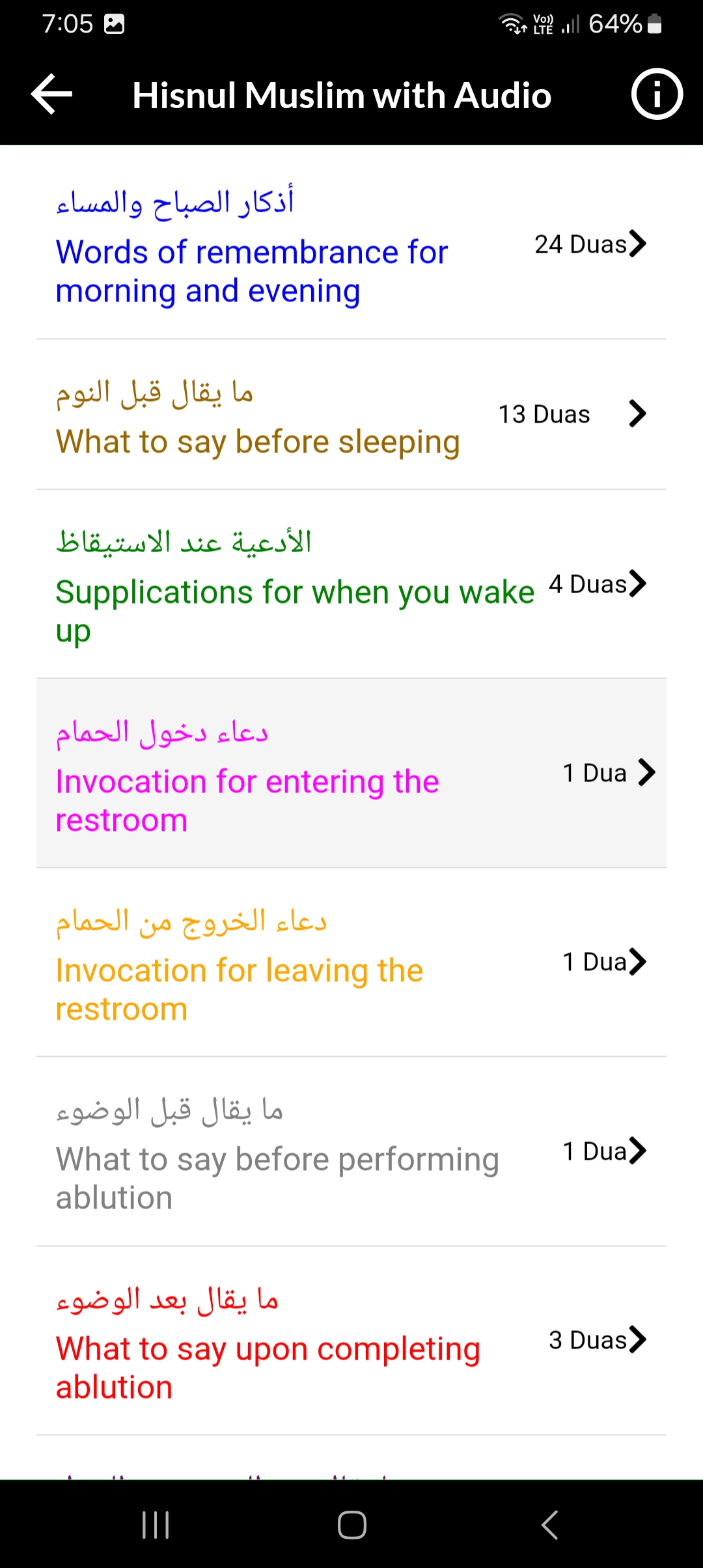 We have added the following: 1. Prayer times 2. Qibla direction / qibla finder 3. Quiz about Prophet Muhammad pbuh 4. Tafseer of The Qur'an in many languages 5. Hisnul Muslim Dua categorized with audio 6. All 40 Rabbana duas of the quran 7. Morning azkar in English and Arabic 8. Evening azkar in English and Arabic 9. The 99 Names of Allah in English 10. The 99 Names of Allah in Arabic 11. Important Duas for good health, healing, travel and success 12. Sweet To-Do activity 13. Islamic quiz