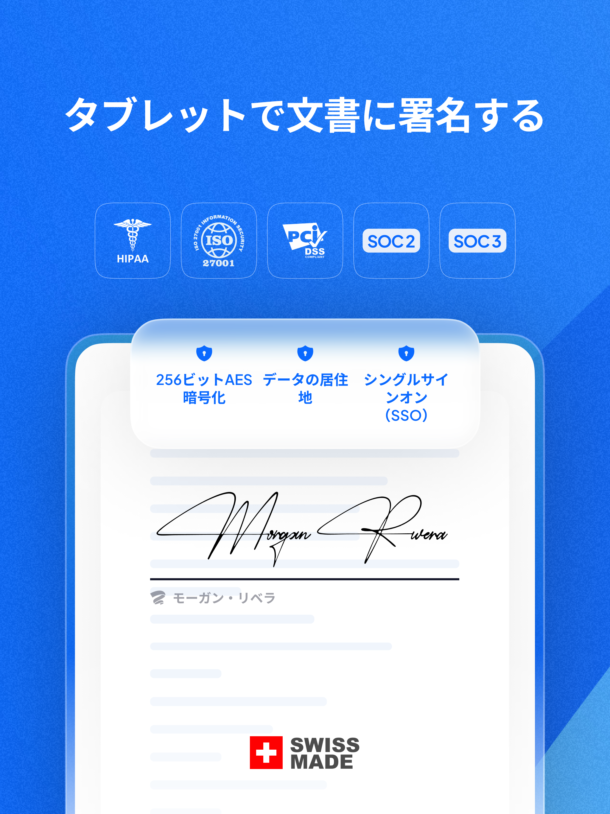 さまざまなコンプライアンス製品:SOC 2、HIPAA、ISO 27001、GDPR、CCPAなど、関連するすべての認証とコンプライアンスについて、自社と電子署名プラットフォームの認証に取り組んでいます。