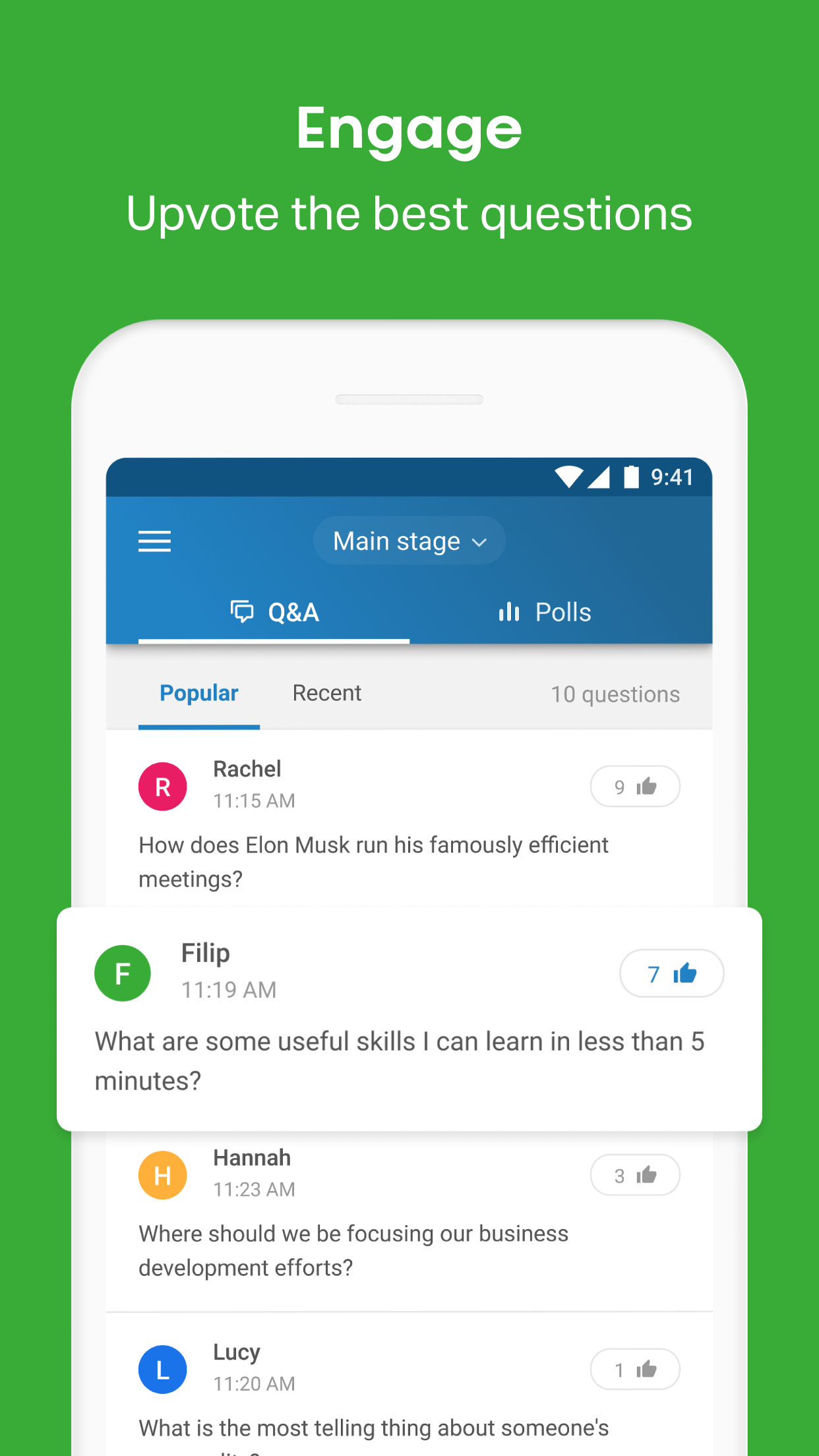 -質問はありませんか?または、あなたが聞きたいものは、他の誰かから尋ねられた画面にすでにありますか?他の参加者の質問に賛成してください! Slidoを使用して、最も興味深い質問を一番上にプッシュします。