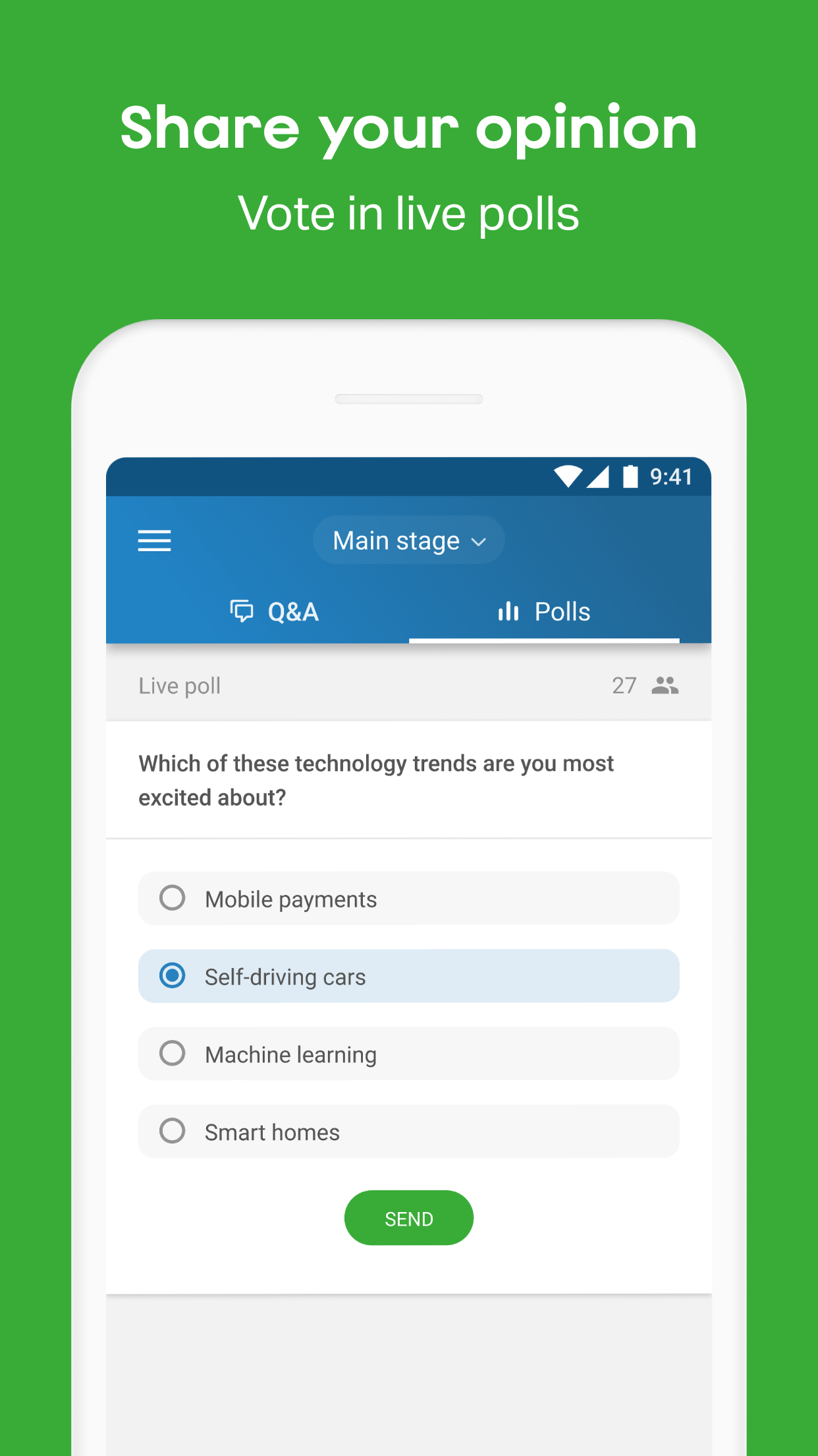 質問をしたり、投票に投票したり、参加しているイベントの会話に参加したりできます。 Slidoアプリをダウンロードし、イベントコードを入力するだけでイベントに参加できます。