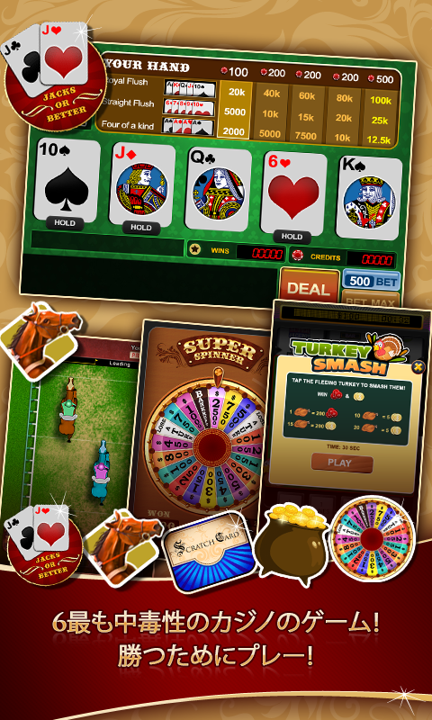 ✔ 5つの刺激的なミニゲーム―スーパースピナー、ラッキーのゴールドポット、ビデオポーカー、スクラッチカード、そしてスーパーダービー。「楽しくプレイ」か「コインでプレイ」を選択可能!