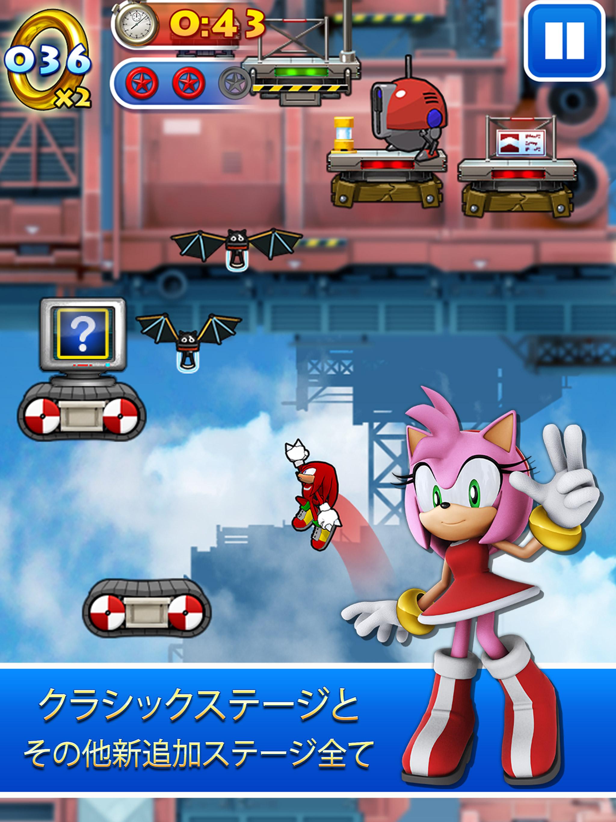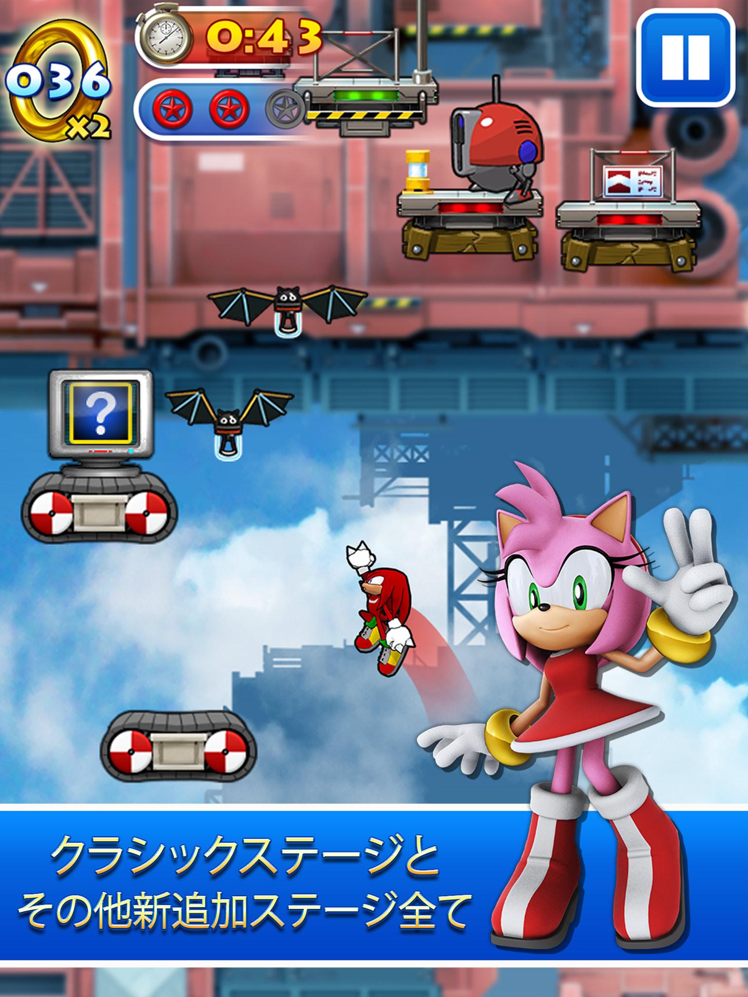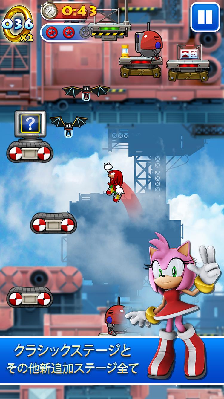 【重要】サービス終了のお知らせ 平素より『ソニックジャンプ』をご利用いただきありがとうございます。 この度『ソニックジャンプ』は 2018年6月5日をもちまして配信を終了させていただく事となりました。これまでのご愛顧に厚く御礼申し上げます。 配信終了まで残り短い期間ではございますが『ソニックジャンプ』をお楽しみください。 かんたん操作でクールにジャンプ! 高みを目指してとび出そう!! ソニックや彼の仲間たちと共におなじみのソニックワールドや、更に新しく追加されたクラシックソニックステージワールドを冒険し、Dr.エッグマンの野望を阻止しよう! 端末を傾けて画面をタップするだけ!かんたん操作のジャンプアクション!ストーリーモードでDr.エッグマンの野望を打ち砕き、無限に続くアーケードモードではさらなる高みを目指し、世界中の友達とハイスコアを競い合おう! ソニックと頼れる仲間たち ソニック、テイルス、ナックルズ、エミー、ルージュ、シルバー、ブレイズの中から好きな仲間を選んで遊ぼう! 各キャラごとにいろいろなスキルを使えるよ 多彩なワールド おなじみの爽快ステージ、グリーンヒルゾーンをプレイしよう ほかにも、マウンテン、ジャングル、ブルースカイ、メカニカルゾーンなど、新たに追加された、魅力的なステージが盛りだくさん! ストーリーモードとアーケードモードの、2つのモードをプレイできるぞ。 ストーリーモードでは48もの多彩なステージをクリアして進み、Dr.エッグマンの悪の野望を阻止しよう!アーケードモードでは無限ゾーンに挑戦!ミスしないでどこまで跳べるか!? 究極の高みを目指そう。 楽しいチャレンジとクエスト それぞれのステージをハイスピードでクリアして、でっかく稼ごう。 ストーリーモードでもアーケードモードでも、スペシャルミッションをクリアすれば、スペシャルな報酬がもらえるぞ!ぜひともチャレンジしよう! 豊富なアイテムとアンロック要素 ゲーム中のリングを集めてストアでお買い物!プレイに役立つ便利なアイテムや、クールな壁紙を入手できるぞ!ゲームを進めることで、新たなアイテムがアンロックされることも!? 世界レベルに挑戦 アーケードモードで、誰が一番高く飛べるのか? 国際ランキングでハイスコアを叩き出すのは誰だ?? 世界中のユーザーと競い合おう。 カスタマーレビュー 評価スコア:4点中4点満点 「昔からソニックをプレーして育った世代でもそうでない世代でも、ソニックジャンプの面白さにはブッ飛ばされます」 - Slide to Play 評価スコア:5点中4点 「ストーリーモードと各ミッションが最強に面白過ぎて、もっと高くジャンプしたい!…ってやっていると終わるタイミングが見つかりません」 - Digital Spy 評価スコア:10点中8点 「ソニックジャンプは楽しめる逸品。いい意味で期待を裏切られたね。」 - App Gamer 評価スコア:5点中4点 「セガはソニックジャンプに新しいゲームとしての命を吹き込んだね。これは元々ソニック・ザ・ヘッジホッグのファンだった人も、そうじゃ無かった人も全員巻き込む最強のゲーム」 - TouchGen ※※NVIDIA Tegra3搭載端末をご使用のお客様へ※※ 上記プロセッサを搭載している一部の端末にて、ゲームの描画表現が崩れる現象を確認しております。 発見次第非対応端末とさせて頂いておりますが、ご購入後に現象を確認されたお客様におきましては、 下記のお問い合わせ窓口までご連絡をお願い致します。 https://help.sega.net/ 件名に「ソニックジャンプ」を添えていただきますようお願い致します。 - - - - - Privacy Policy: https://privacy.sega.com/en/soa-pp Terms of Use: https://www.sega.com/EULA SEGA, the SEGA logo, SONIC THE HEDGEHOG and SONIC JUMP are either registered trade marks or trade marks of SEGA CORPORATION. or its affiliates. All rights reserved.