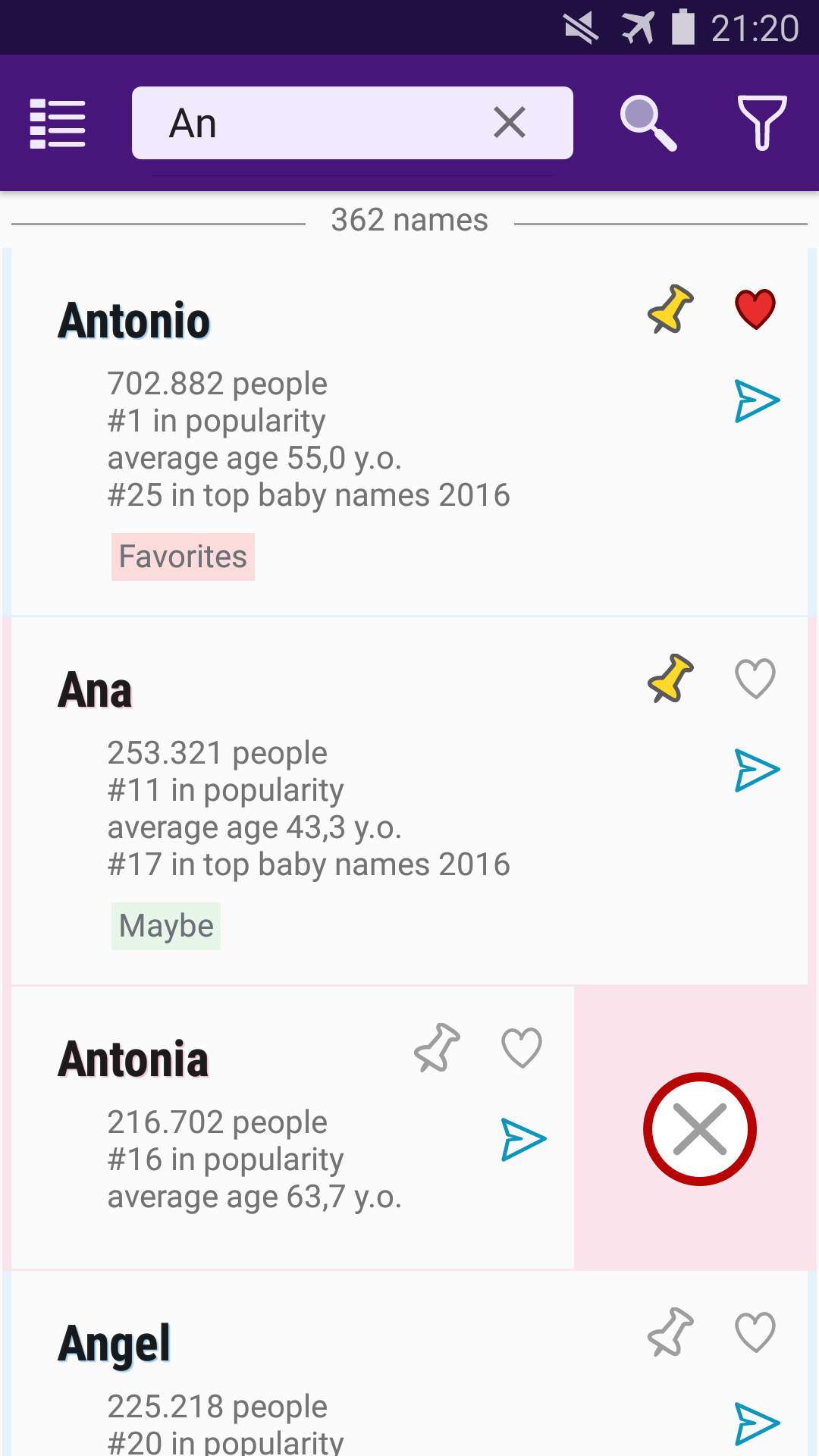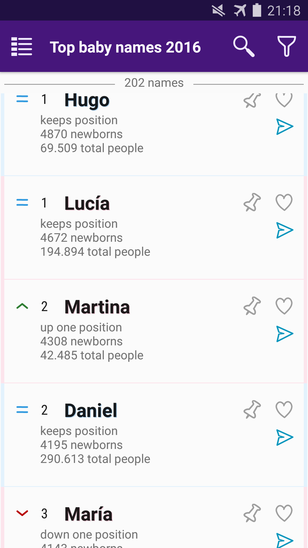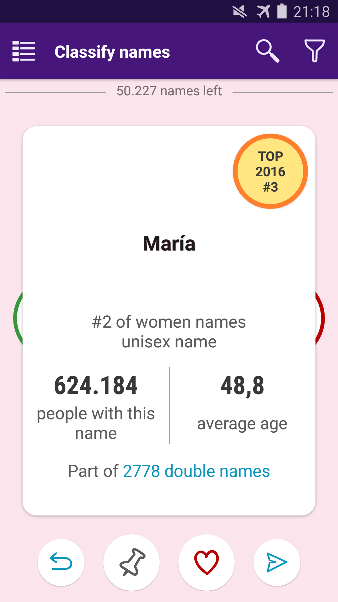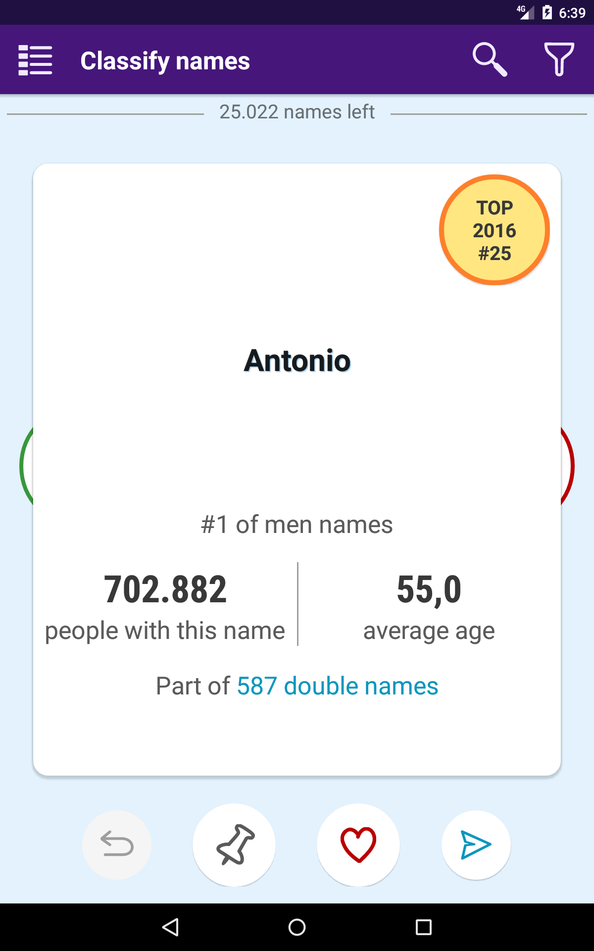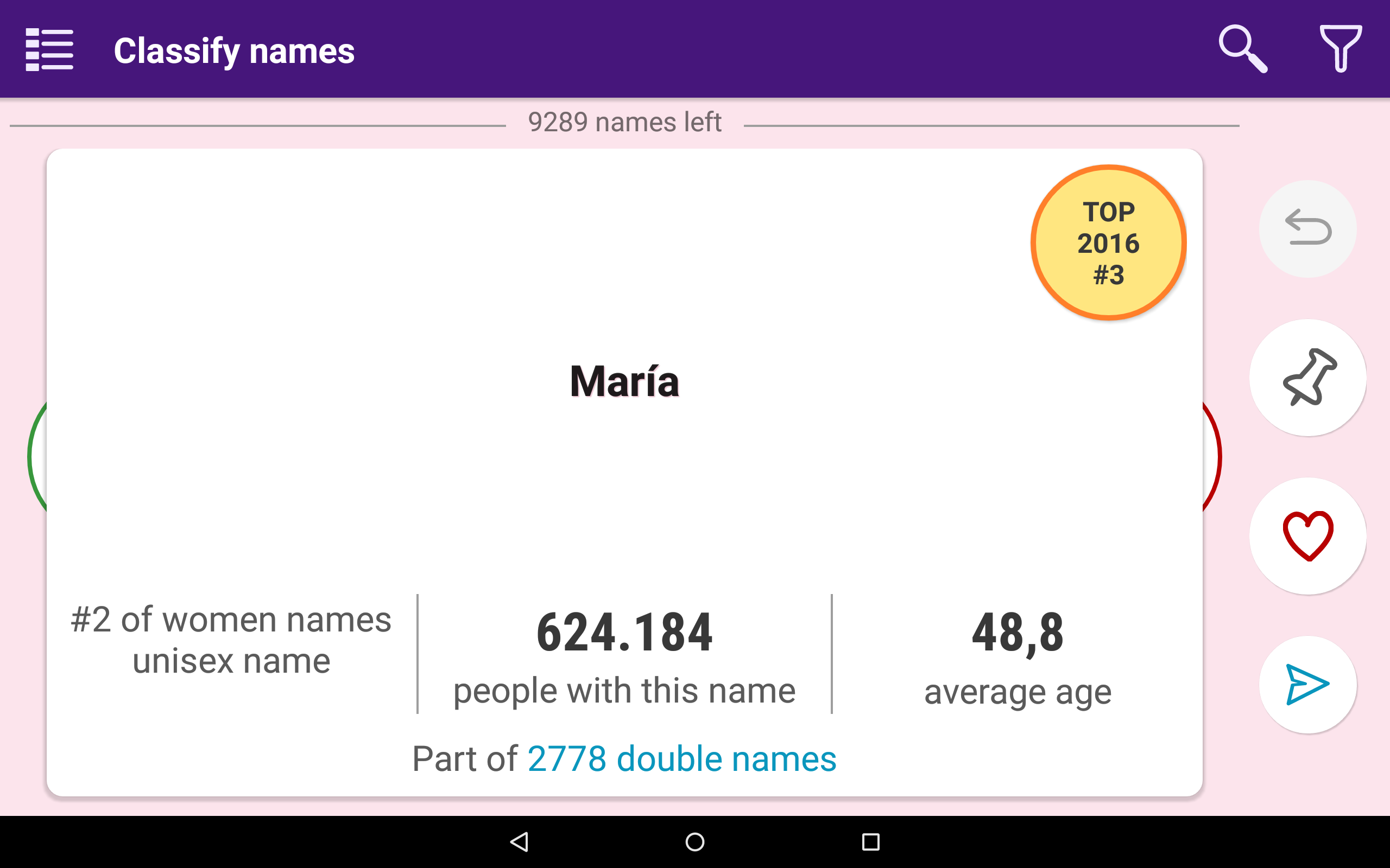 But you can also use the app to find out the most popular baby names in Spain, the most original, how many people are named like you in Spain, or their average age, as all the names in this app come from the Spanish census collected by the Spanish National Statistics Institute (INE), i. e., all these are names of real people.