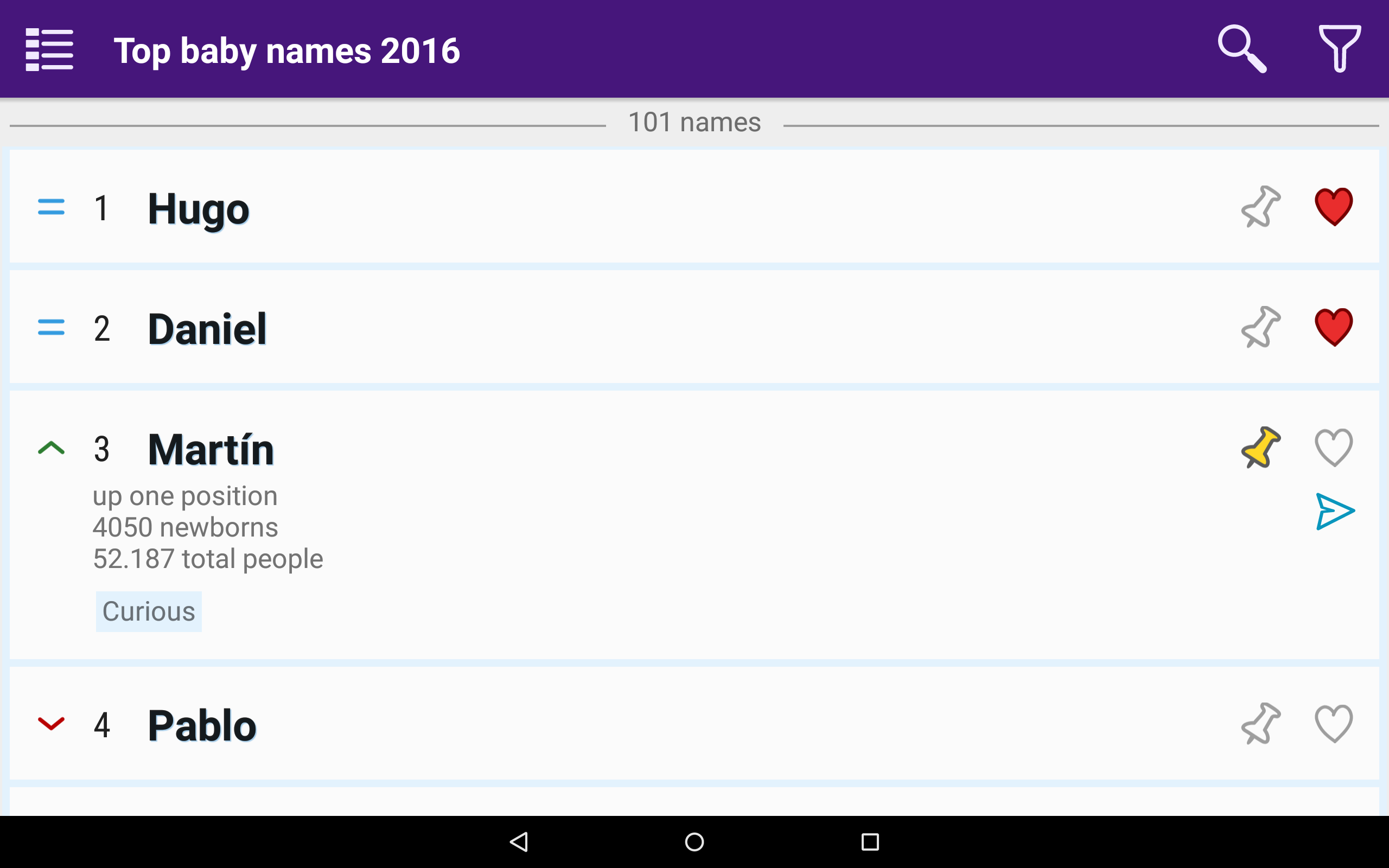 This app contains more than 9000 girl-, 8000 boy- and almost 700 unisex single names. Taking double names into account, you have more than 50,000 Spanish names to choose from in order to find the perfect name for your baby - or the characters in your stories.