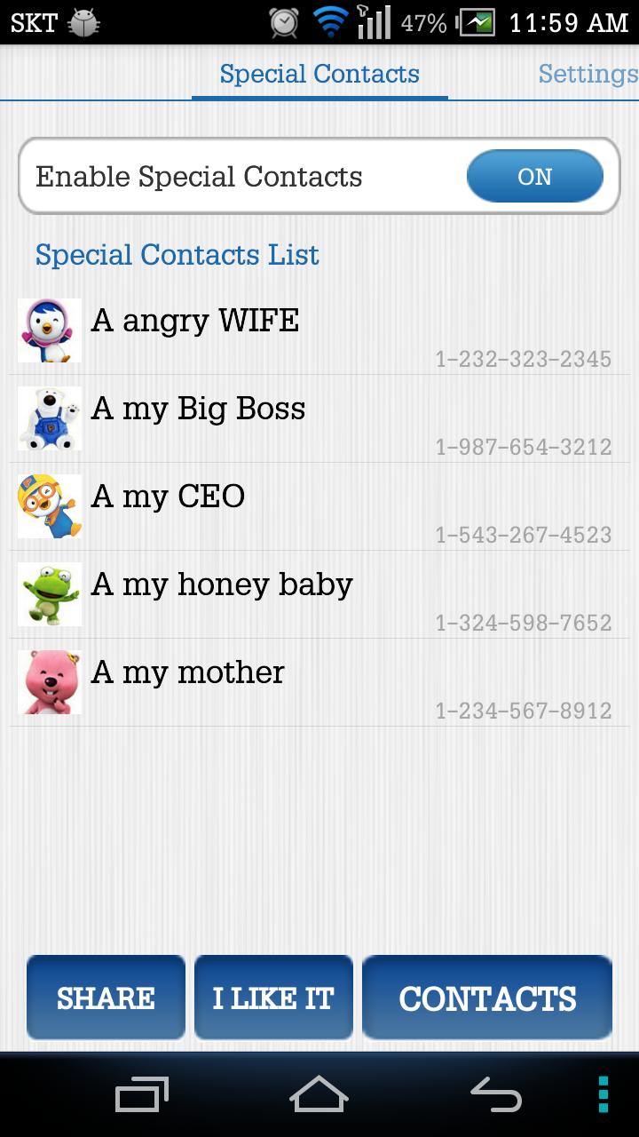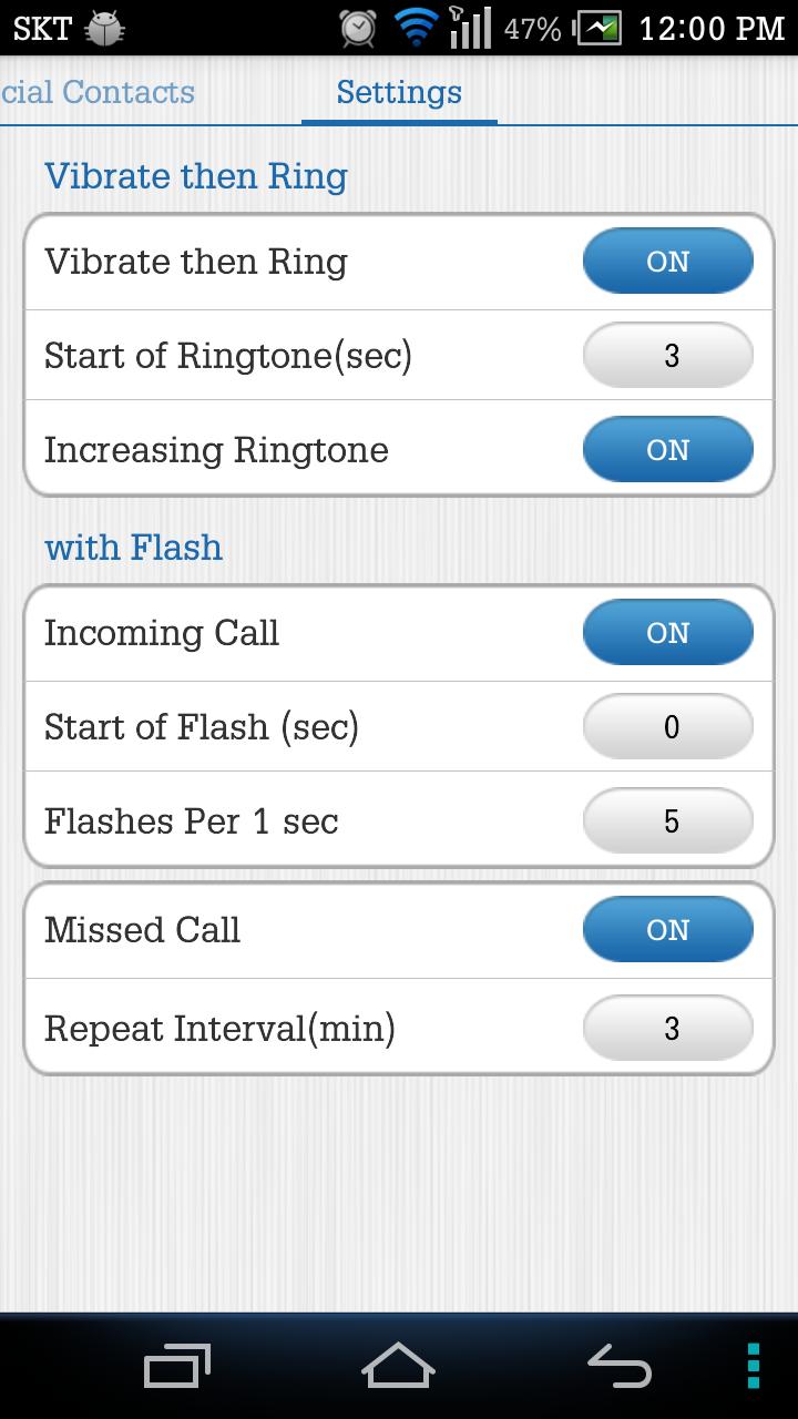 Special Contacts You can answer a call that should get a call in silence/vibration status or even noisy space 1) Choose your special contacts. 2) when incoming call that special contacts, it will notice you with ringtone and flash - spec : Increasing Ringtone. vibrate then ring, flash