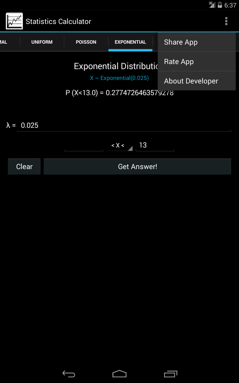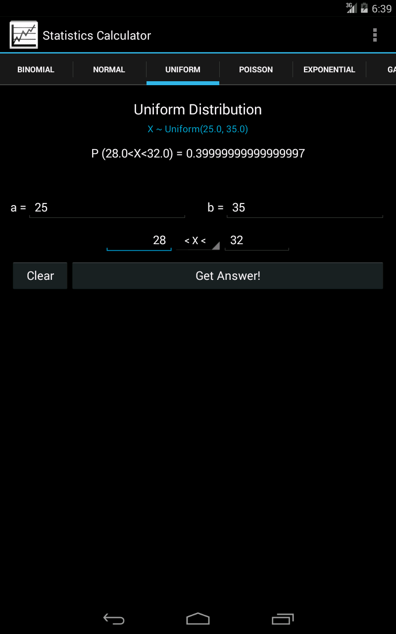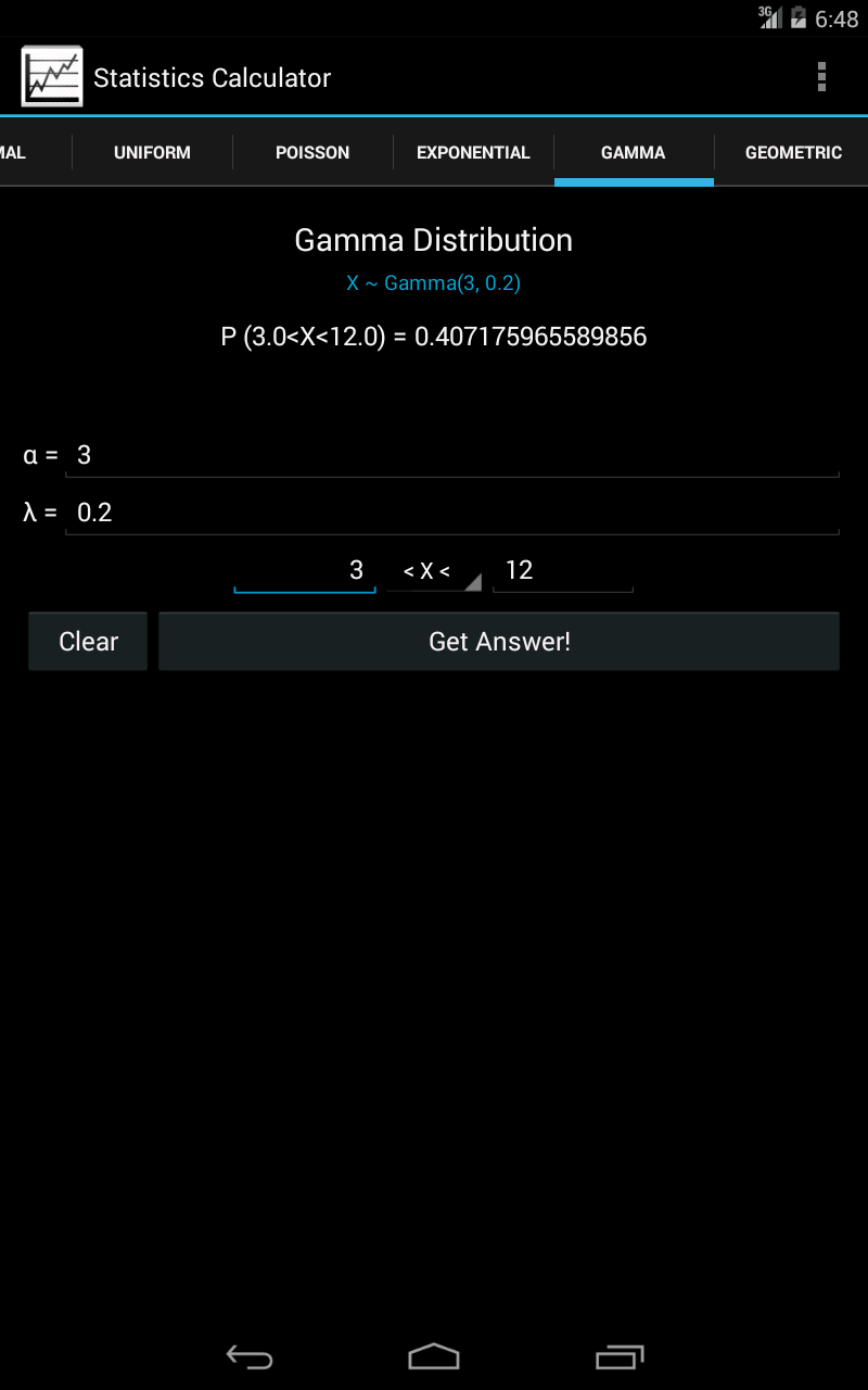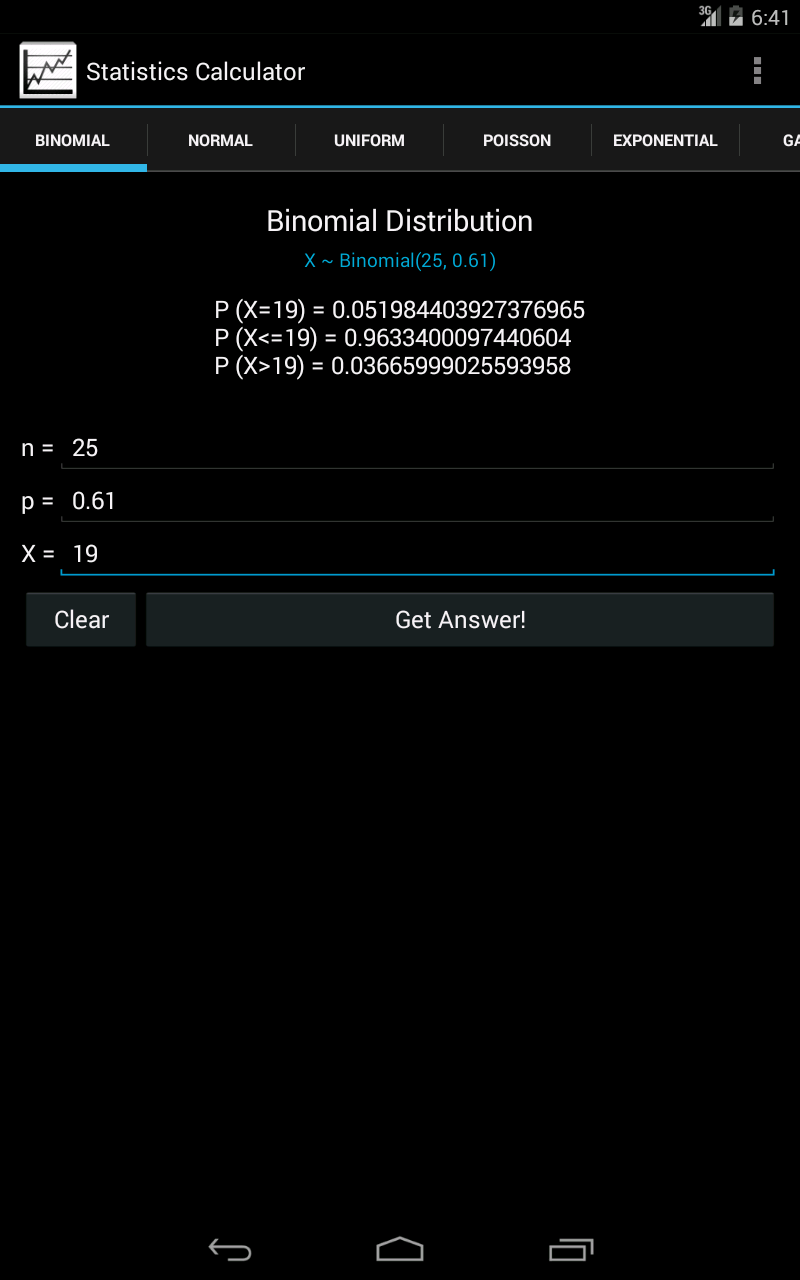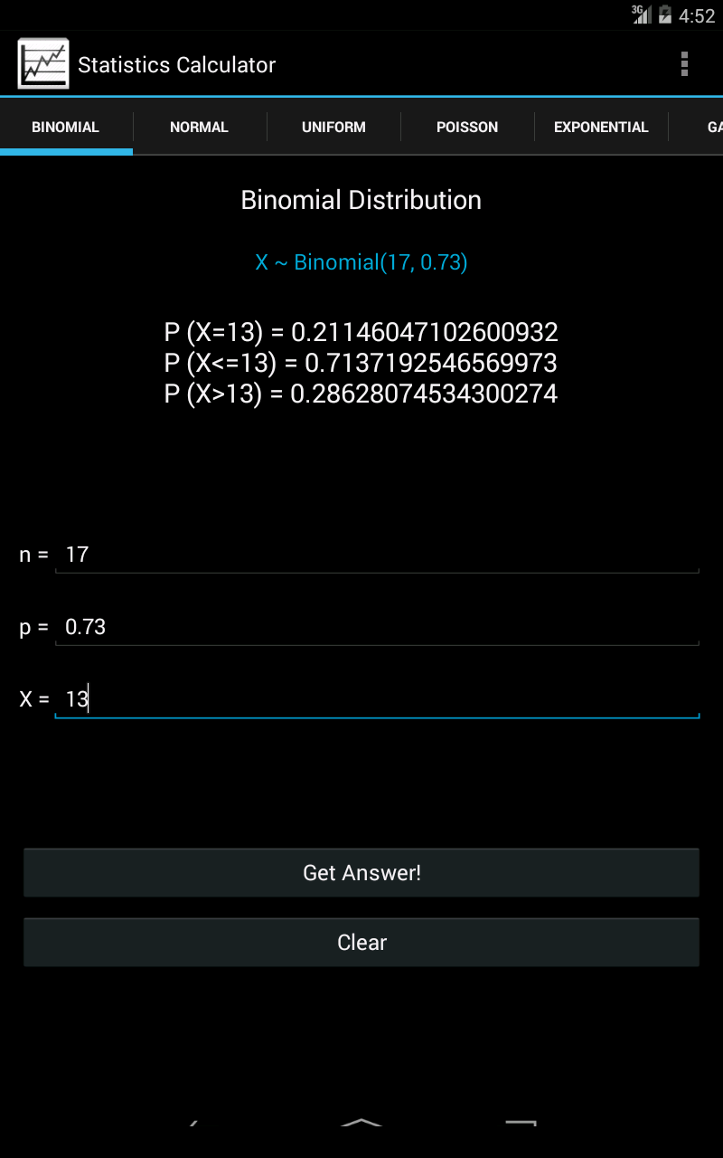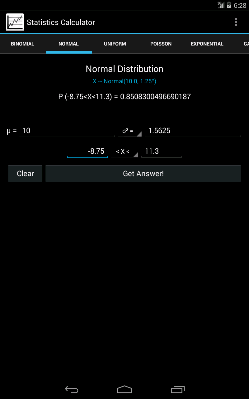 Taking a statistics course in high school or university? Then this is the app you'll definitely be wanting to check your answers. With its rich and easy to use user interface Statistics Calculator will help you find probabilities of random variables which follow certain probability distributions.