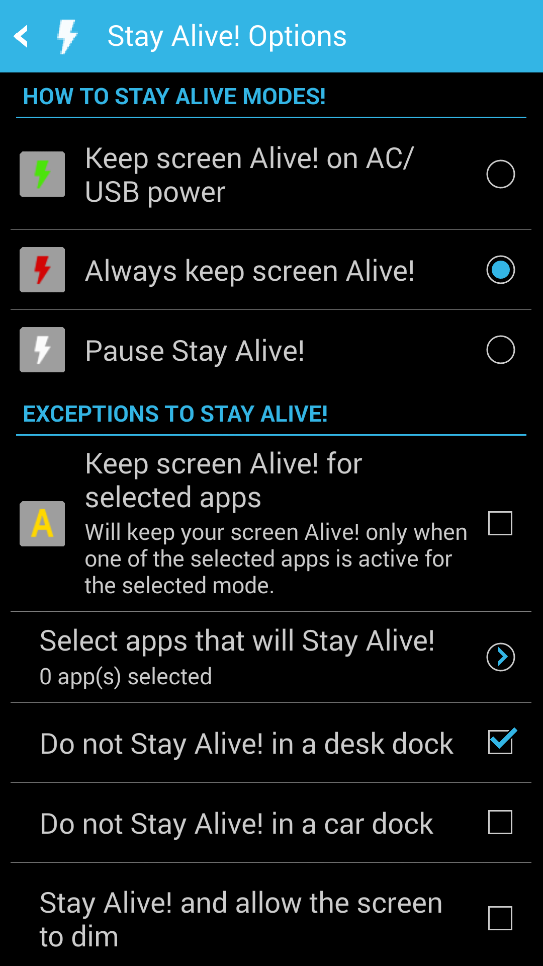 •滞在アライブを防止または許可します!ときにアクティブに画面を暗くします