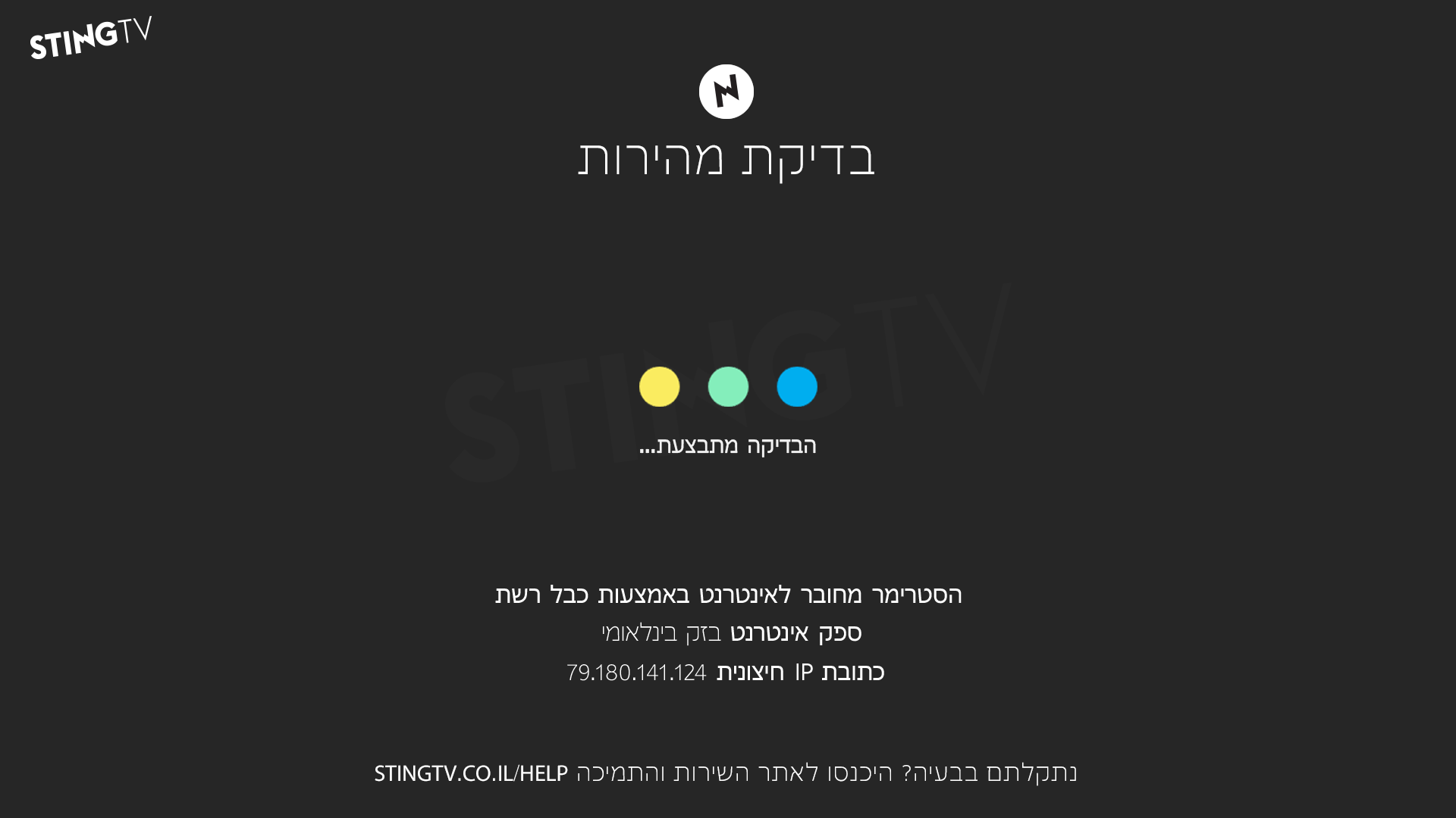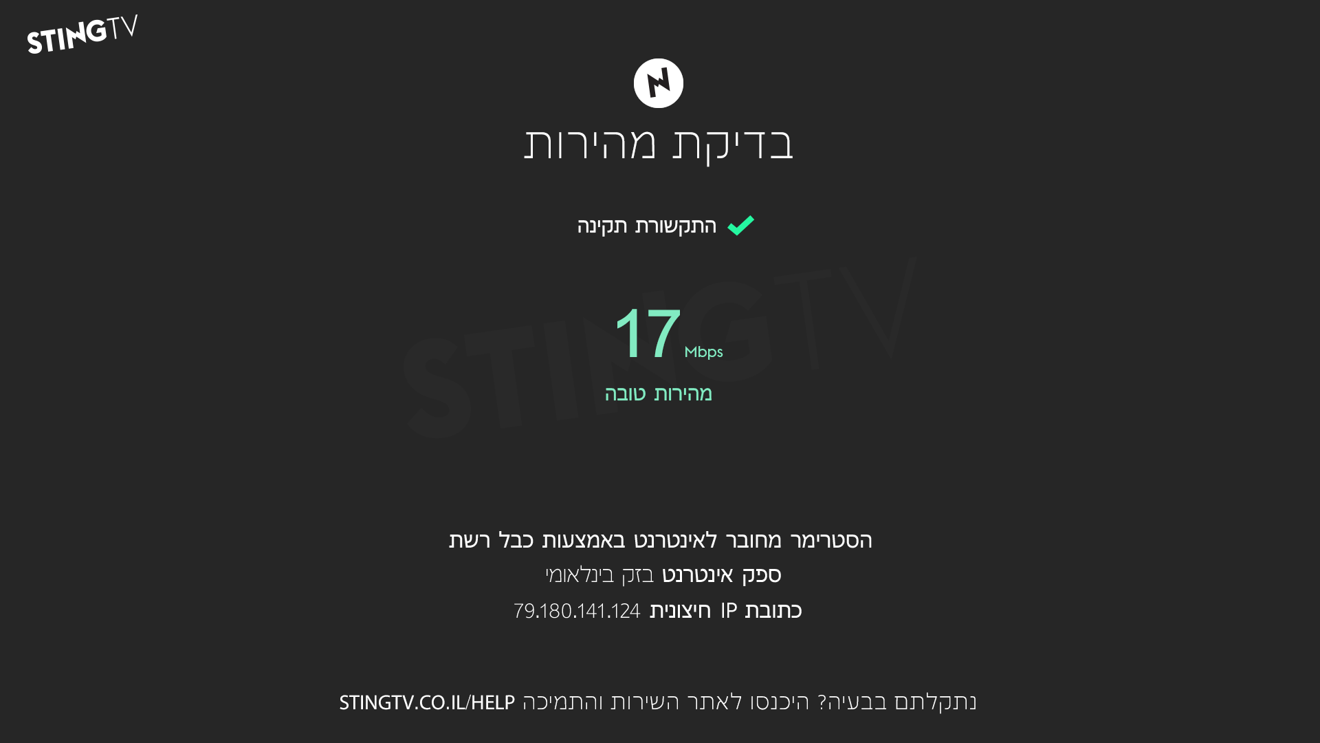 אפליקציית STINGTV בדיקת מהירות בודקת את מהירות הורדת קבצי וידאו וחיבור מכשירה-Android TV לרשת האינטרנט. האפליקציה מציגה את סוג החיבור, האם התקשורת תקינה, מהירות ההורדה, ספק האינטרנט וכתובת ה-IP.