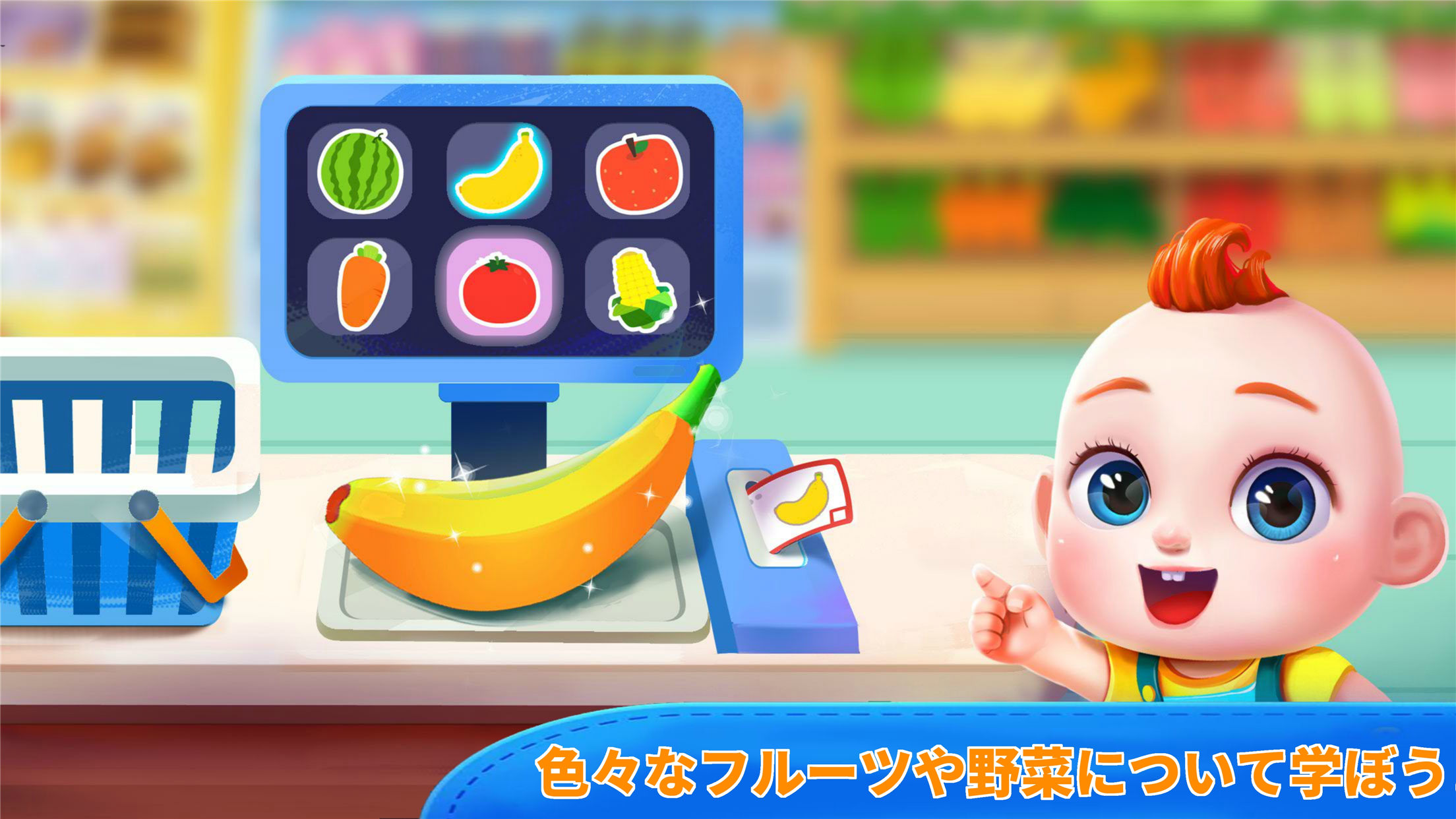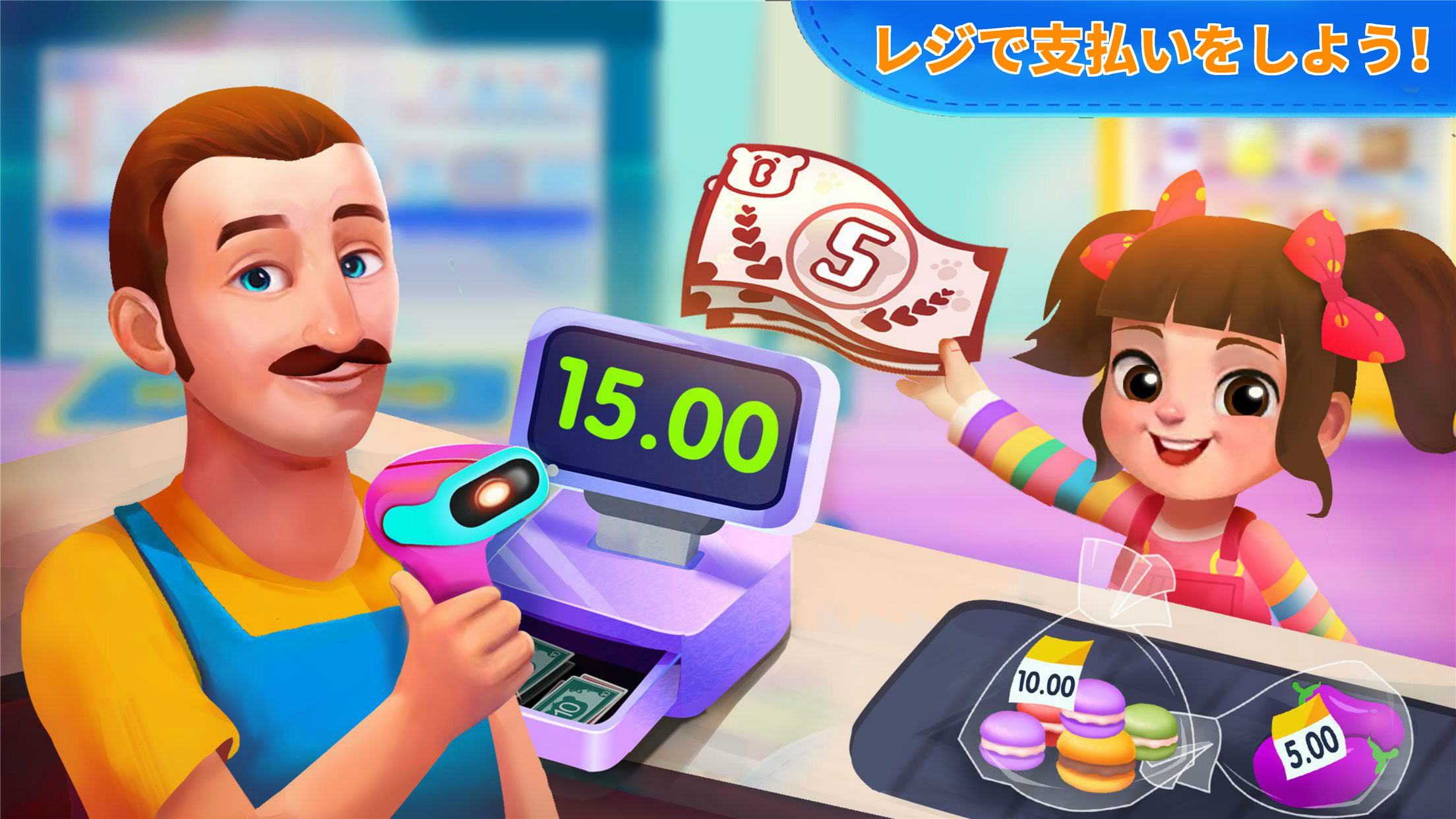 ユニコーンのおもちゃはどこにあるのかな?おもちゃ売り場で、探してみると、見つかるよ!お姉ちゃんが新しい服を買いたいって。洋服売り場で青いお姫様ドレスを試着してもらおう。わ。お姉ちゃん、きれいなお姫様みたい!次はお父さんがスイカを買うよ。野菜売り場に行って、大きなスイカを買い物カゴに入れよう!