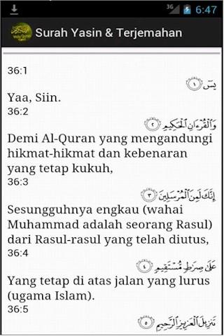 Turn and convert your android phone into Yassin book during kenduri or Islamic ceremony. We are no longer update this apps. Please download the latest version of Yasin & Terjemahan version 2 here. https://play.google.com/store/apps/details?id=gnu.yasinterjemahan.android