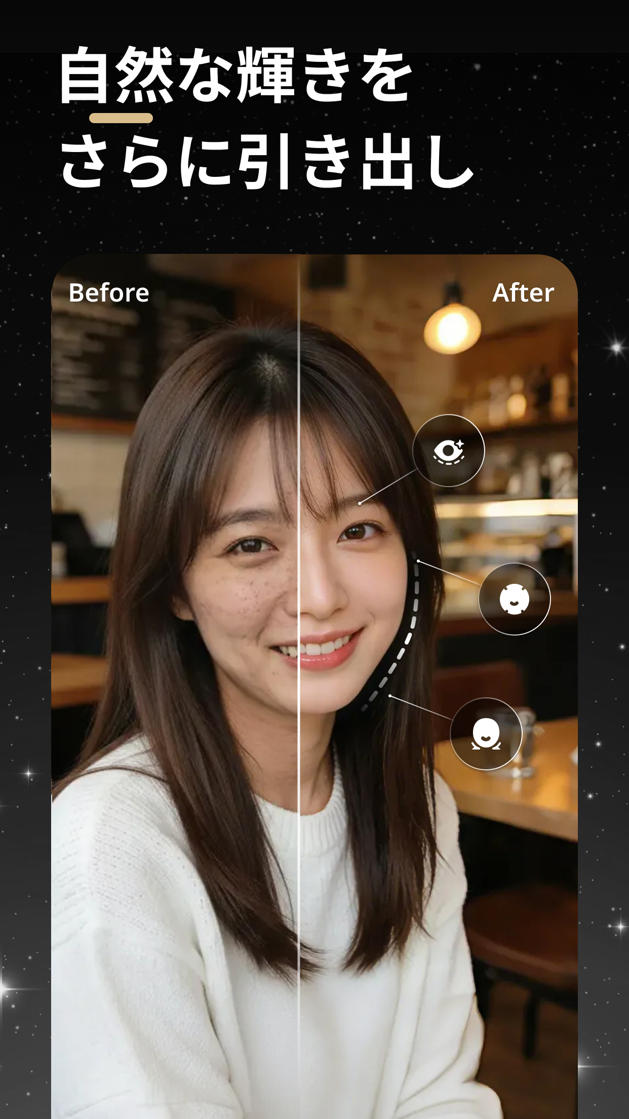• スマート修復:プロ級肌レタッチ・歯のホワイトニング・くま解消・シームレスな形修正
