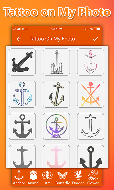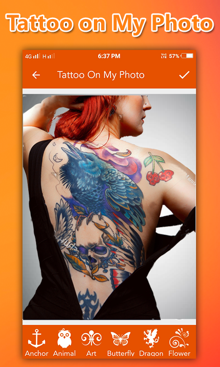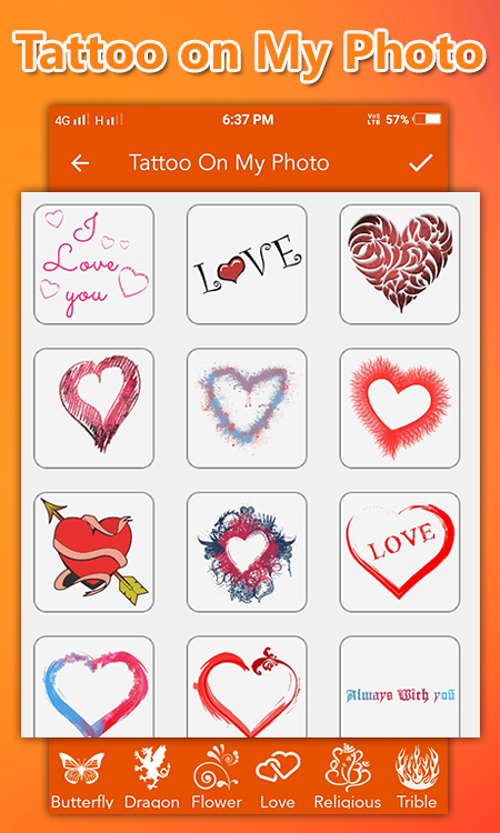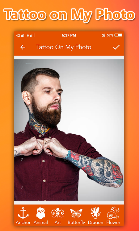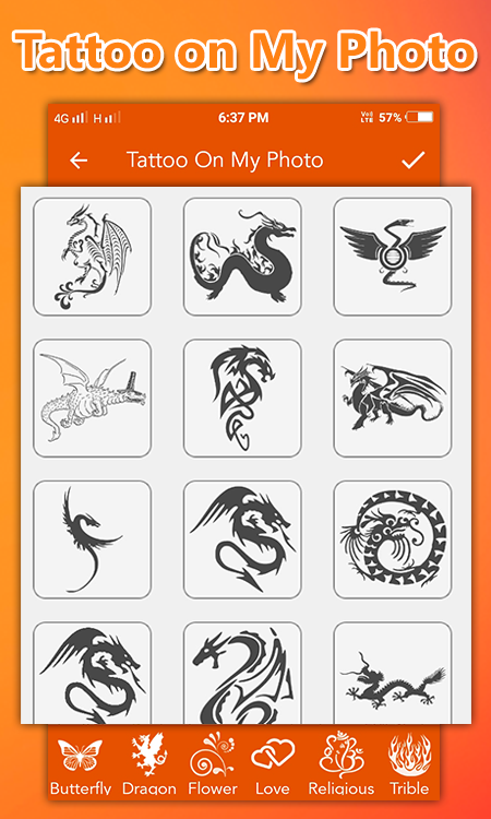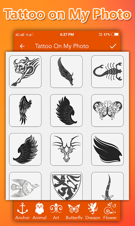 Tattoo Maker Photo Editor is a “tattoo design software” for pic editing with a great number of tattoo sticker designs which you can try on your pics with no effort.
