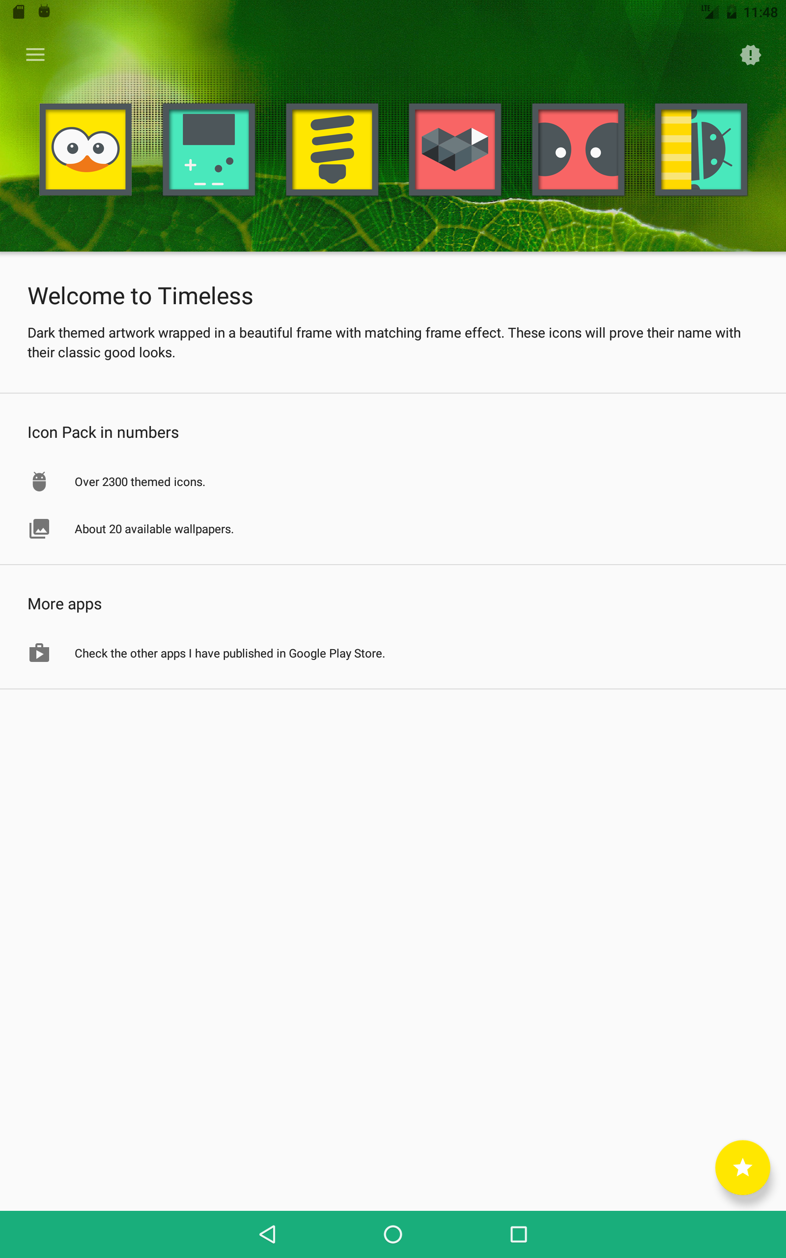 Timelessly simple dark artwork paired with bold accent colors, wrapped in a matching dark frame. Timeless icon pack features a gorgeous color palette consisting of 8 colors. Each icon has simple artwork that uses a fixed dark accent to match the frame of each icon. Bright colored backgrounds and loads of alternatives help make these perfect for your daily driver icon pack. Each icon is made from scratch as vectors on a 512px canvas, and sized down to 192px to ensure no quality loss. You can reach out to me via social media, but please do not use Play Store Reviews or Hangouts as a form of communication. Reviews are meant for prospective buyers to gain insight on the app, not to say what you personally don't like the app or demand a change. I thank you for your support and feedback. For official feedback, suggestions, and app requests, please join my community here: https://goo.gl/1JnF3u Now featuring 2700+ icons Support has ceased for this project, it will receive no further updates Features of this app: over 3000 apps themed Material designed dashboard with bouncing home screen animation Dashboard app with multiple themes including day/night settings Ability to change save location for wallpapers Muzei support Link to my complete Google Play library of personalization apps Many alternative icons labeled alphabetically and in categories Tap on any icon to get the app name Search through icons Dynamic Calendar icon support for many apps 24 wallpapers exclusively designed by myself, Travis hall. 2 KWGT widgets and 2 Komponents(weather icon sets) exclusive to this app. Quick apply section to apply icons to your preferred launcher immediately. FAQ section about the app and icon packs in general. Launchers Supported: *Action Launcher Pro *Action Launcher 3 *ADW *ADW EX *Apex *Atom *Aviate *CM Theme Engine *Go(switch off "icon mask" in Preferences) *Holo *Inspire *KitKat *Lucid *Next *Nine *Nova *Smart *Solo **Unicon, Awesome Icons, and Beautiful Icon Styler apps should work with stock launchers, as well as CM theme engine with this app** **LG Home Launcher may not be compatible. If you're not sure, feel free to do an immediate refund through Google Play, otherwise I can't be responsible for results. Credits to Jahir Fiquitiva for the source code for the dashboard. Google Plus: https://plus.google.com/u/0/+JahirFiquitivaJDev Github for dashboard source code: https://github.com/jahirfiquitiva/IconShowcase-Dashboard Credits to Stu Linden Jr and Amanda Messer for screenshots. For any questions or concerns, please feel free to contact me, and I will respond accordingly. Social Links: Travis Hall Google Plus: https://plus.google.com/u/0/+TravisHall/posts Twitter: https://twitter.com/RippedThemer Dribbble: https://dribbble.com/Travis_Hall
