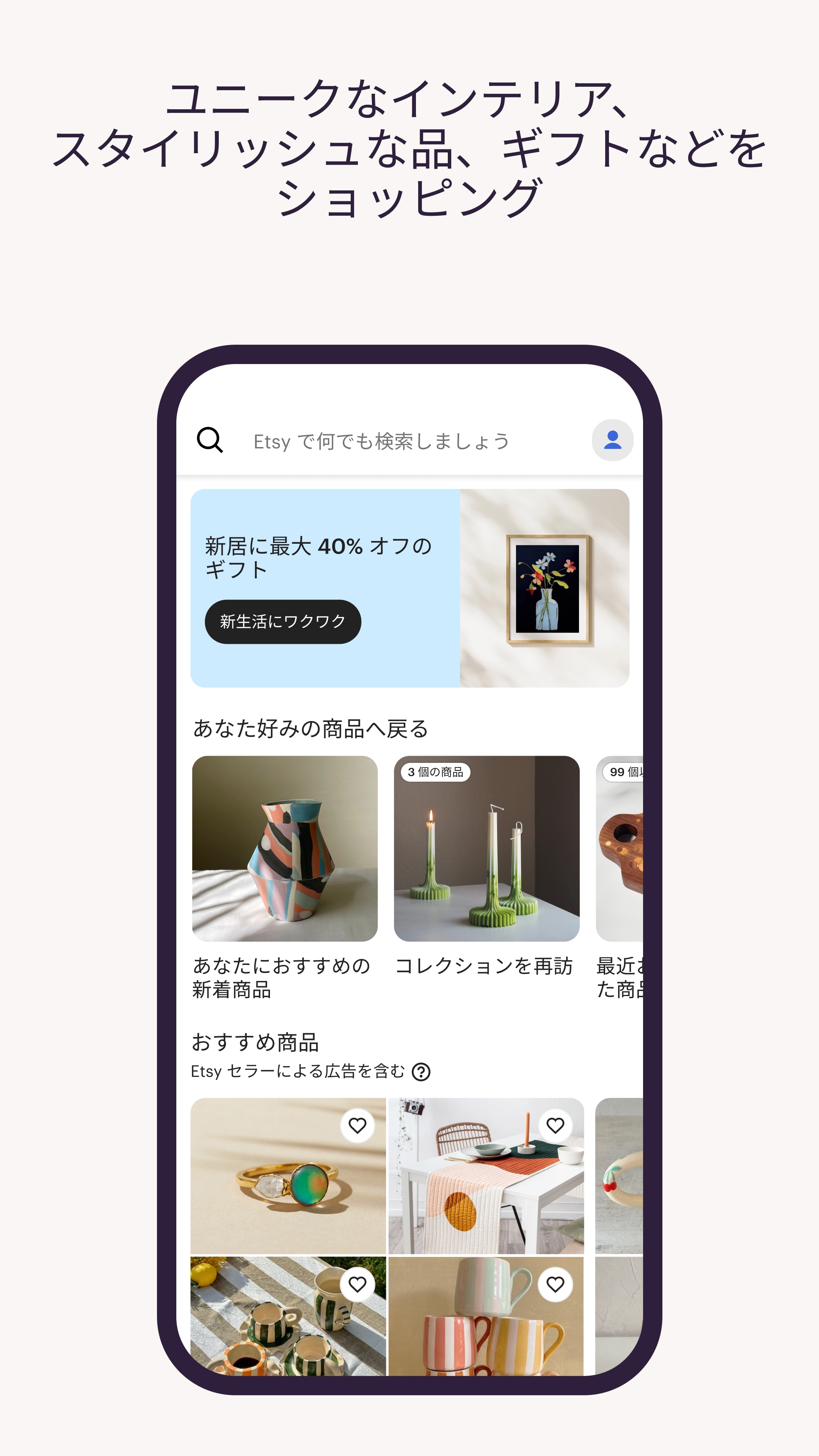 ハンドメイドやビンテージ、その他クリエイティブなグッズが世界中から集まった、Etsy のマーケットプレイスでお買い物してみませんか?