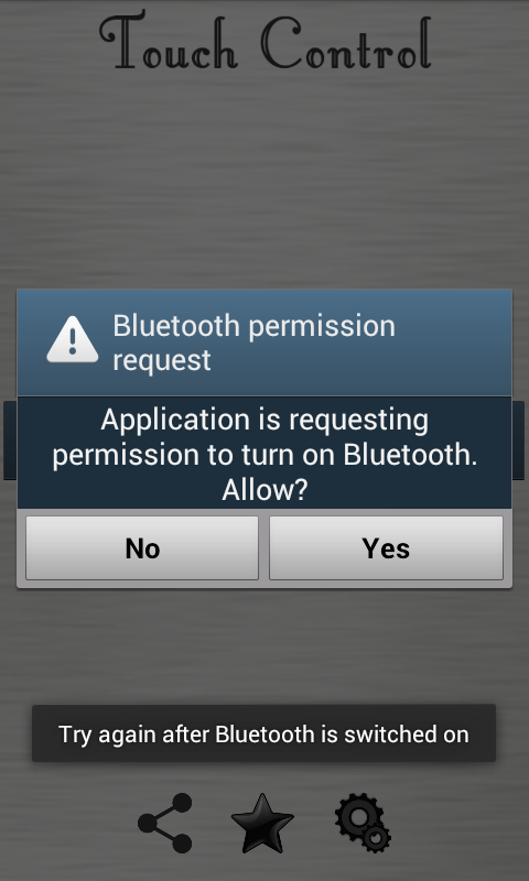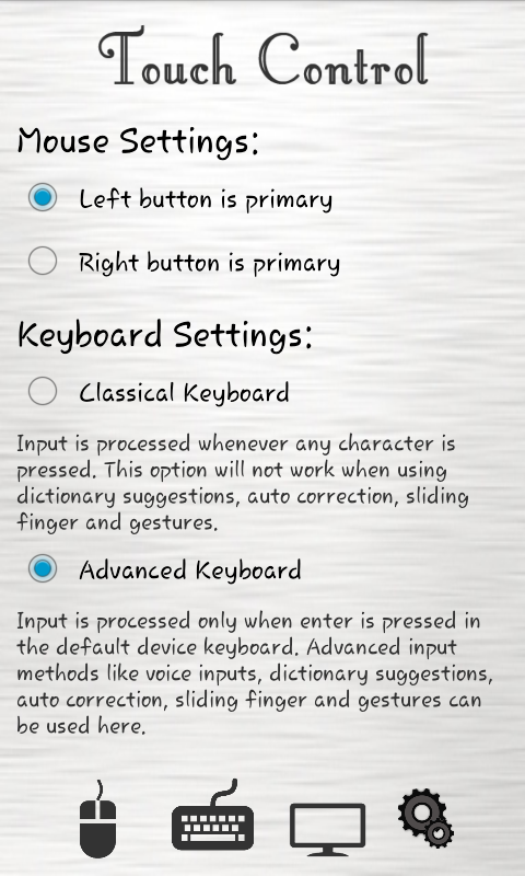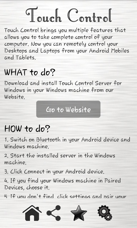 It brings you multiple features that allows you to take complete control of your computer. Now you can remotely control your Desktops and Laptops from your Android Mobiles and Tablets. You can play or pause your videos, browse in the internet, navigate during slide shows and presentation in a much better way. Stay where you are, We bring smarter world to you in smarter ways Important: ★ Download and install Touch Control for Windows in your Windows machine in the below link. (Server) https://sites.google.com/site/touchcontrolandroid/ How to use? ★ Run the server software now installed in your Windows and Start the server ★ Run the Touch Control App in your Android device. ★ Connect your device to the server through Bluetooth Amazing Features ★ Complete Mouse control (Left click, Right click, Double click, Scrolling and Dragging) ★ Most of the Keyboard features are available ★ You can view the Live (current) Screen of your computer in you device. ★ Secured Bluetooth Channel for communication ★ Any time control can be disconnected