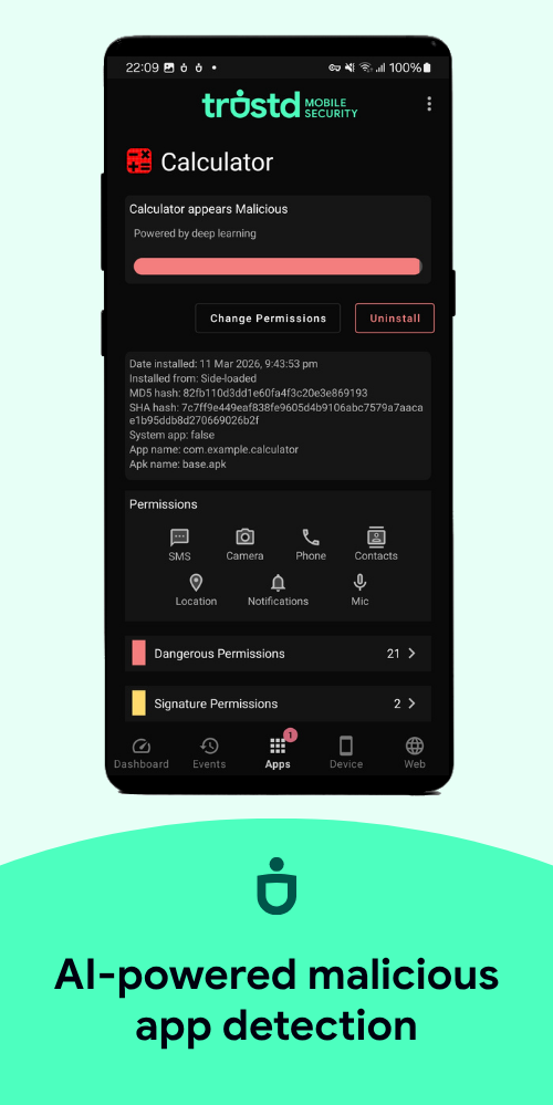 Trustd Mobile Securityは、悪意のあるアプリや危険なWi-Fiネットワークを検知し、詐欺サイトやSMSフィッシング攻撃から保護します。トラッキングなし。広告なし。私たちはあなたのプライバシーを守ります。 +++ Trustd Mobile Securityは、英国のサイバーセキュリティ専門家によって開発された無料のモバイルセキュリティ&プライバシーアプリです。このアプリは、スマートフォン上で不審な動作を検知すると警告を発します。Trustd Mobile SecurityはAIを活用し、最新の悪意のあるアプリの動作、フィッシング詐欺、脆弱なWi-Fiネットワークも検知するため、常にリアルタイムで保護されます。 Trustd Plusのセーフブラウジングについて: Trustd Mobile Securityアプリには、ソーシャルメディア、メール、SMSフィッシング攻撃(スミッシング)に対する基本的な保護機能が無料で含まれています(基本的に、ブラウザを開くリンクをタップした際に保護されます)。しかし、ウェブ閲覧中にすべてのブラウザアプリで常に保護が必要な場合は、Trustd Plusにアップグレードできます。 Trustdモバイルセキュリティの機能: —------------------------------------------------------ ★ 無料のAI搭載モバイルセキュリティで、モバイル端末からの攻撃を防止 ★ アプリスキャナー:デバイスをスキャンして、ストーカーウェア、スパイウェア、その他の悪意のあるアプリを検出 ★ リンクチェッカー:メール、テキストメッセージ、メッセージアプリ、ソーシャルメディアからのフィッシング/詐欺リンクをブロック ★ Wi-Fiスキャナー:安全でないWi-Fiネットワークに接続した際に即座に警告 ★ デバイスチェッカー:Androidソフトウェアが最新で脆弱性がないかチェック ★ 安心:お客様の行動を追跡しません ★ 権限の悪用からプライバシーを保護:アプリがカメラ、マイクへのアクセス、スクリーンショットの撮影、通話の録音を試みた場合に通知 新登場 Trustd Plus [サブスクリプション制]: —------------------------------------------------------ 上記の基本保護機能に加え、以下の機能も搭載 ★ セーフブラウジング:あらゆるブラウザアプリから安全にウェブを閲覧できます。デバイス上のVPN保護技術により、データ窃盗やマルウェアの設置を目的とした悪意のあるウェブサイトにアクセスした場合、それを検知、ブロックし、警告を発します。 ★ 許可されたウェブサイトの管理:信頼できるウェブサイトをセーフリストに追加できます。 Trustd Mobile Securityが他と違う理由 —------------------------------------- ★ すべての主要機能は完全無料、広告も一切ありません。 ★ Trustd Mobile SecurityはAIを活用し、他のセキュリティアプリよりも早く悪意のあるアプリを検出します。 ★ 個々のユーザーを追跡せず、アカウントも不要です。 ★ 透明性と誠実さが私たちのモットーです!お客様のプライバシーとセキュリティを最優先に考えています。 ★ アクセシビリティサービス(悪用される可能性のあるサービス)へのアクセスは不要です。 ★ 私たちはストーカーウェア撲滅連合(Coalition Against Stalkerware)のメンバーであり、ストーカーウェア撲滅に向けた連合の活動を支援するために研究成果を提供しています。 アドバイスやサポートについては、ウェブサイト(https://traced.app)をご覧ください。 アプリをより良いものにするために、皆様からのフィードバックをお待ちしております。 +++ Trustd Mobile Securityについて Trustd Mobile Securityは、英国のサイバーセキュリティ専門家によって開発された無料のモバイルセキュリティおよびプライバシーアプリです。このアプリは、お使いのスマートフォンで不審な動作が検出された際に警告を発します。Trustd Mobile SecurityはAIを活用し、最新の悪意のあるアプリの動作、フィッシング詐欺、脆弱なWi-Fiネットワークなども検知するため、常にリアルタイムで保護されます。 +++ プライバシーポリシー Traced Ltdは、お客様のプライバシーを尊重し、個人データの保護をお約束します。詳細については、https://traced.app/traced-privacy-policy/ をご覧ください。