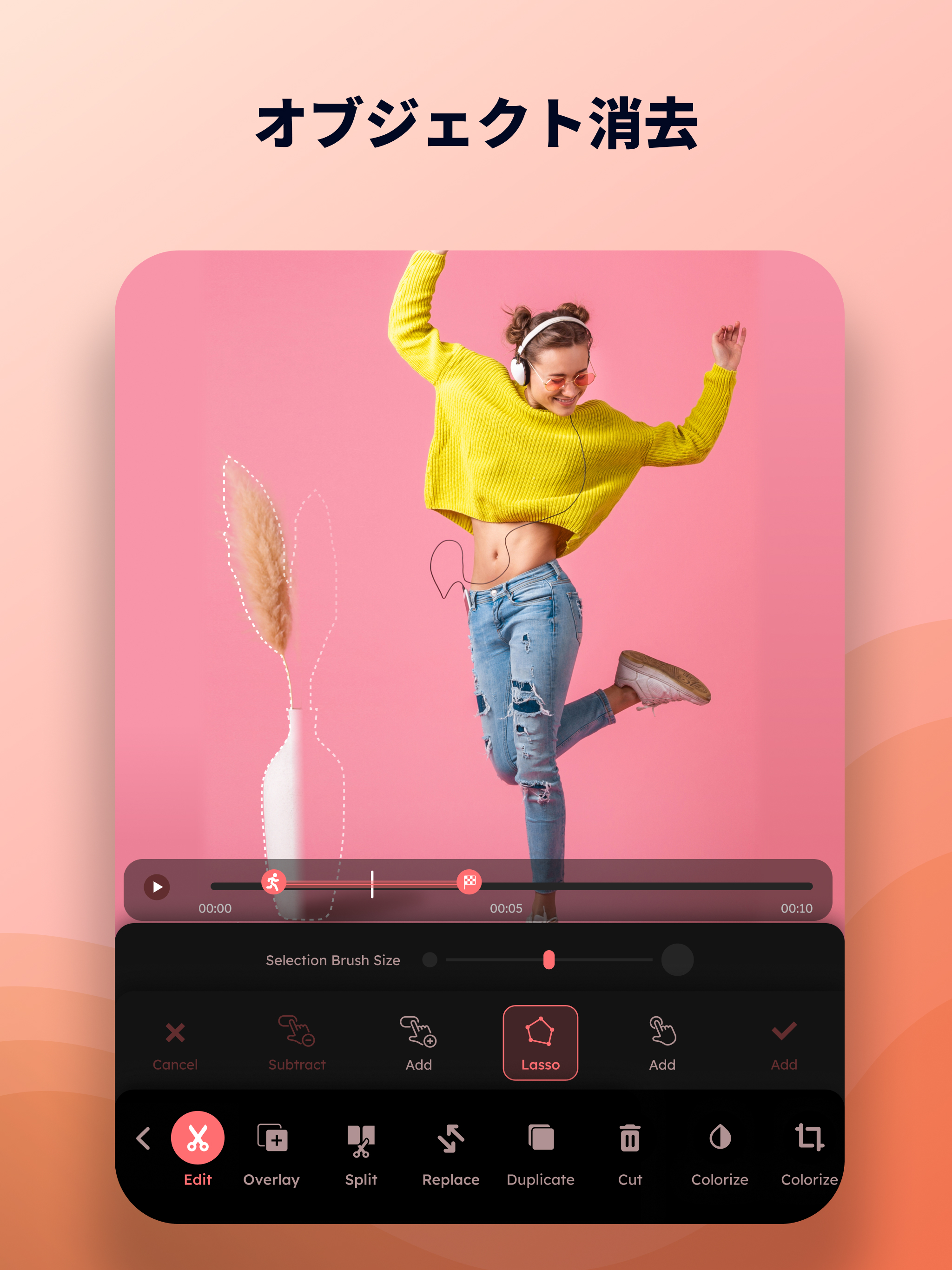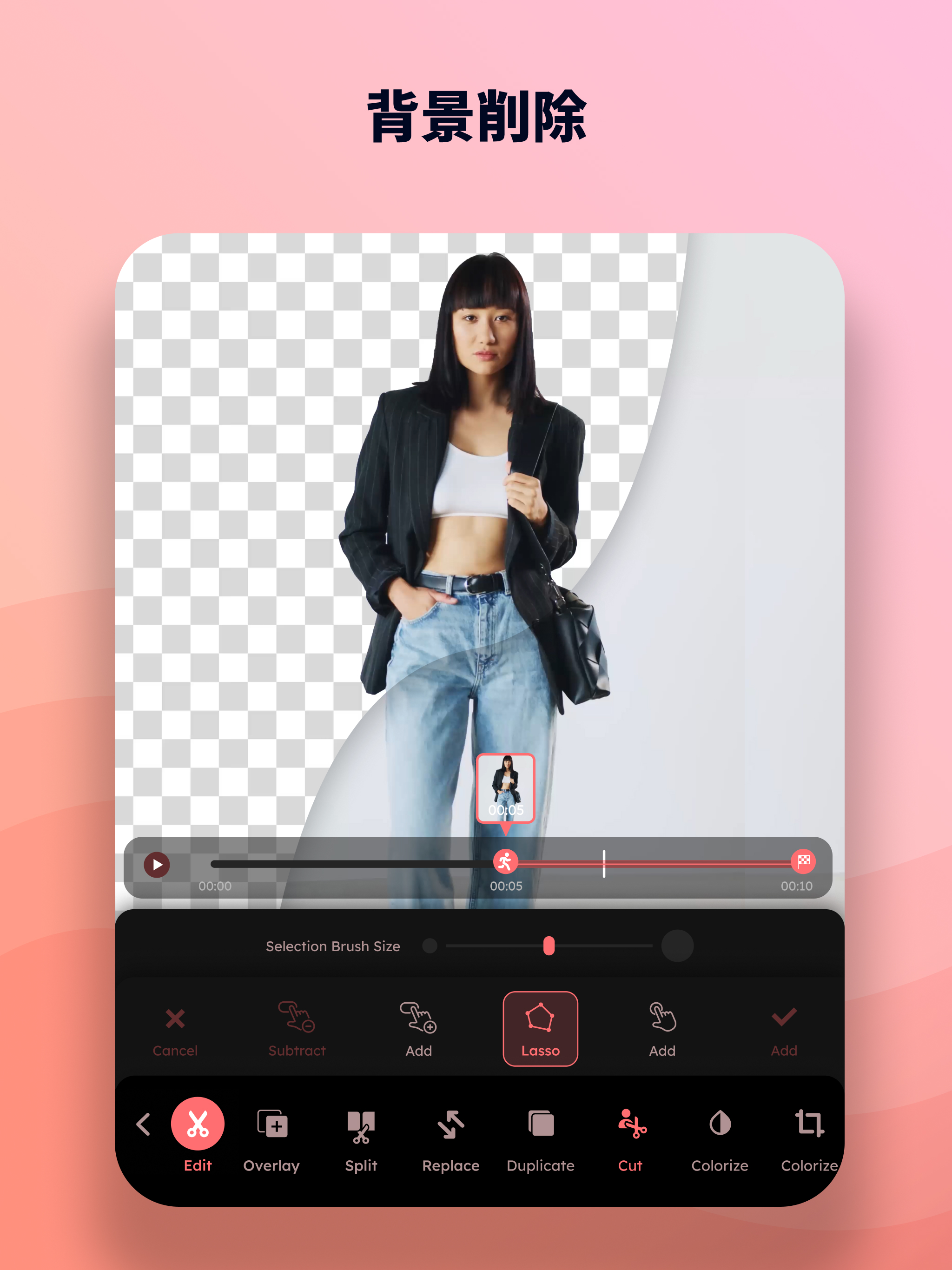 ビデオの背景をAIで自動除去し、被写体だけを美しく抽出します。動画から写真を取り出す機能も備えており、お気に入りのフレームを静止画として保存可能。切り抜いた被写体を新しい背景と合成する写真動画の作成にも対応しています。グリーンスクリーンがなくても、被写体の切り出しから合成まで、プロレベルの映像制作がスマートフォン一台で完結します。