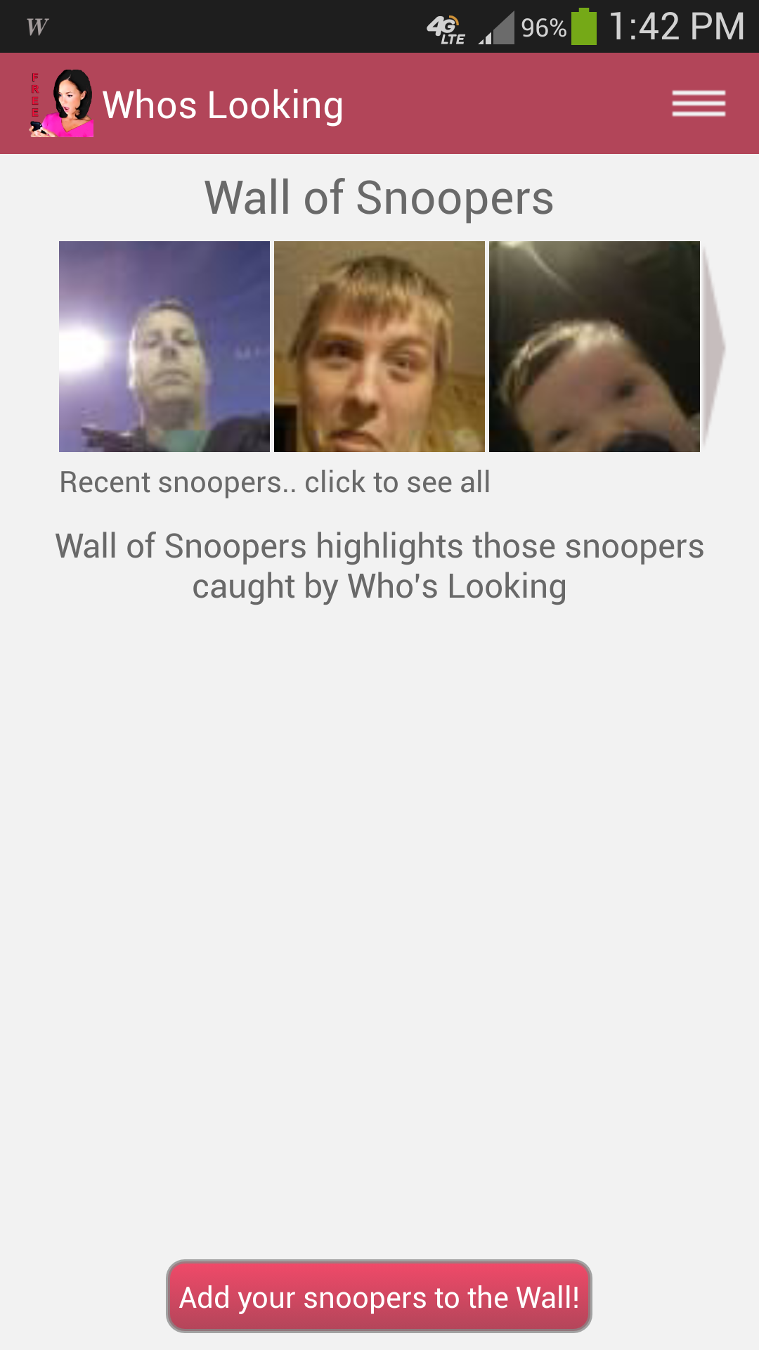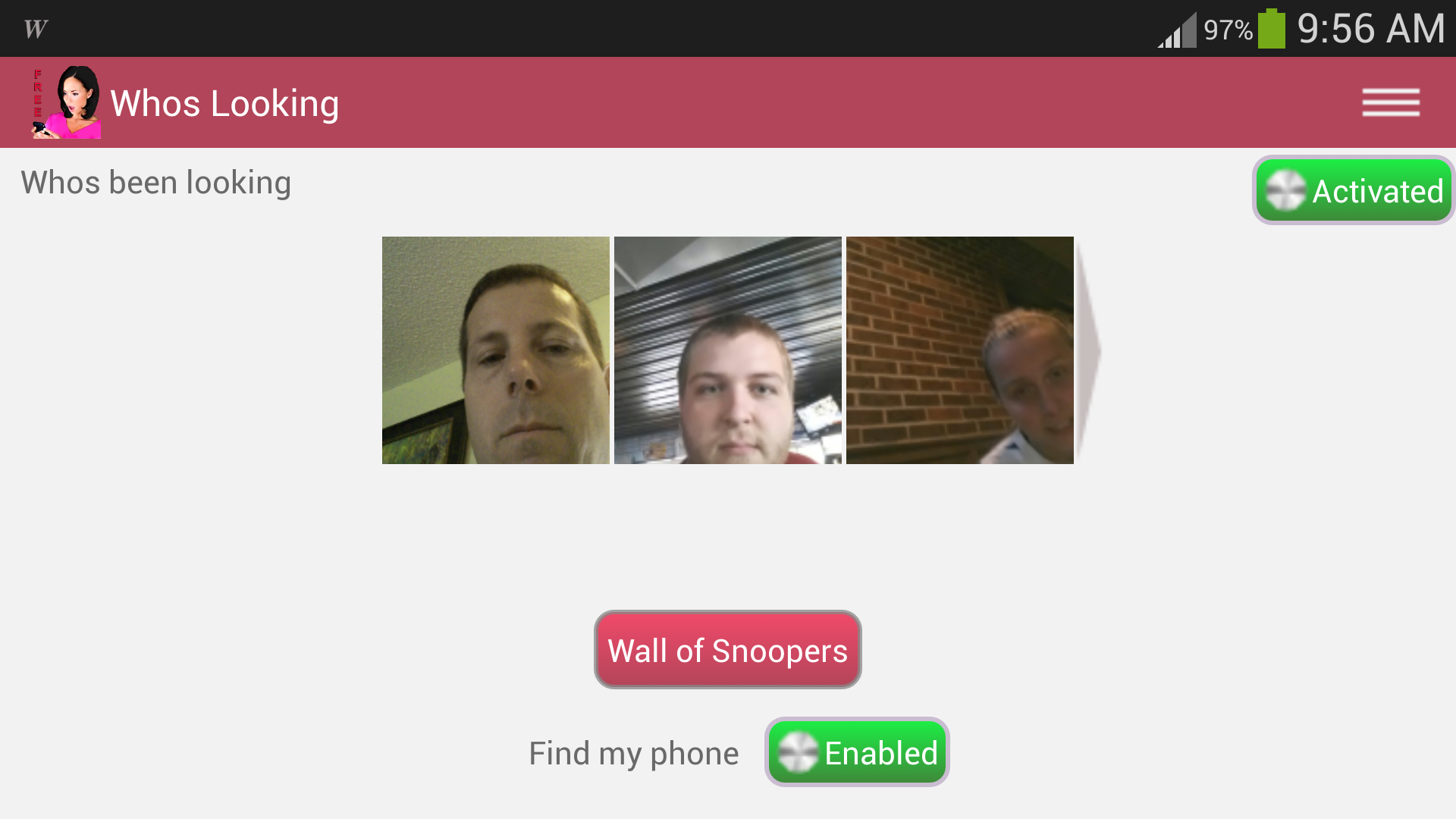 Protect your phone or tablet when it is unattended, lost or stolen! Who’s Looking is the best and easiest to use security app to protect your device and your loved ones. Its anti-theft protection and find your lost device features are outstanding! Want to know who stole your device? Want to capture the intruder’s selfie Want to find your lost or misplaced device? Want to know if your spouse is using your device? Then Who’s Looking is your choice to find and protect your phone or tablet! Languages:English, Spanish, Arabic, French, Chinese OUTSTANDING FEATURES TO PROTECT YOUR DEVICE ★ Capture the intruder's selfie when they try to unlock your phone or tablet ★ Photos only show in the app not in your device gallery ★ Remote action commands to help you locate your lost or misplaced device by sending a Text/SMS ★ Cloud Locate - Send action commands from our website ★ Capture phone access. Don’t want to have a screen lock but want to see who is using your phone? Who's Looking can log when your phone wakes and track how long they viewed your phone. ★ Get Email with location and pictures of your lost phone or tablet ★ Wall of Snoopers - share with others who is looking at your device ★ Stealth Mode turns off action command notifications so thief does not know your tracking them (Pro Version) Upgrade to Pro and have the picture with time stamp and location (Google map link) of the unlock attempt emailed to you. Most common uses: finding who stole your phone, find lost phone, find lost tablet, tracking a family member, locating each other on trips, avoid getting lost on trips or events, locating of husband/wife (spouse tracking), locating of children/kids, tracking kids on trips/daily activities such as going to the mall, or get peace of mind when traveling knowing you can find your phone or tablet if lost or stolen This app uses the Device Administrator permission.