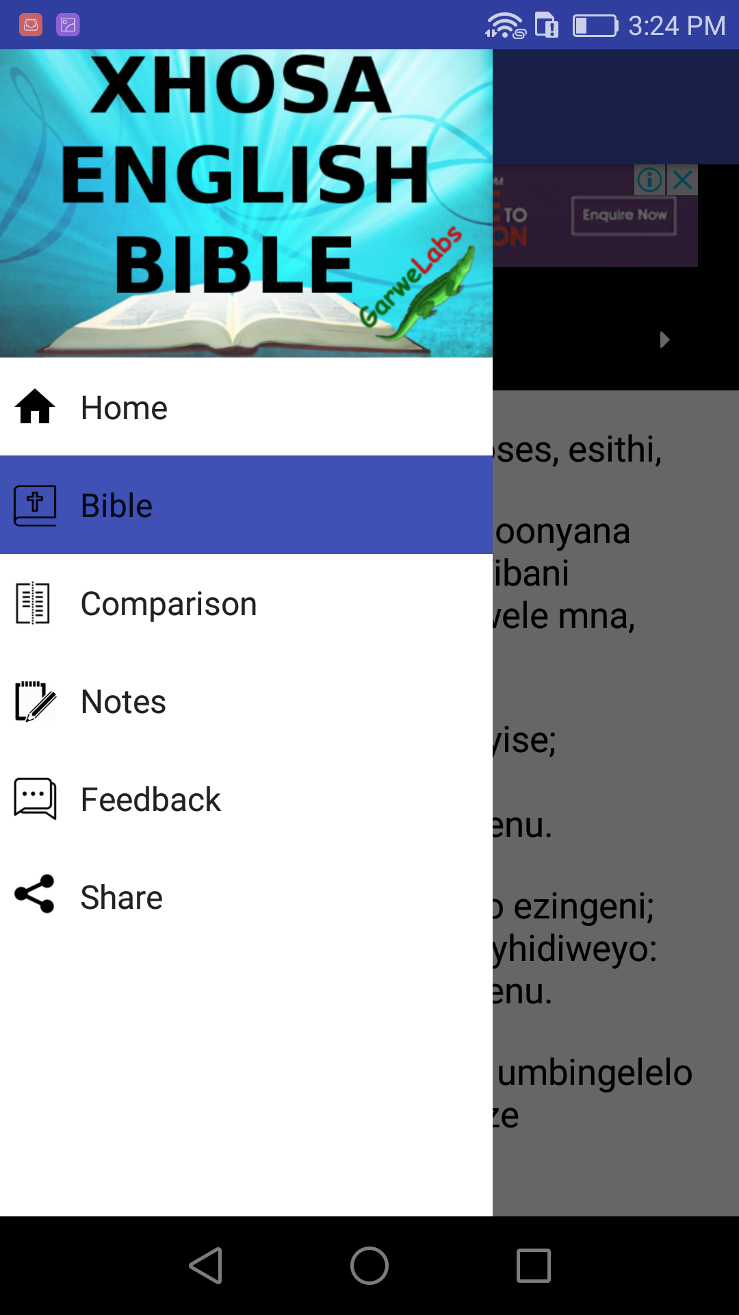 The Holy Bible in Xhosa and English (NIV / ESV) This is a FREE Xhosa / English Bible for both Xhosa and English speaking people. It is the best bible's application in Xhosa / English Language. It contains both Old and New Testament books. The Bible is fully offline and ready to use even when data connectivity is unavailable. Garwe Labs is commited to putting a bible in every phone so that all the people in the world may be converted and become disciples of Jesus Christ and members of His Body. Spread the word by sharing the app. God bless you. - Simple to use - View translation easily - Easily write notes - Search function for easy navigation - No Internet connection needed