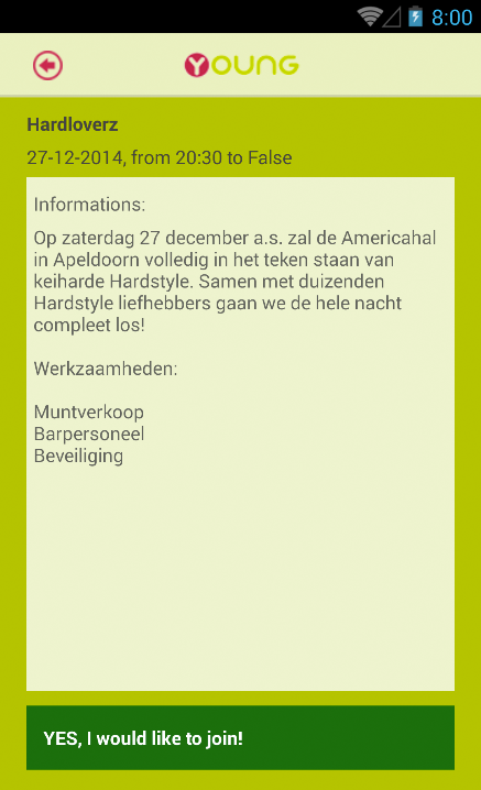 YOUNG richt zich nadrukkelijk op horeca & promotie werk, onder andere tijdens grote evenementen & festivals in binnen- en buitenland! Daarnaast werken we op maat voor kleine en grote middenstanders, van Supermarkt tot Transport! Via deze app kunnen ingeschreven medewerkers zich rechtstreeks aanmelden voor verschillende evenementen. YOUNG Uitzendbureau - YOUNG Uitzenden - MY YOUNG