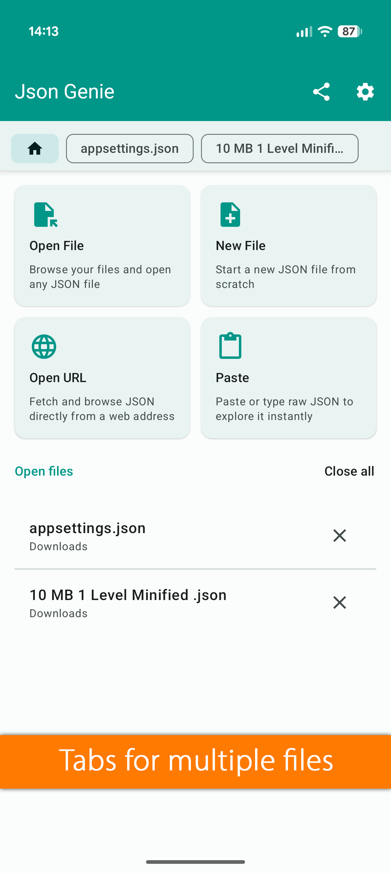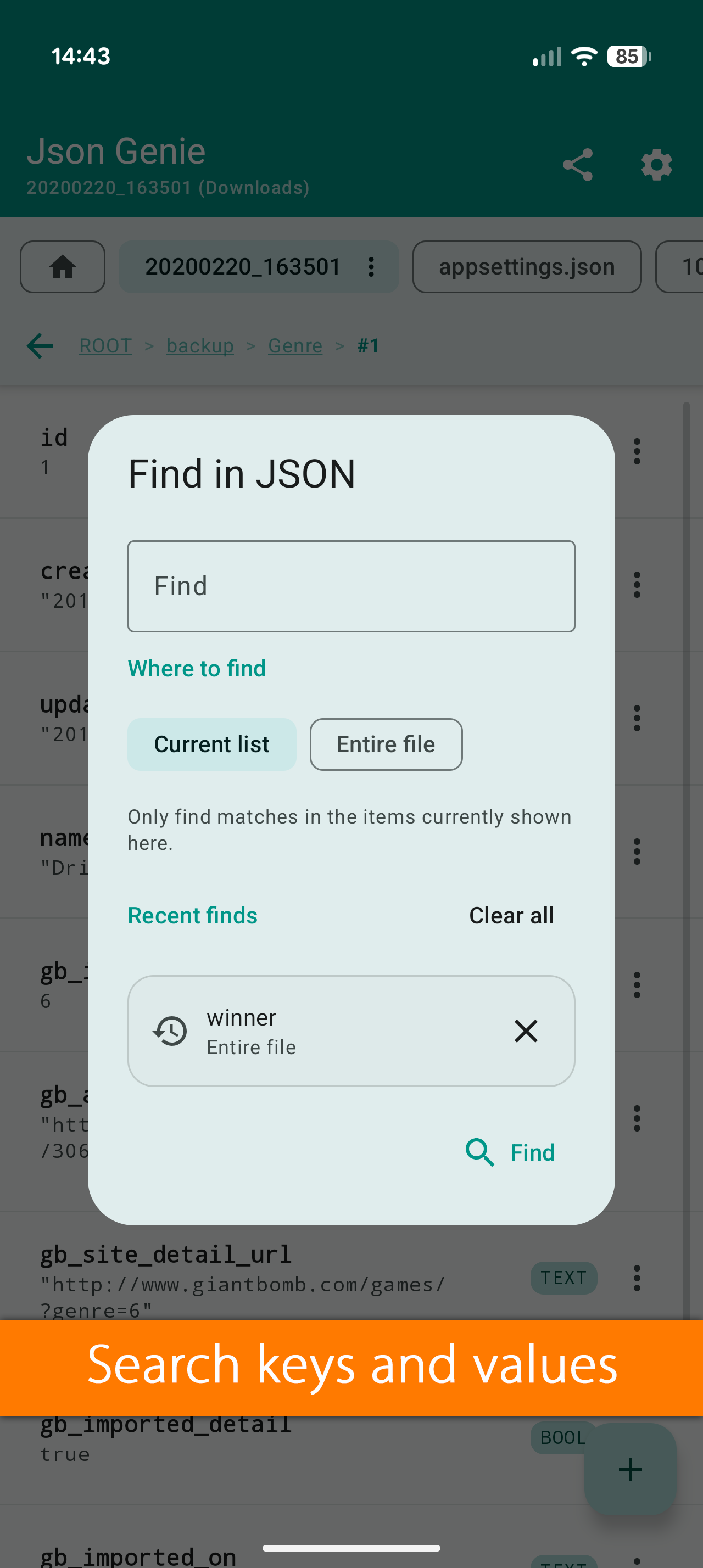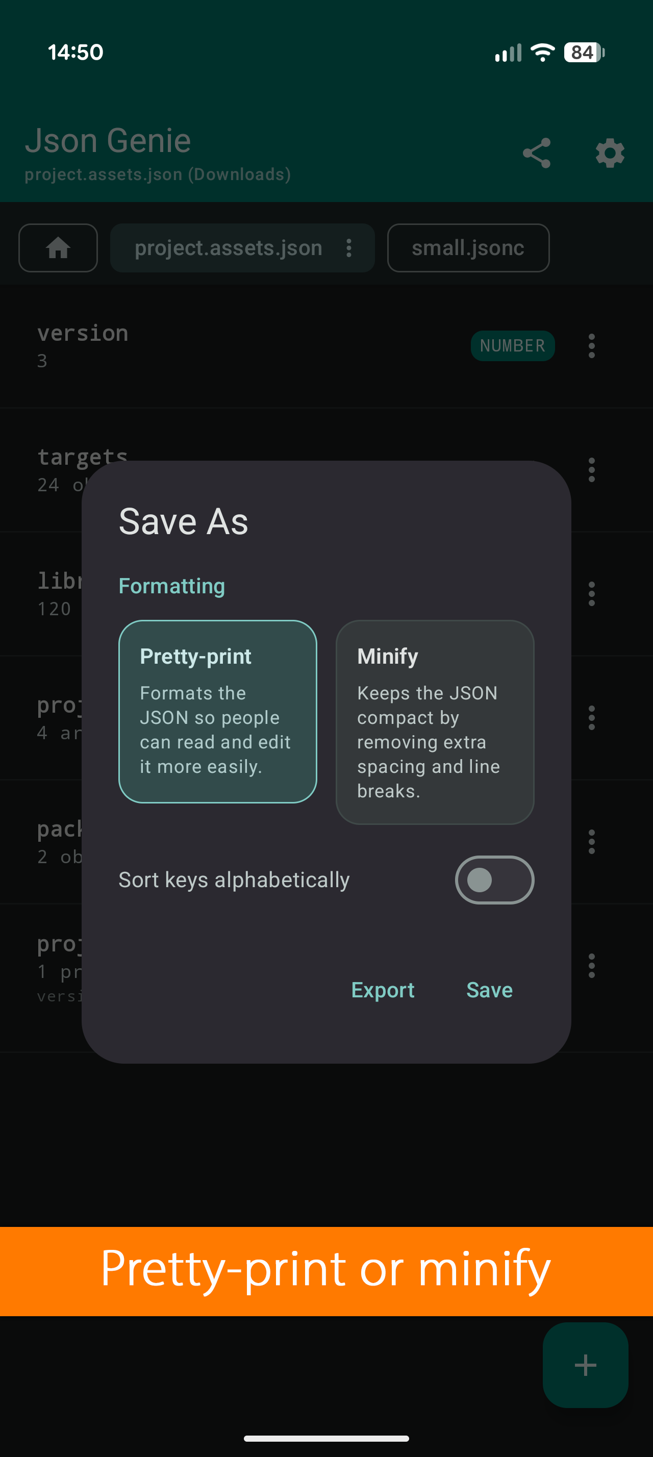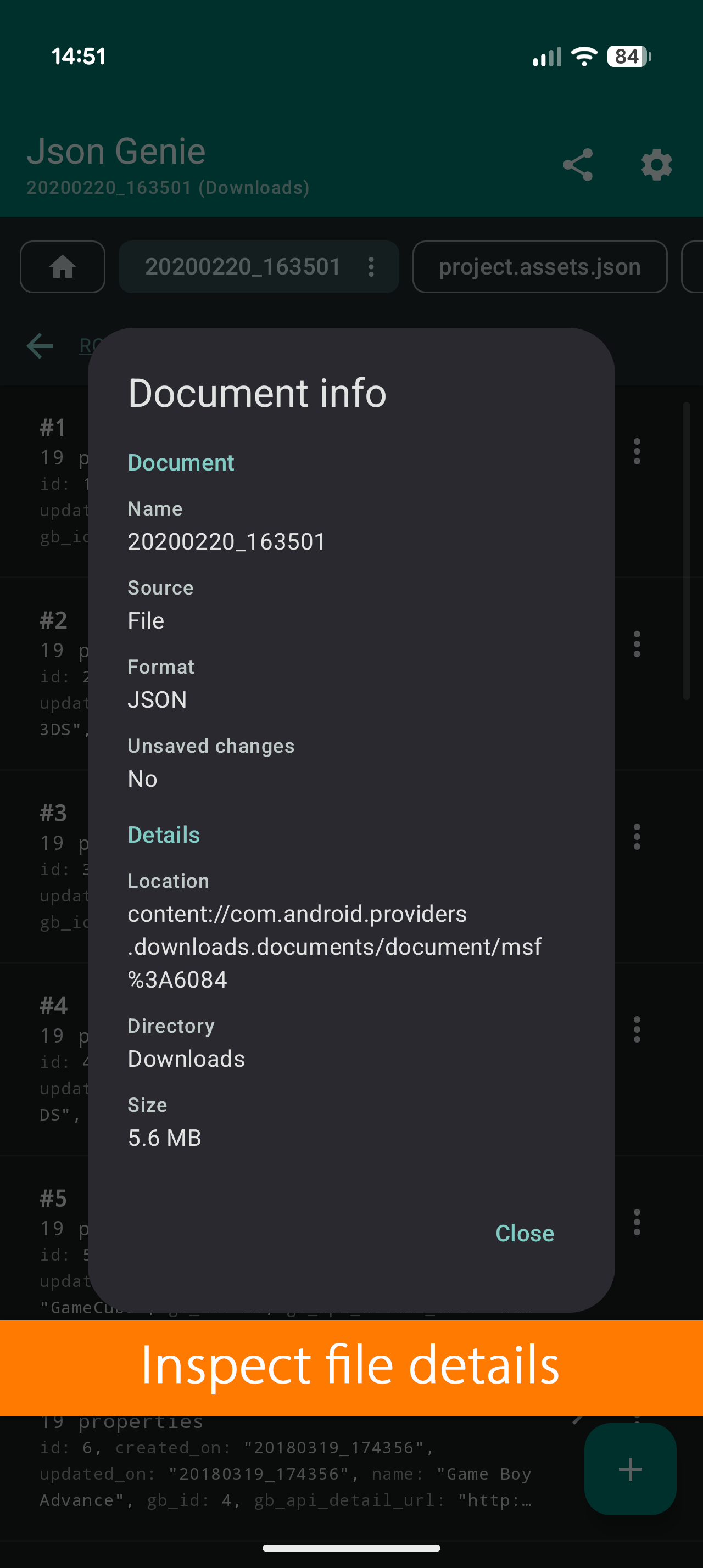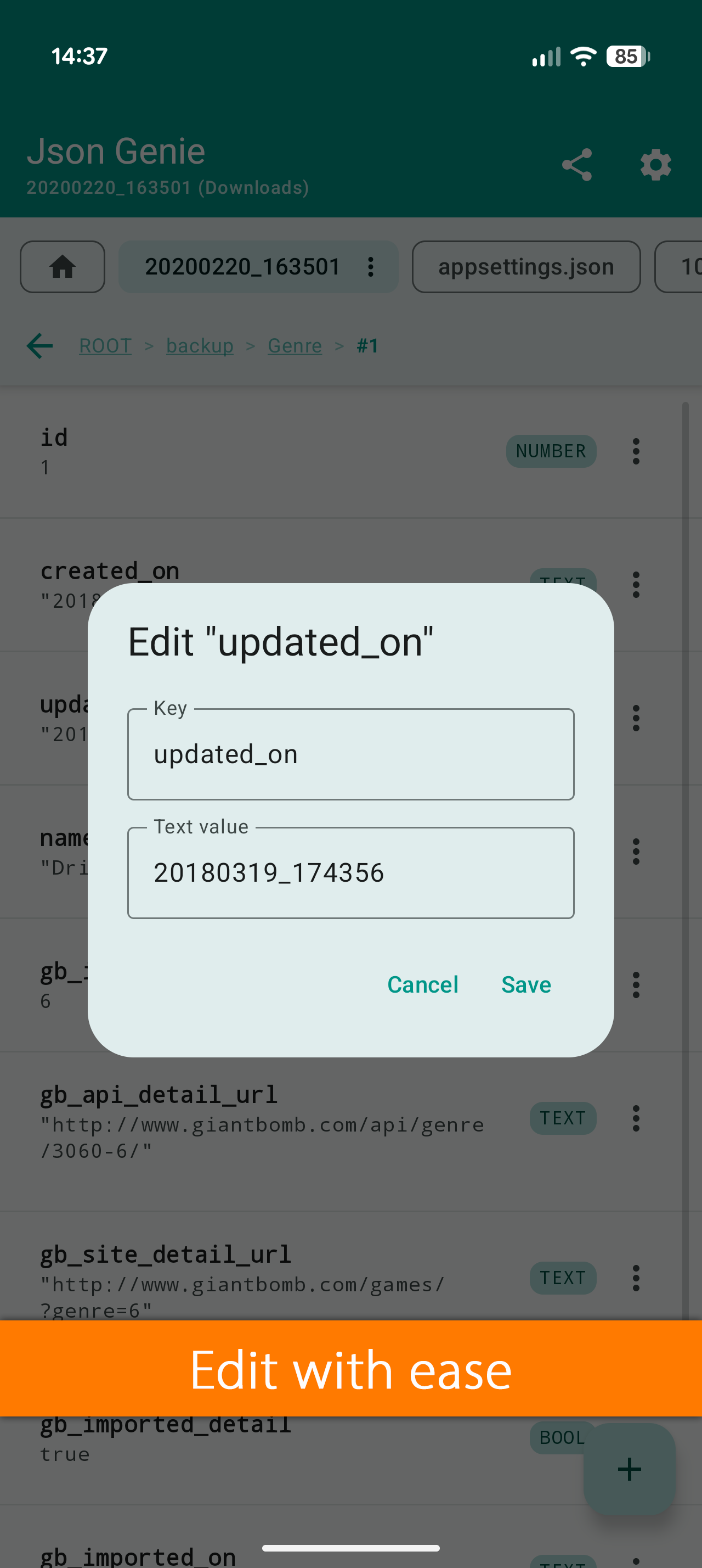 Json Genie helps you open, read, understand, edit, and share JSON files on Android in a faster and more comfortable way.